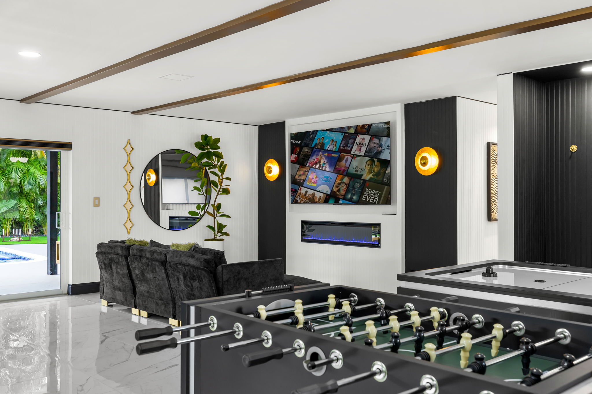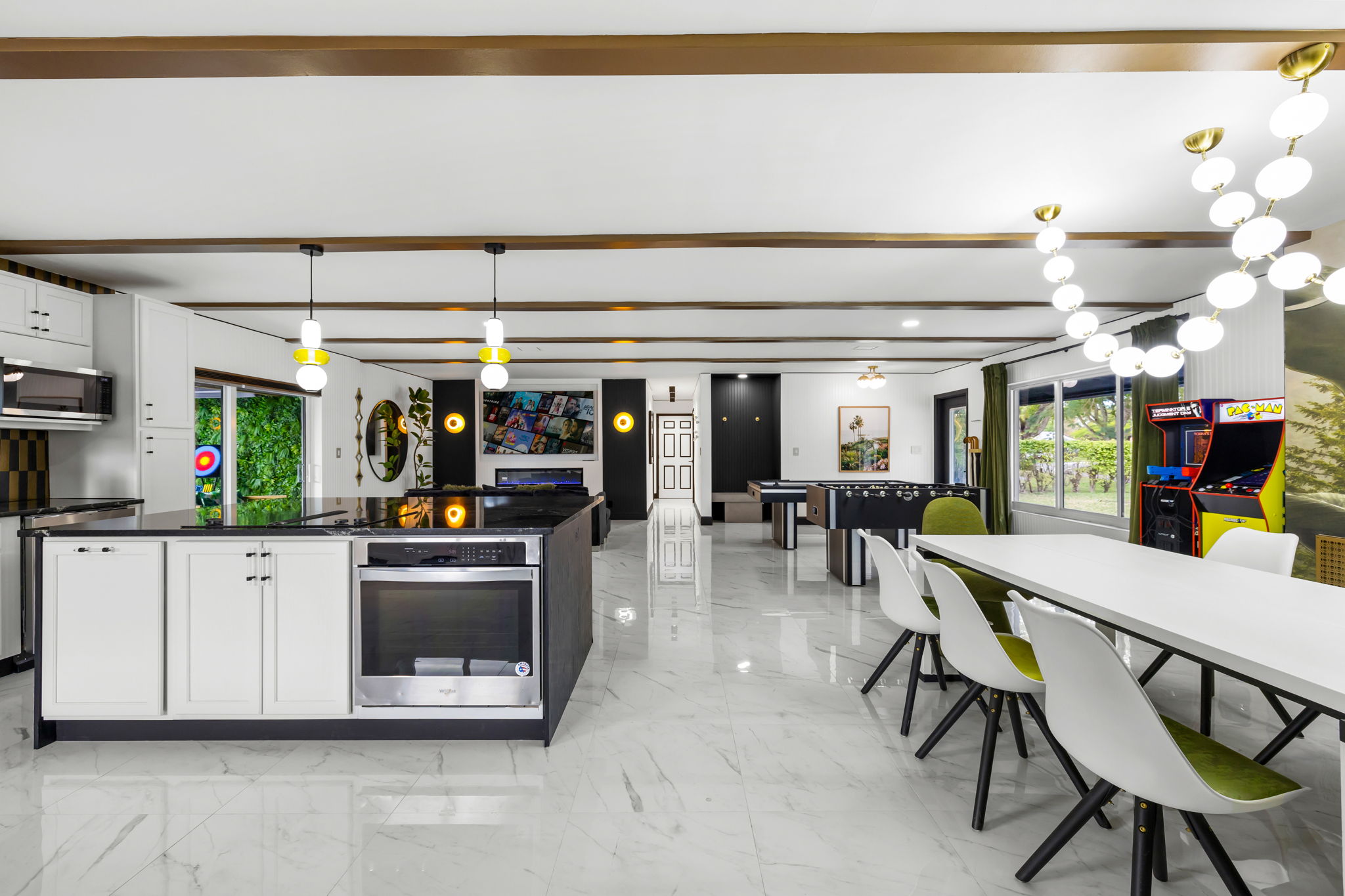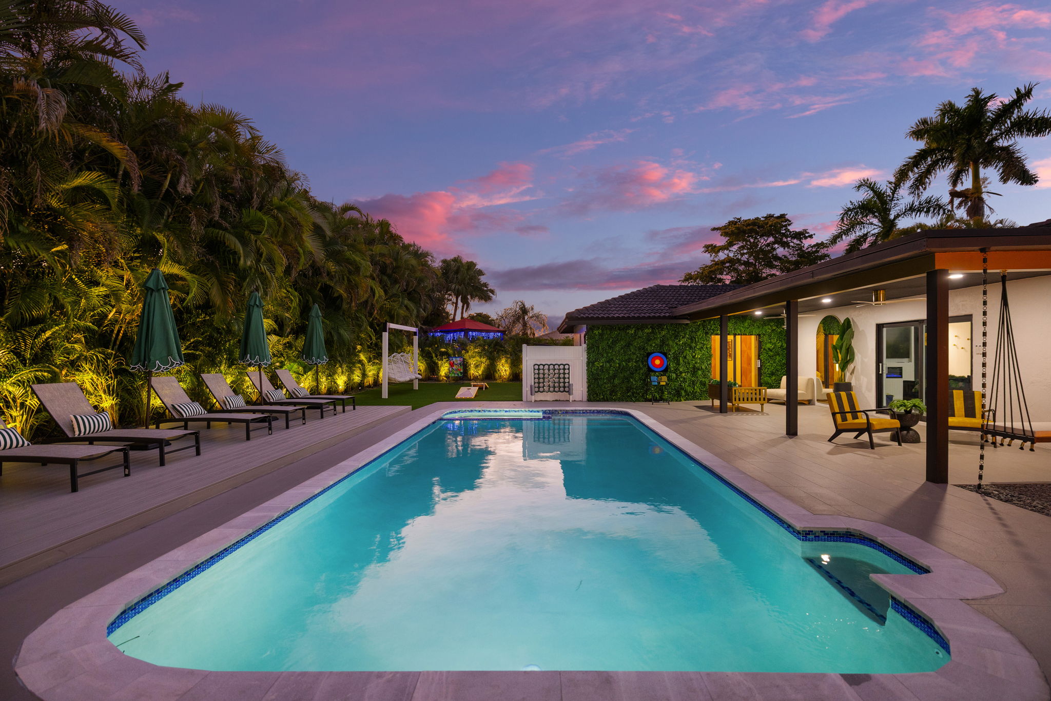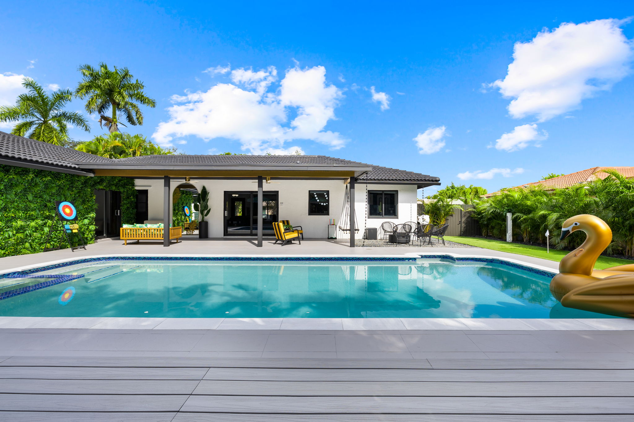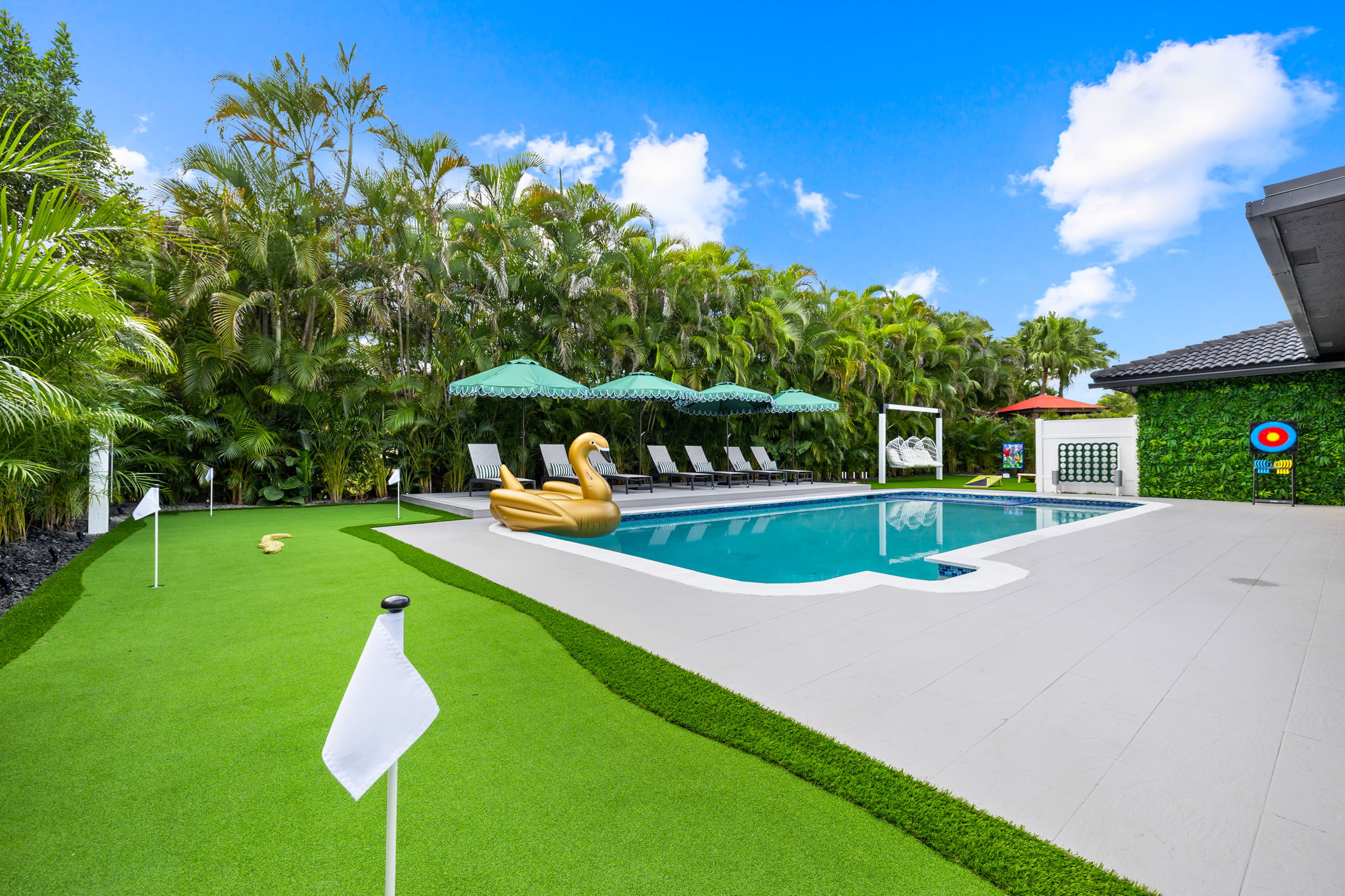 Entertainment options abound, making this property an ideal gathering spot. The living area includes impressive 85-inch televisions, while the resort-style backyard features a heated pool, hot tub, outdoor fire pit, and barbecue area. For added fun, a mini-golf setup and premium artificial turf offer low-maintenance convenience. The home comfortably accommodates up to 12 guests, making it perfect for families or social gatherings.