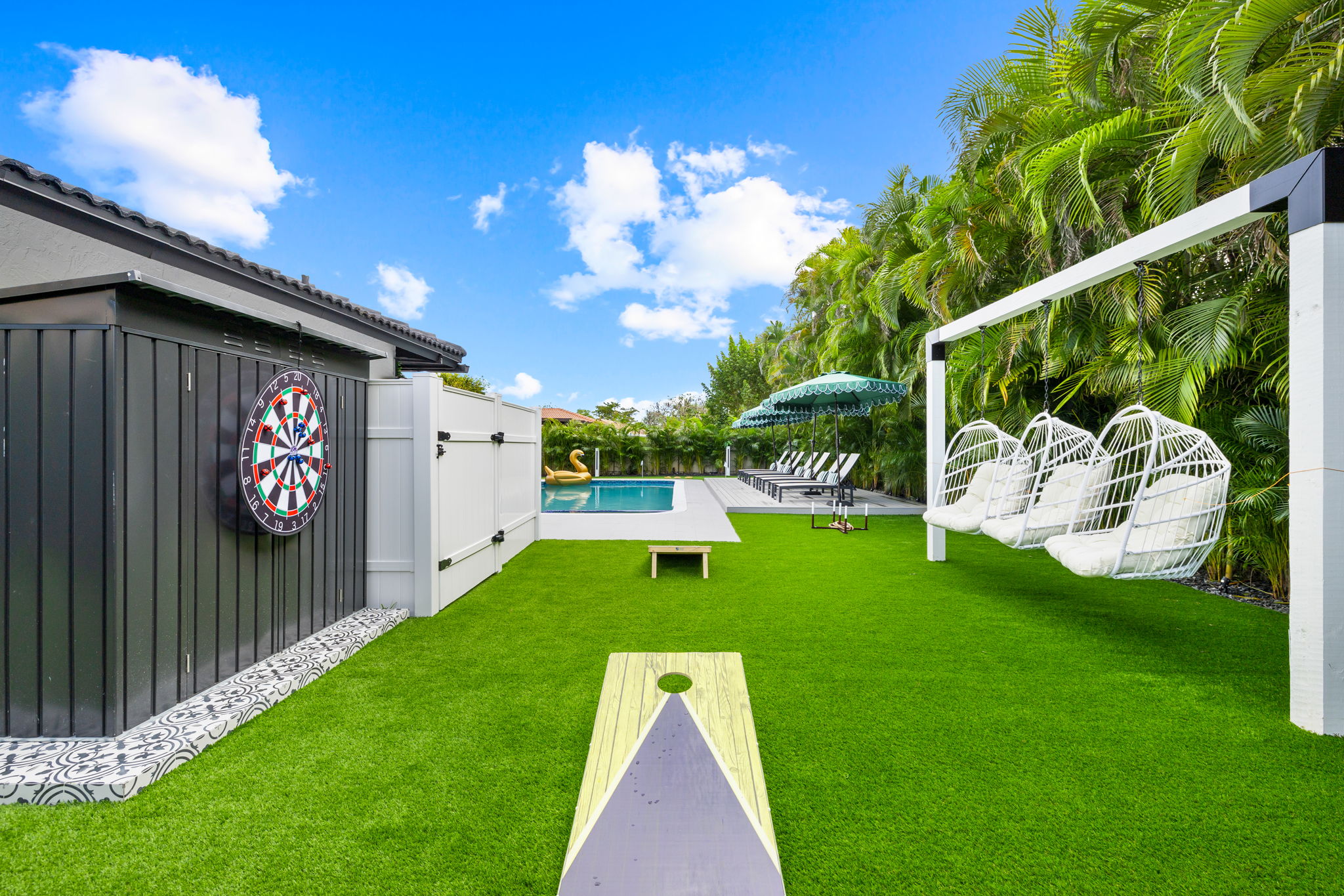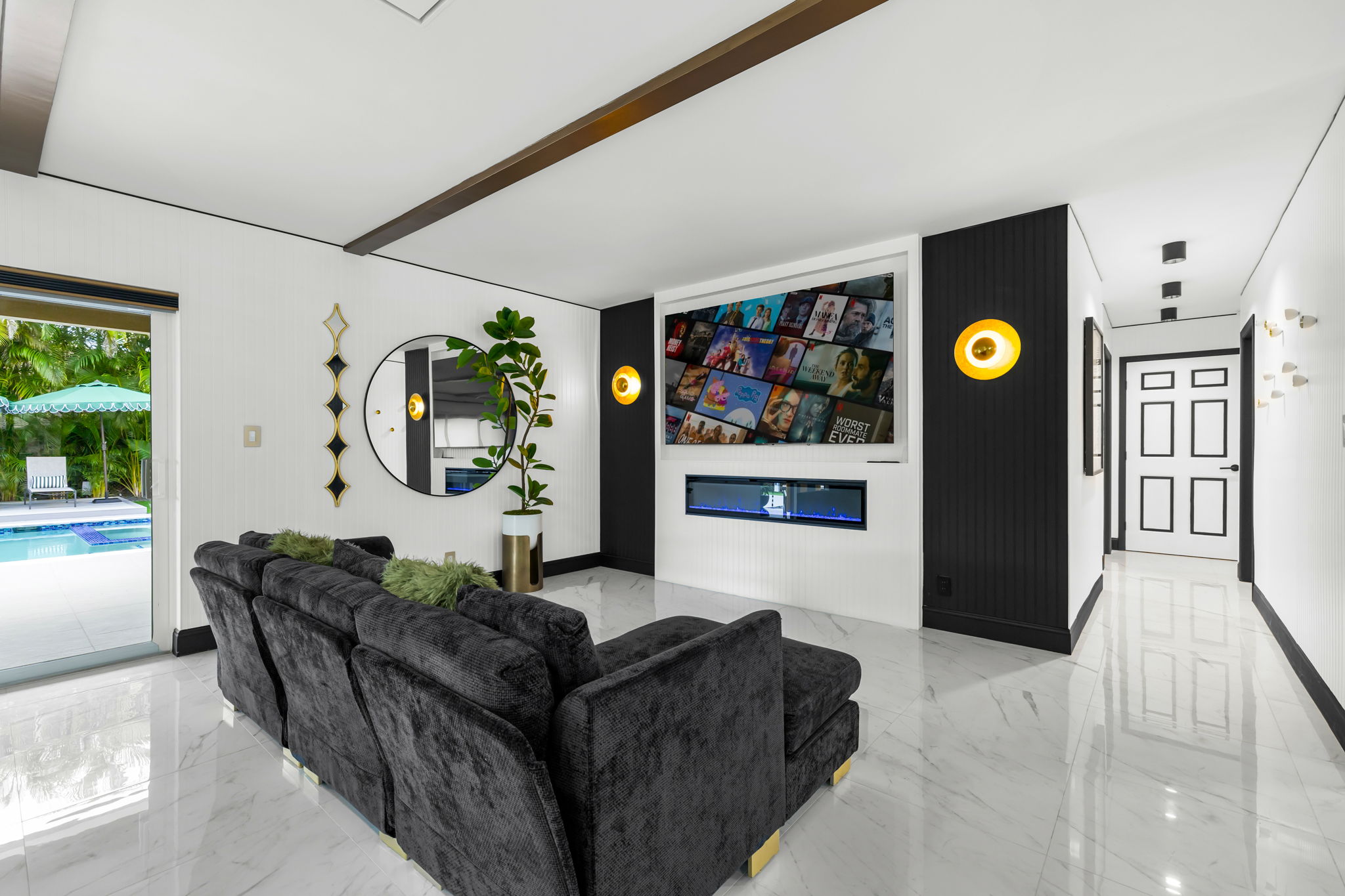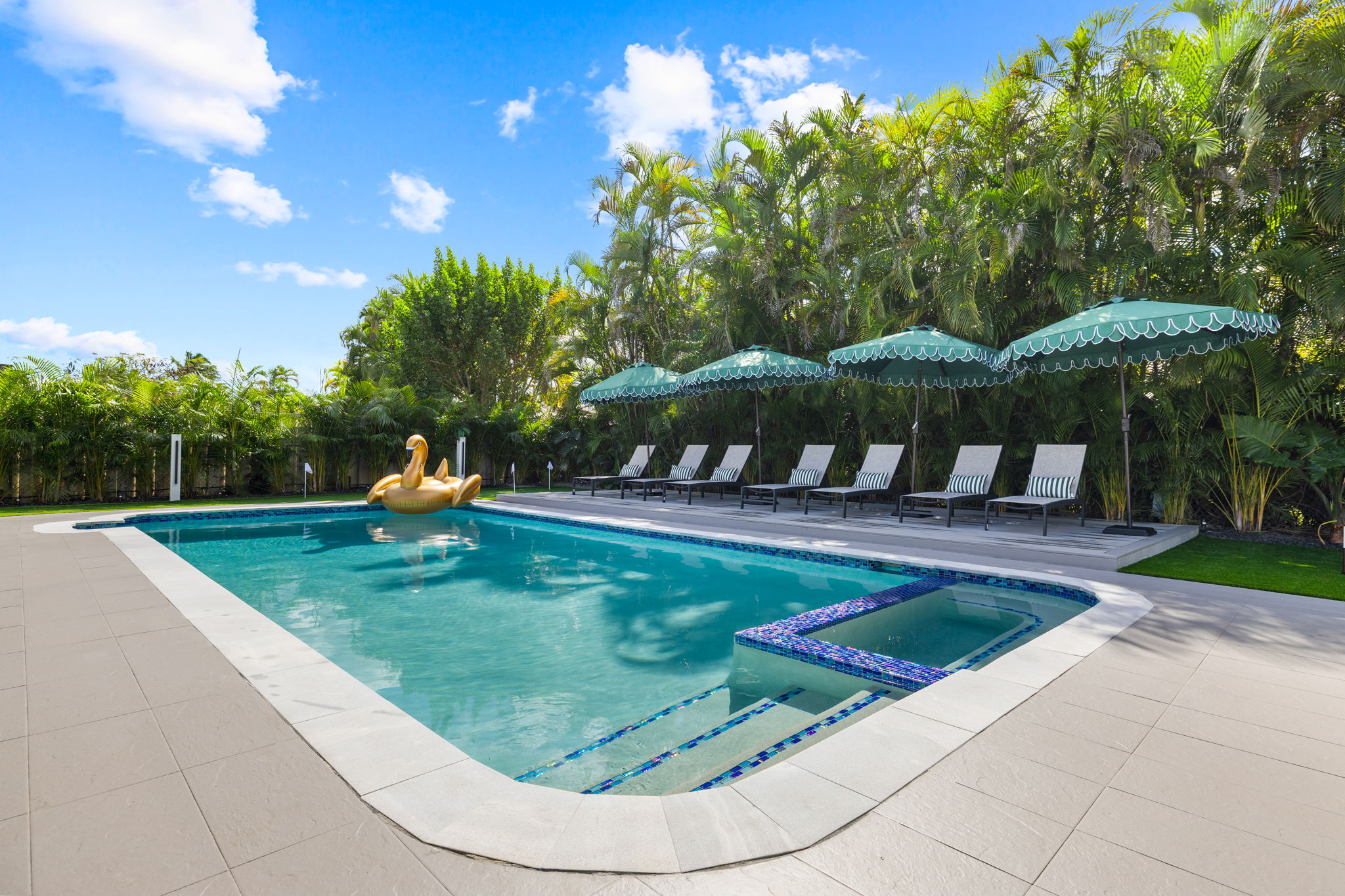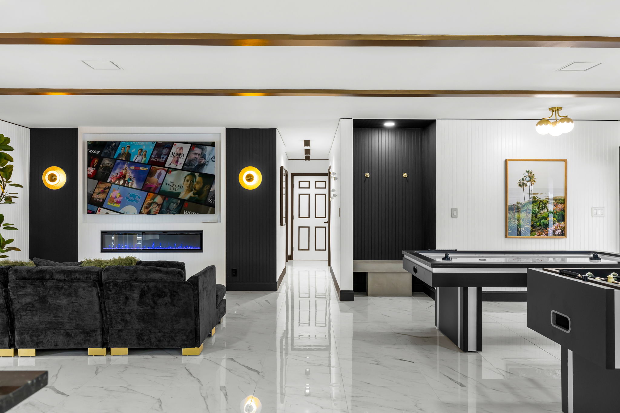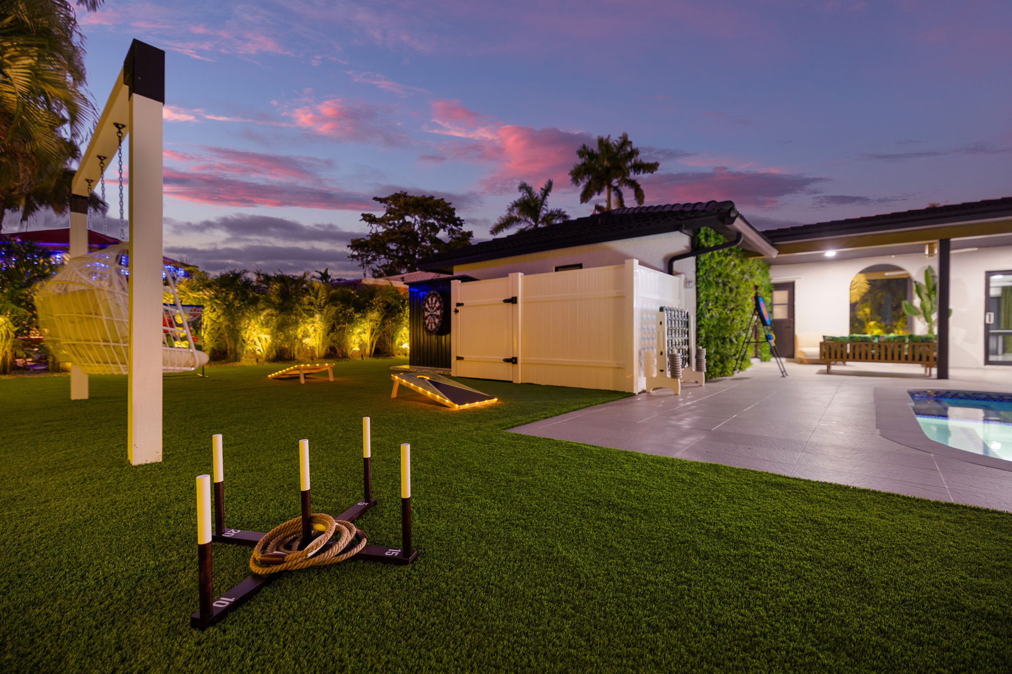 Entertainment options abound, making this property an ideal gathering spot. The living area includes impressive 85-inch televisions, while the resort-style backyard features a heated pool, hot tub, outdoor fire pit, and barbecue area. For added fun, a mini-golf setup and premium artificial turf offer low-maintenance convenience. The home comfortably accommodates up to 12 guests, making it perfect for families or social gatherings.
