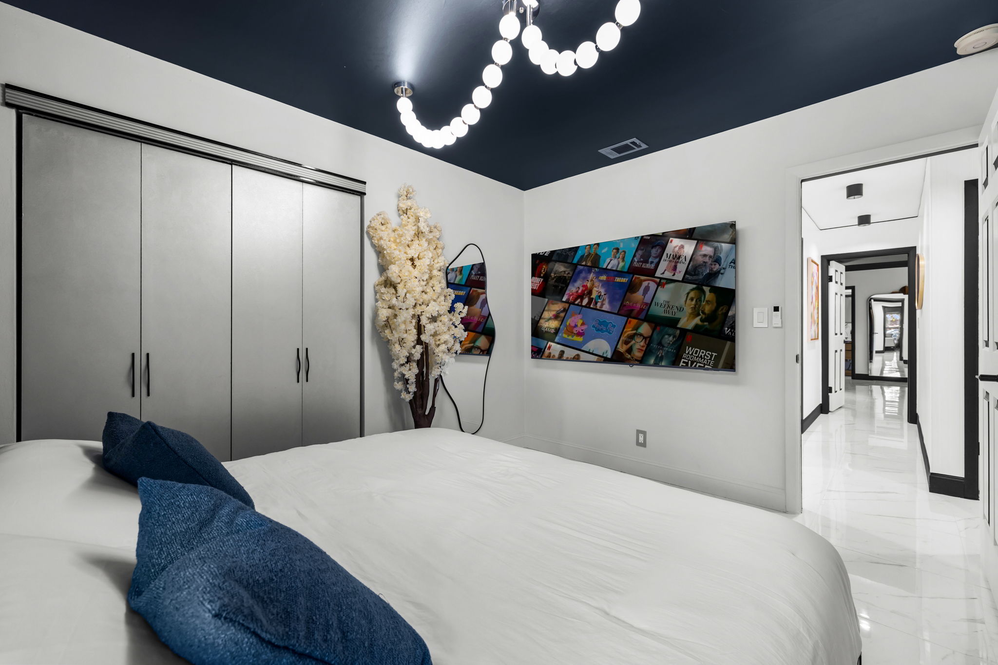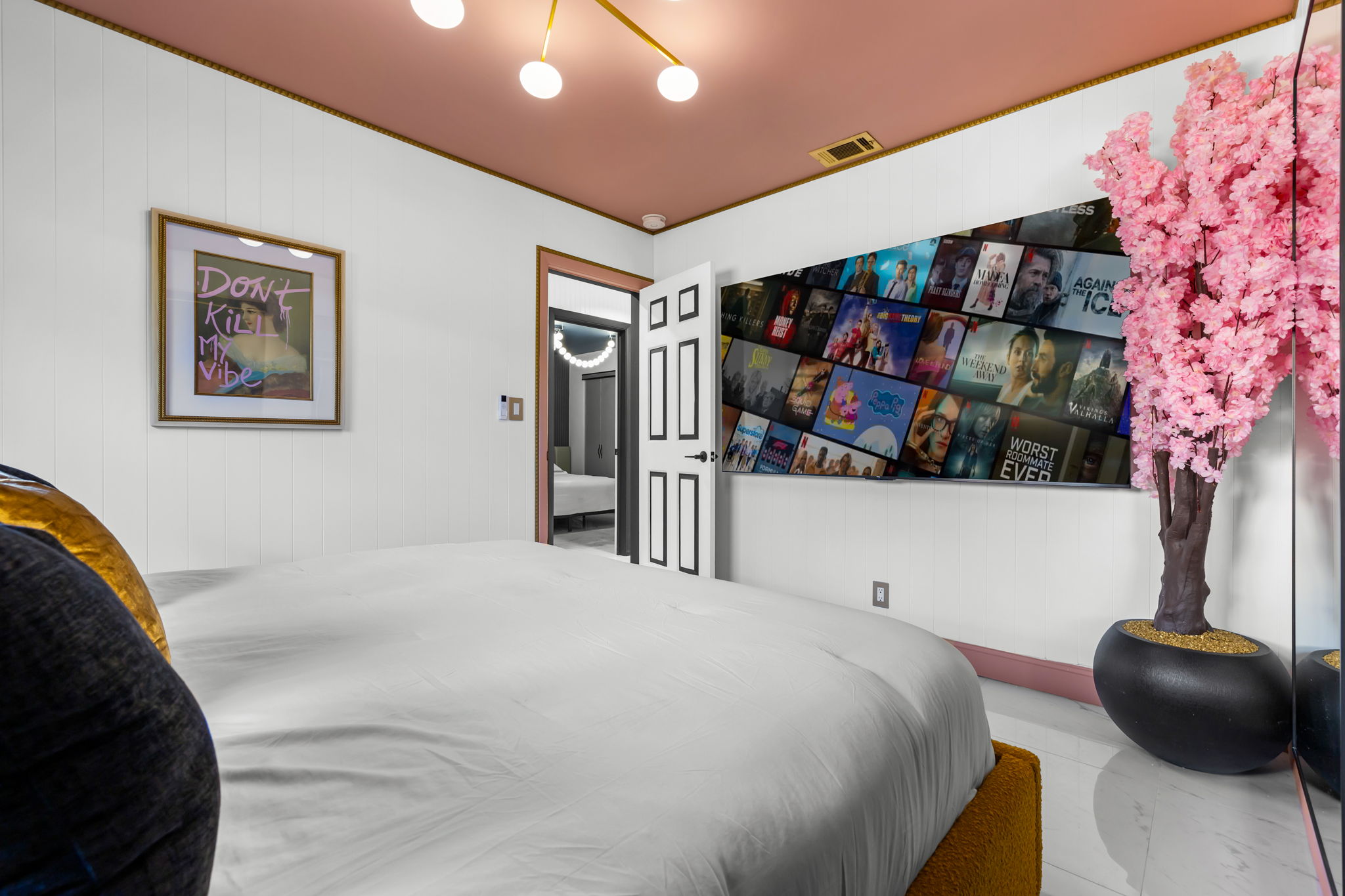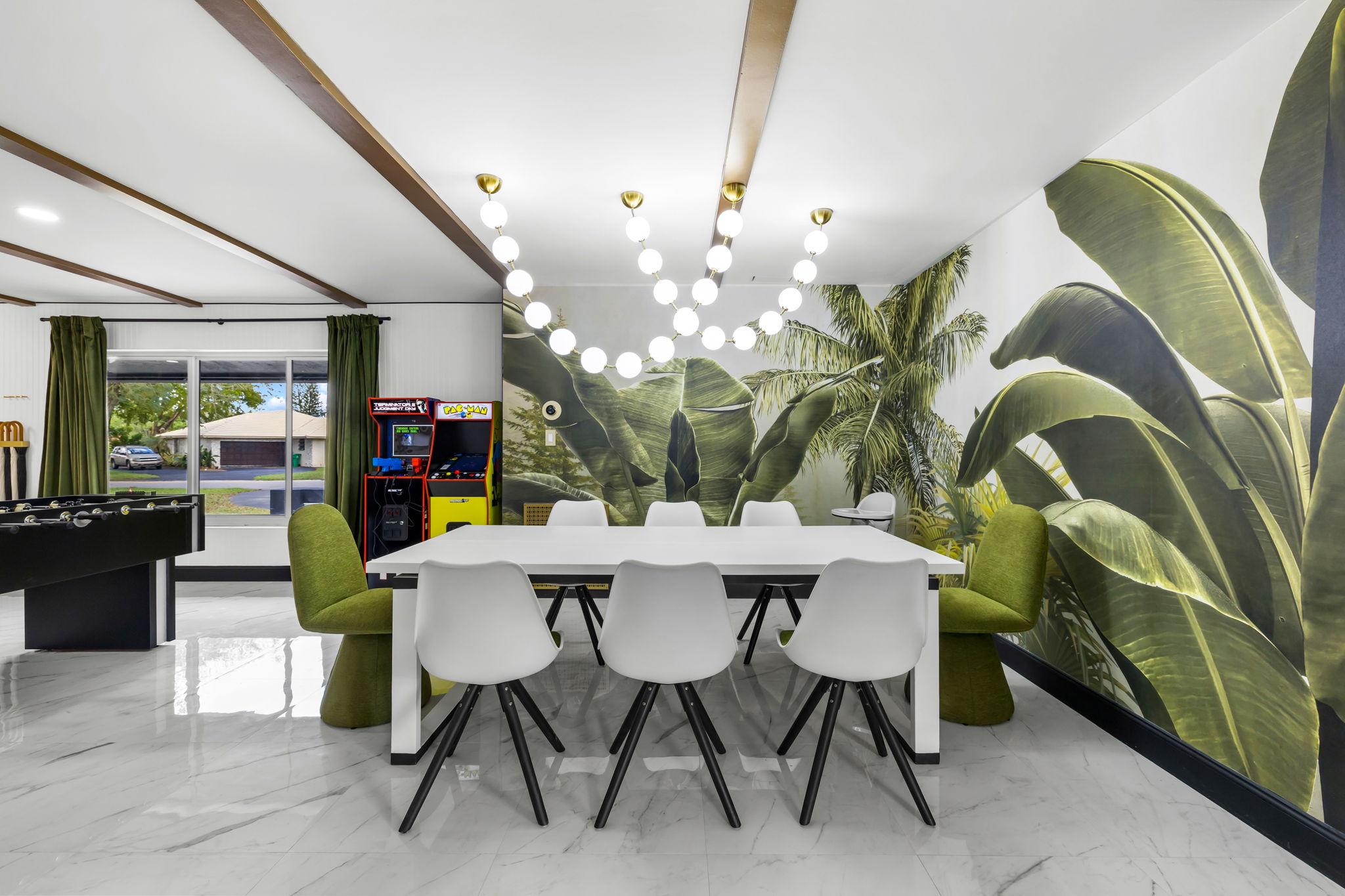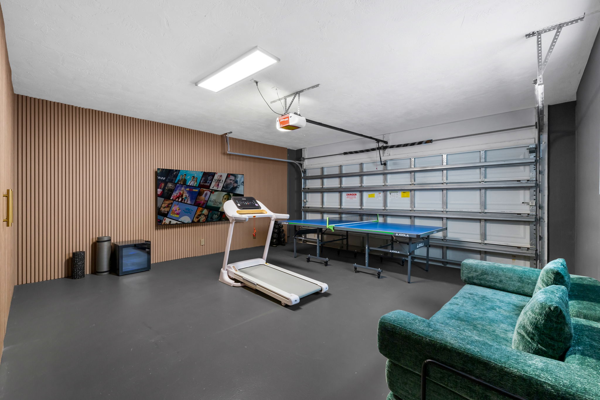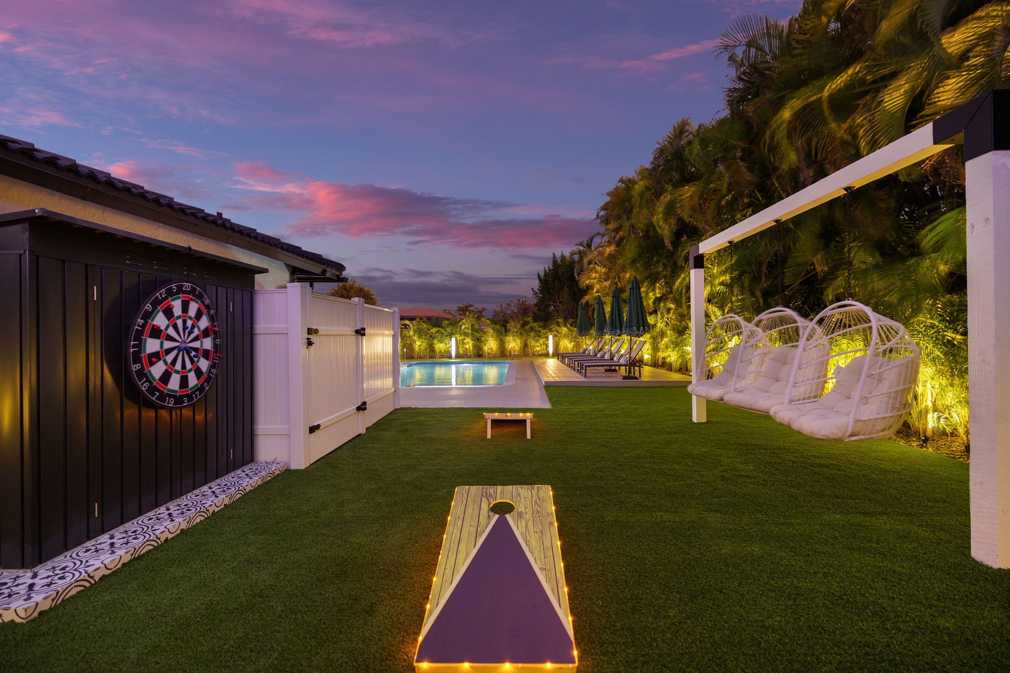 Entertainment options abound, making this property an ideal gathering spot. The living area includes impressive 85-inch televisions, while the resort-style backyard features a heated pool, hot tub, outdoor fire pit, and barbecue area. For added fun, a mini-golf setup and premium artificial turf offer low-maintenance convenience. The home comfortably accommodates up to 12 guests, making it perfect for families or social gatherings.