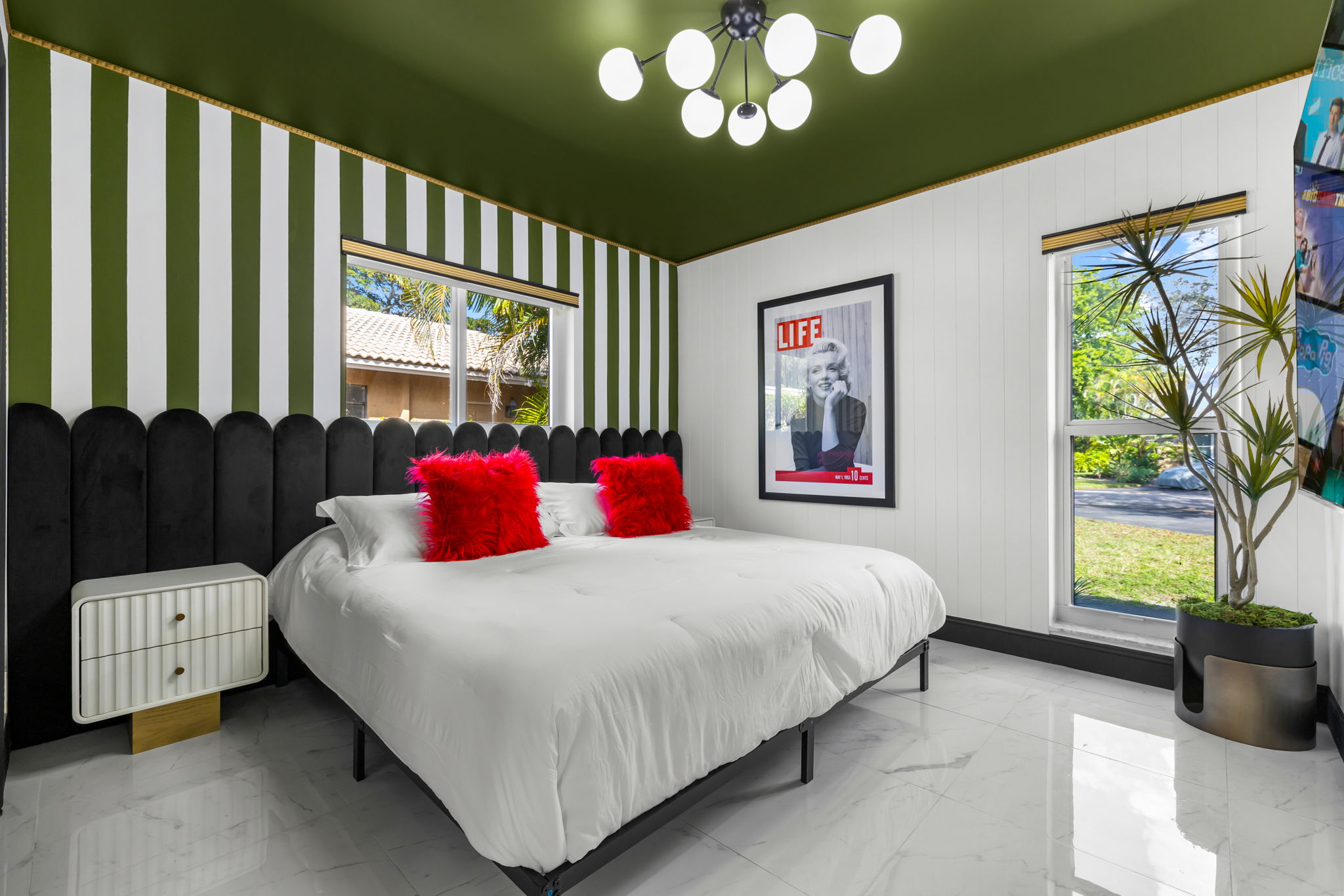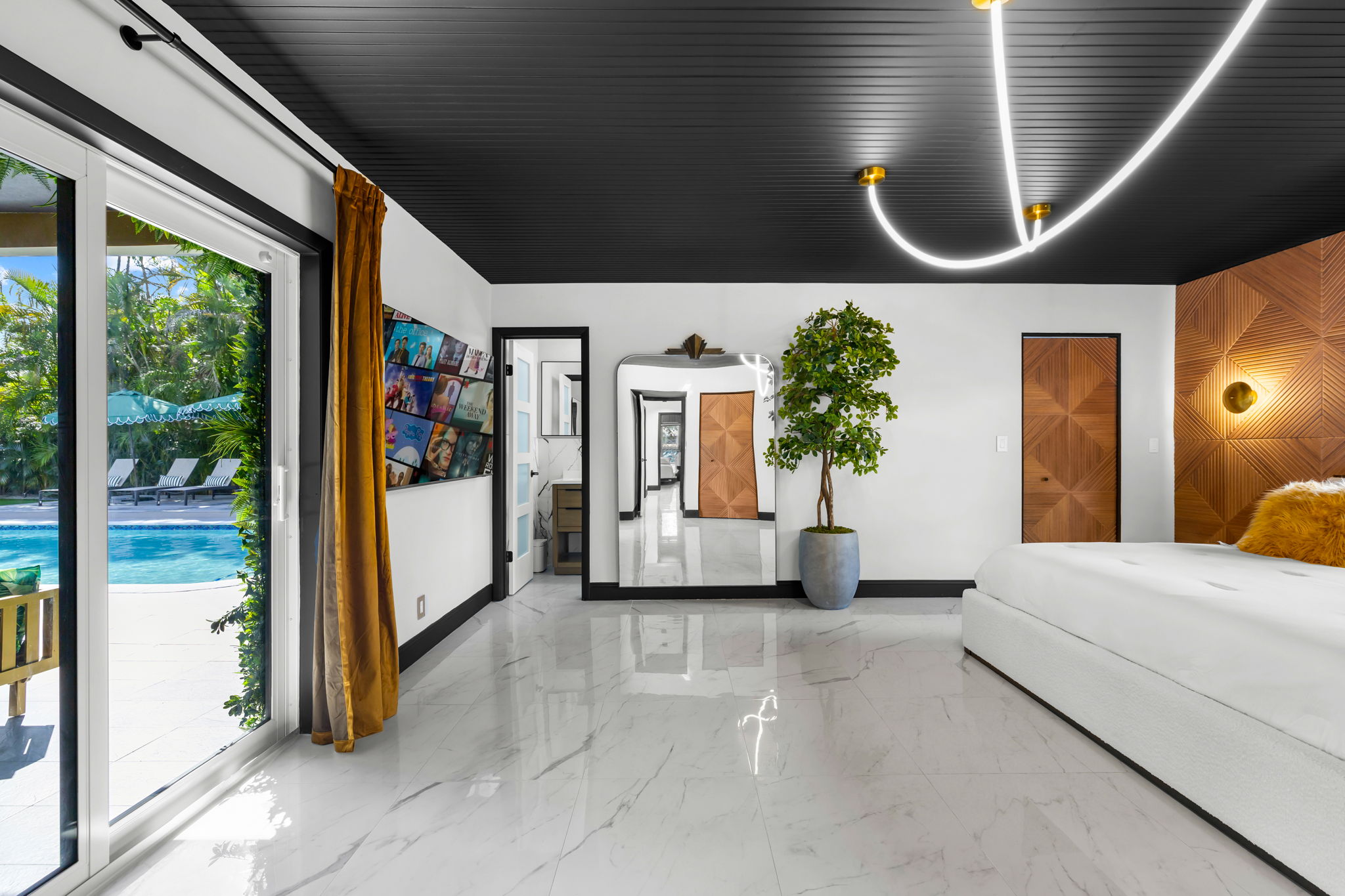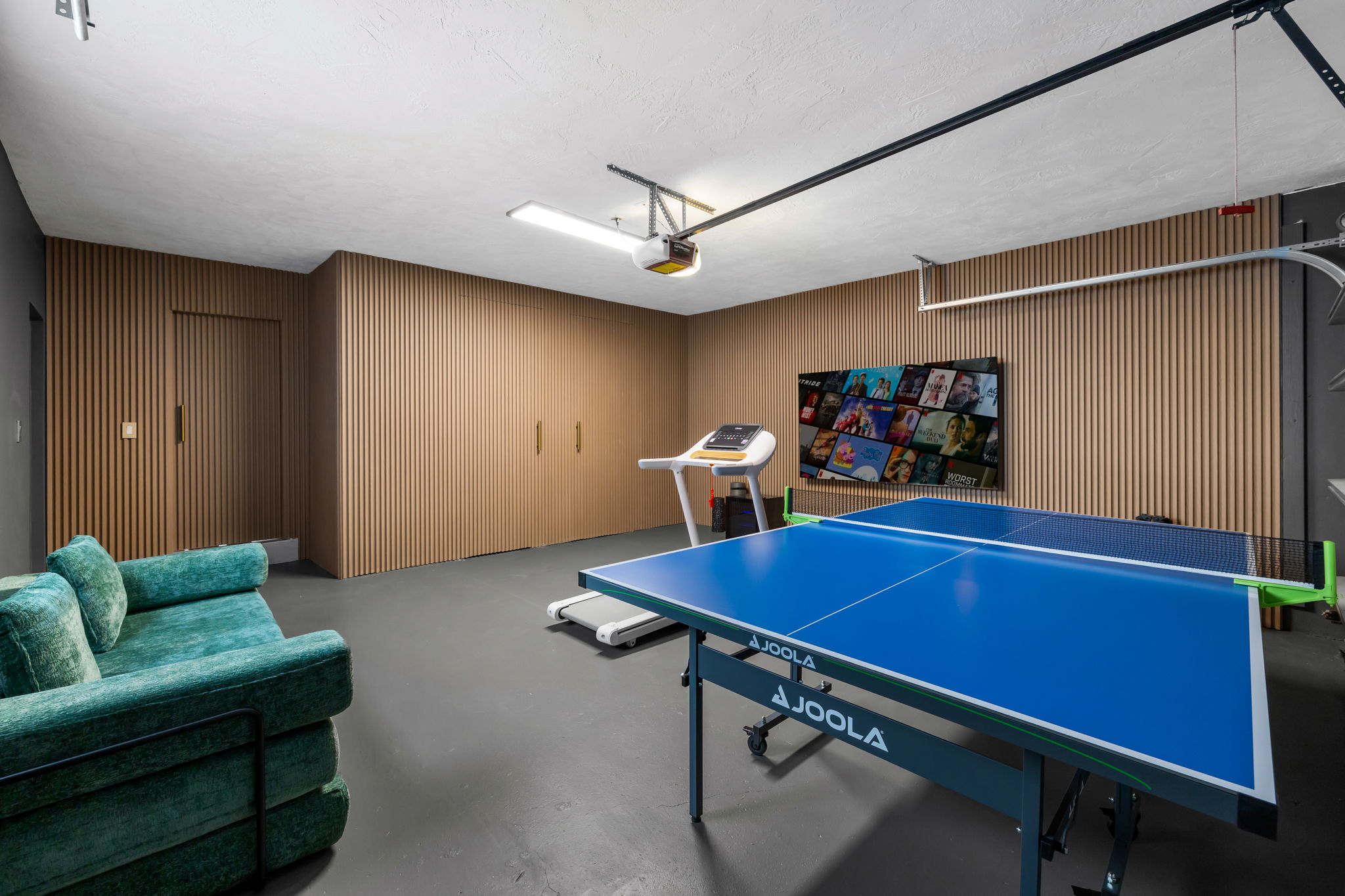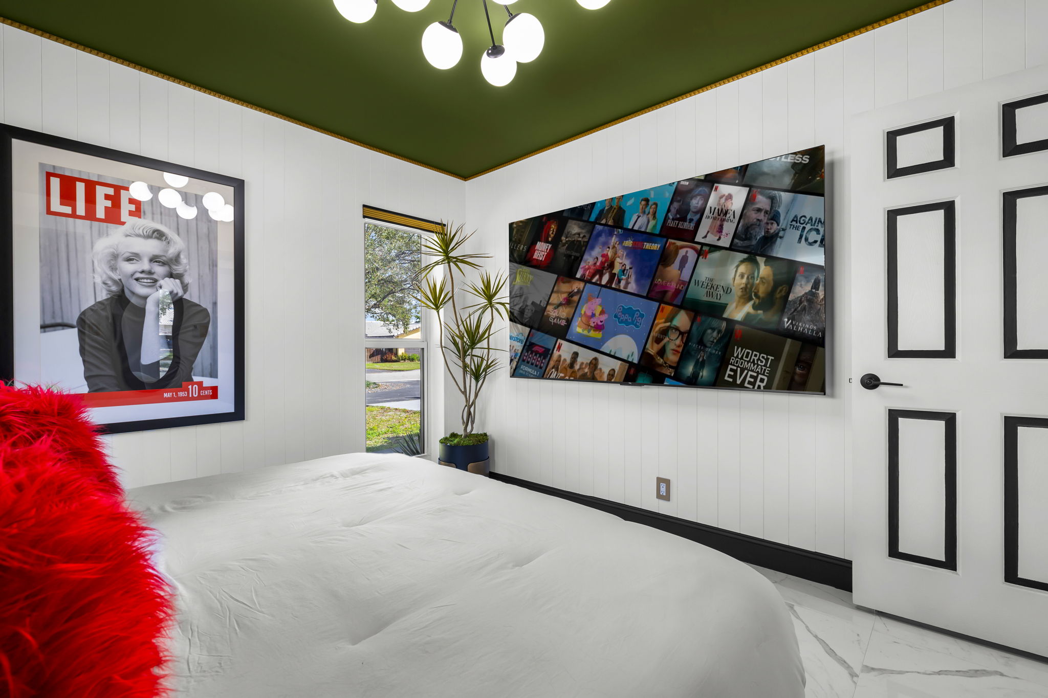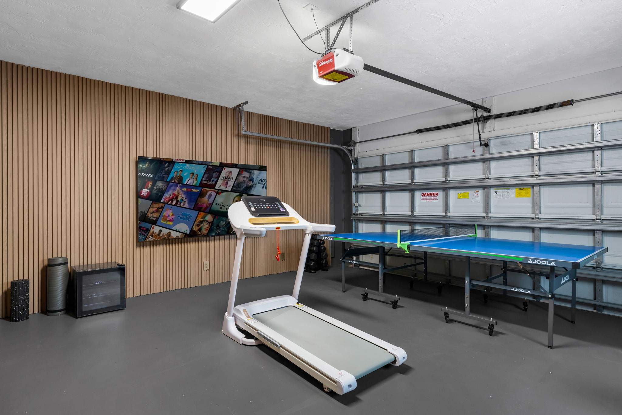 Entertainment options abound, making this property an ideal gathering spot. The living area includes impressive 85-inch televisions, while the resort-style backyard features a heated pool, hot tub, outdoor fire pit, and barbecue area. For added fun, a mini-golf setup and premium artificial turf offer low-maintenance convenience. The home comfortably accommodates up to 12 guests, making it perfect for families or social gatherings.