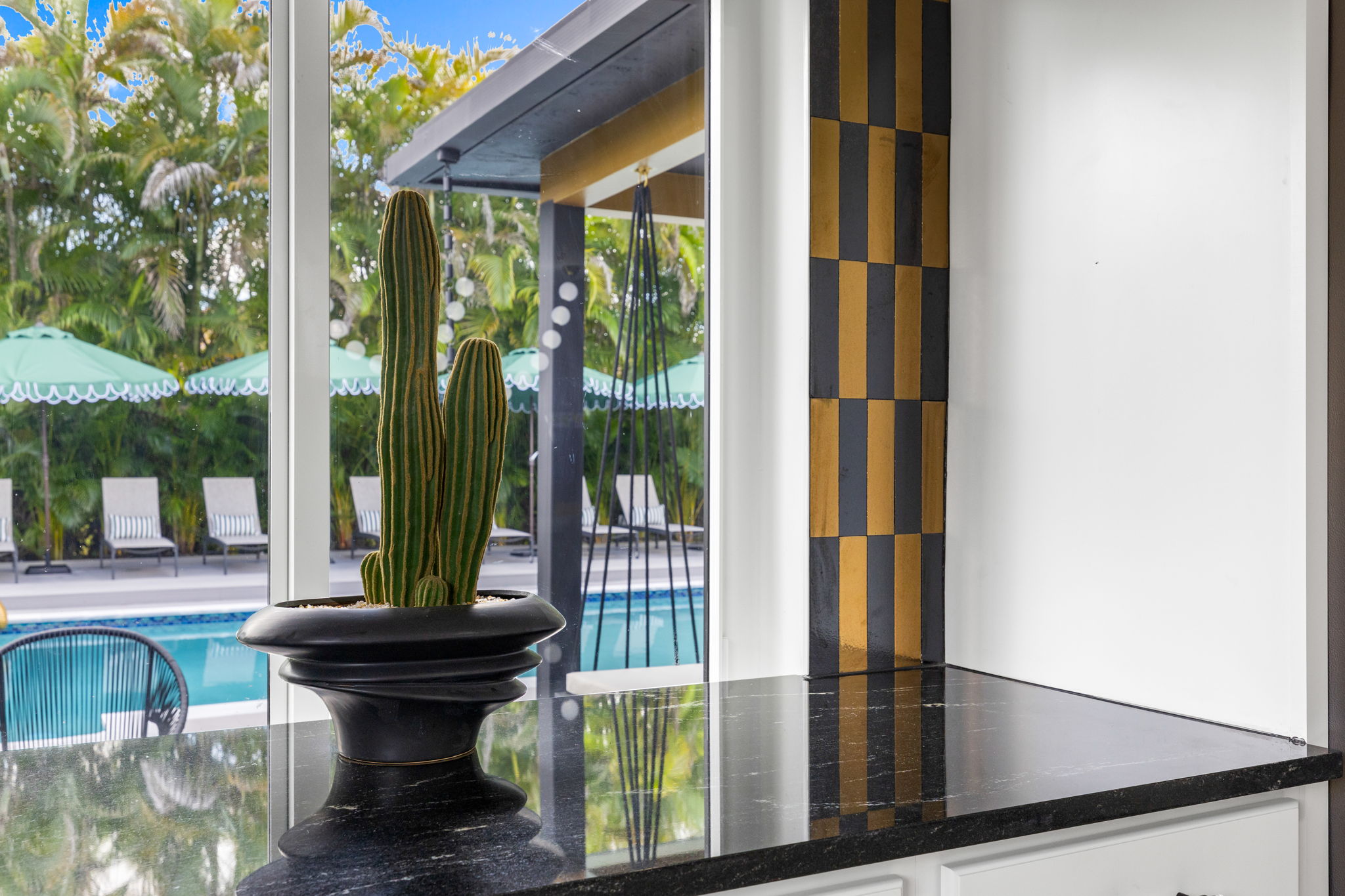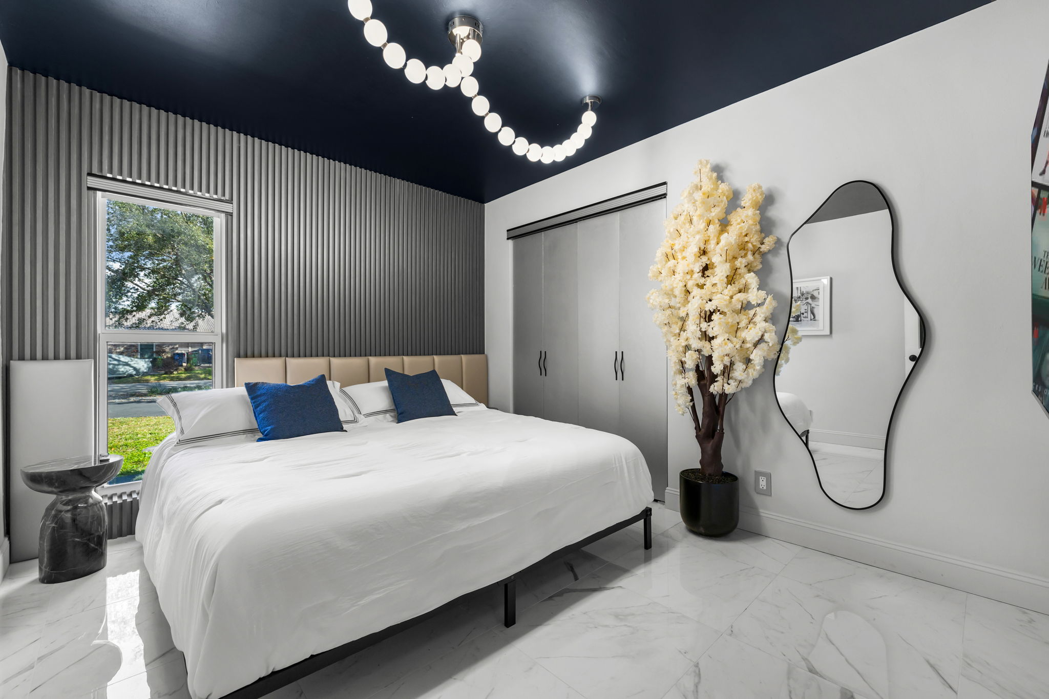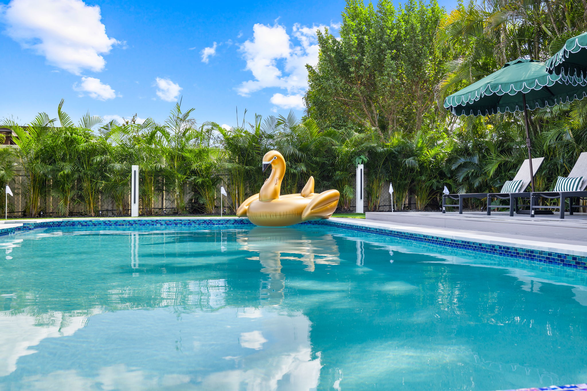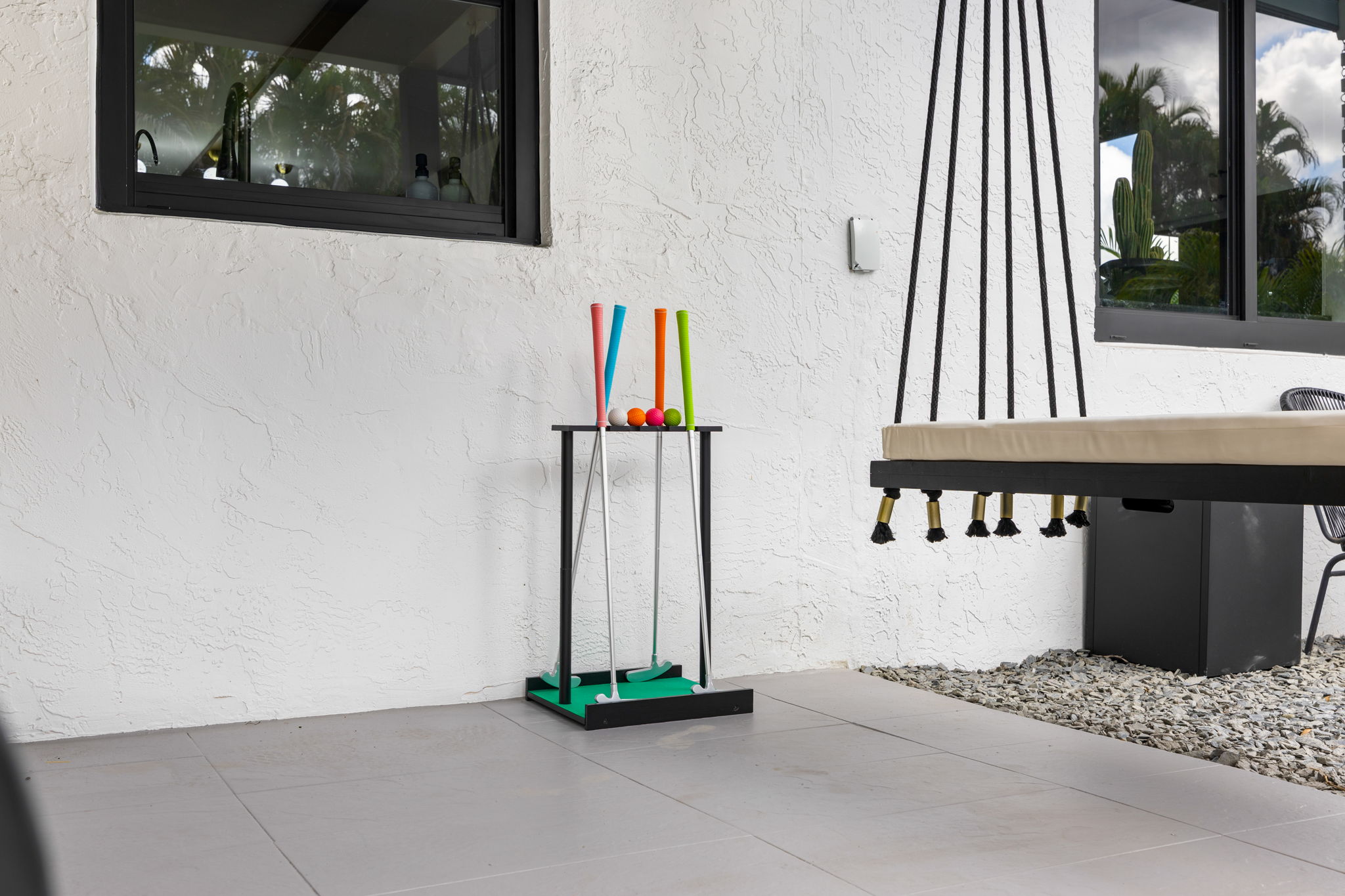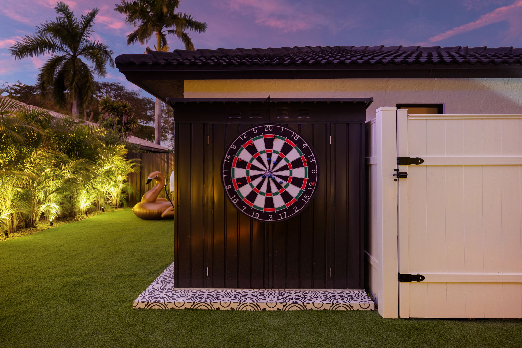 Entertainment options abound, making this property an ideal gathering spot. The living area includes impressive 85-inch televisions, while the resort-style backyard features a heated pool, hot tub, outdoor fire pit, and barbecue area. For added fun, a mini-golf setup and premium artificial turf offer low-maintenance convenience. The home comfortably accommodates up to 12 guests, making it perfect for families or social gatherings.