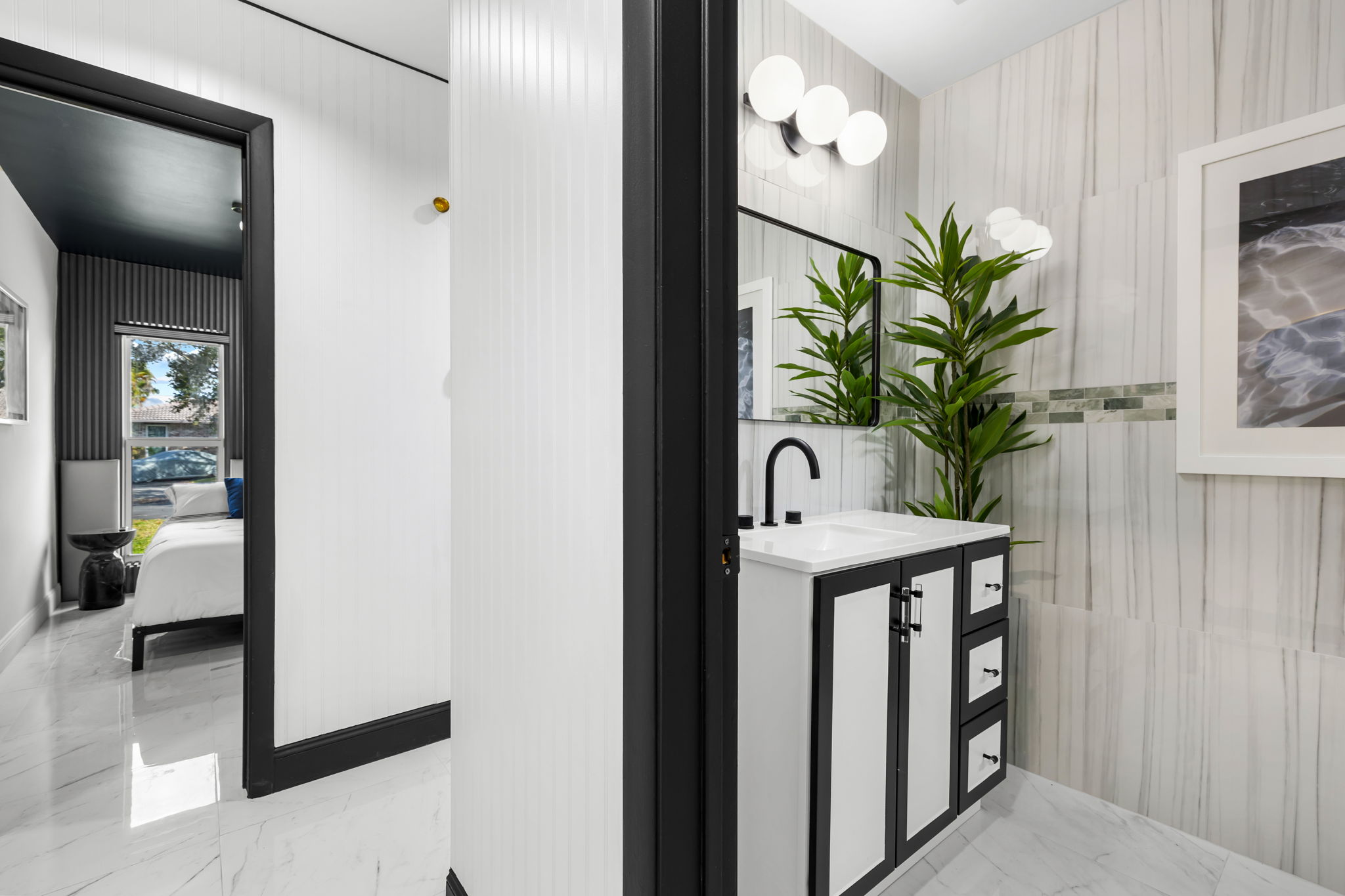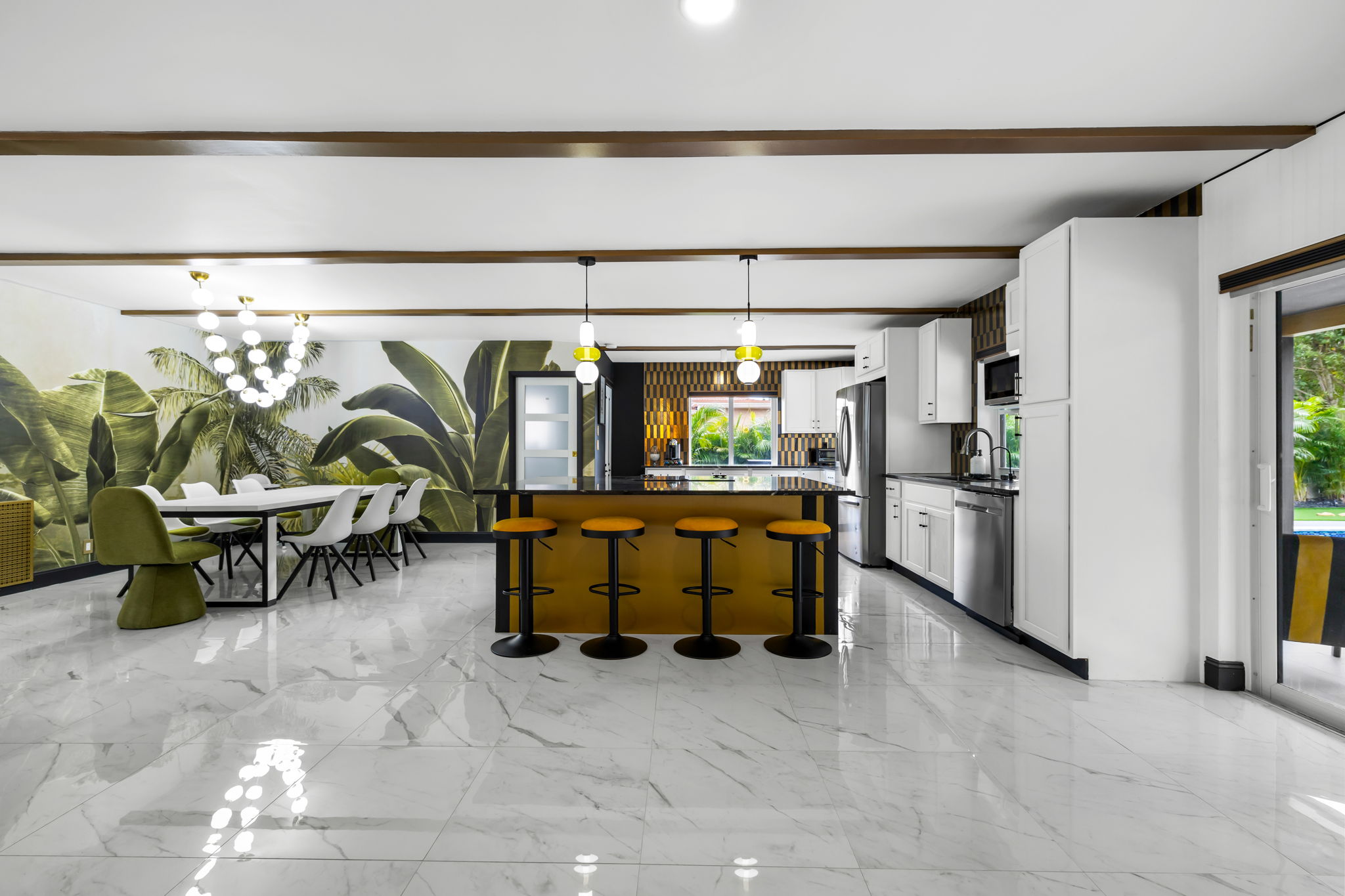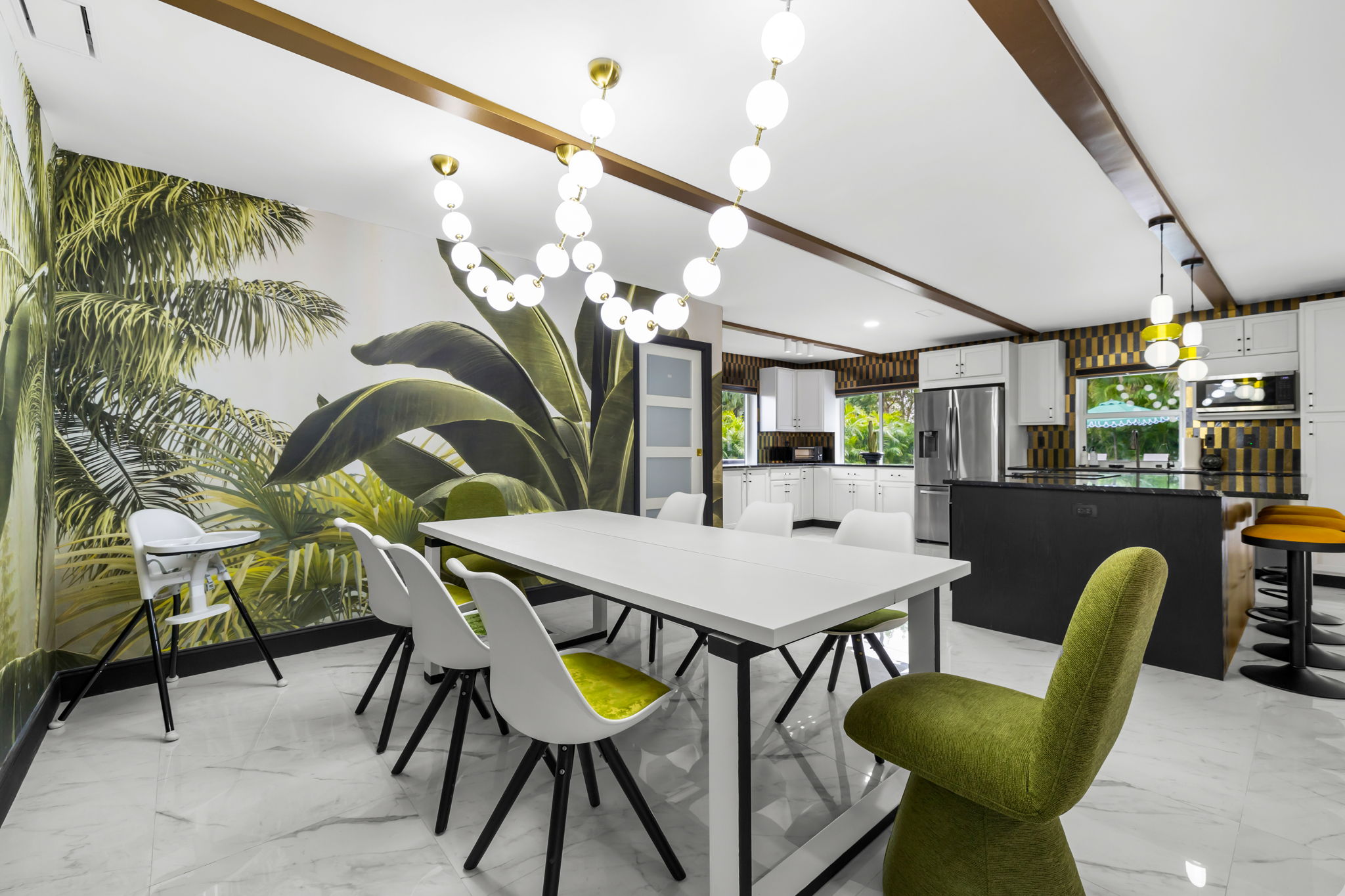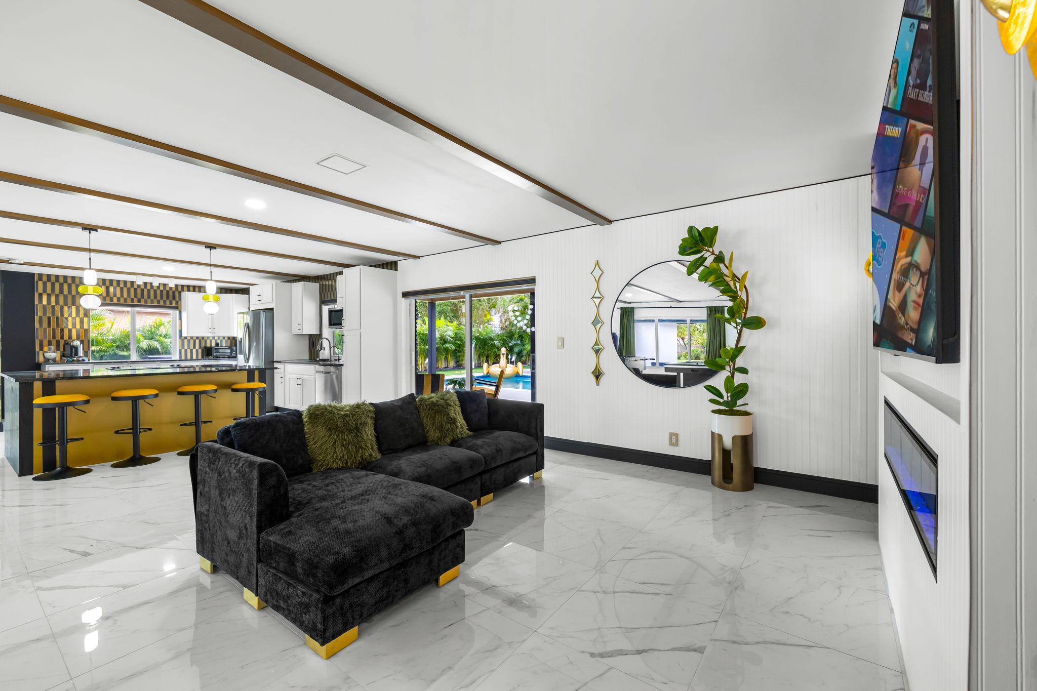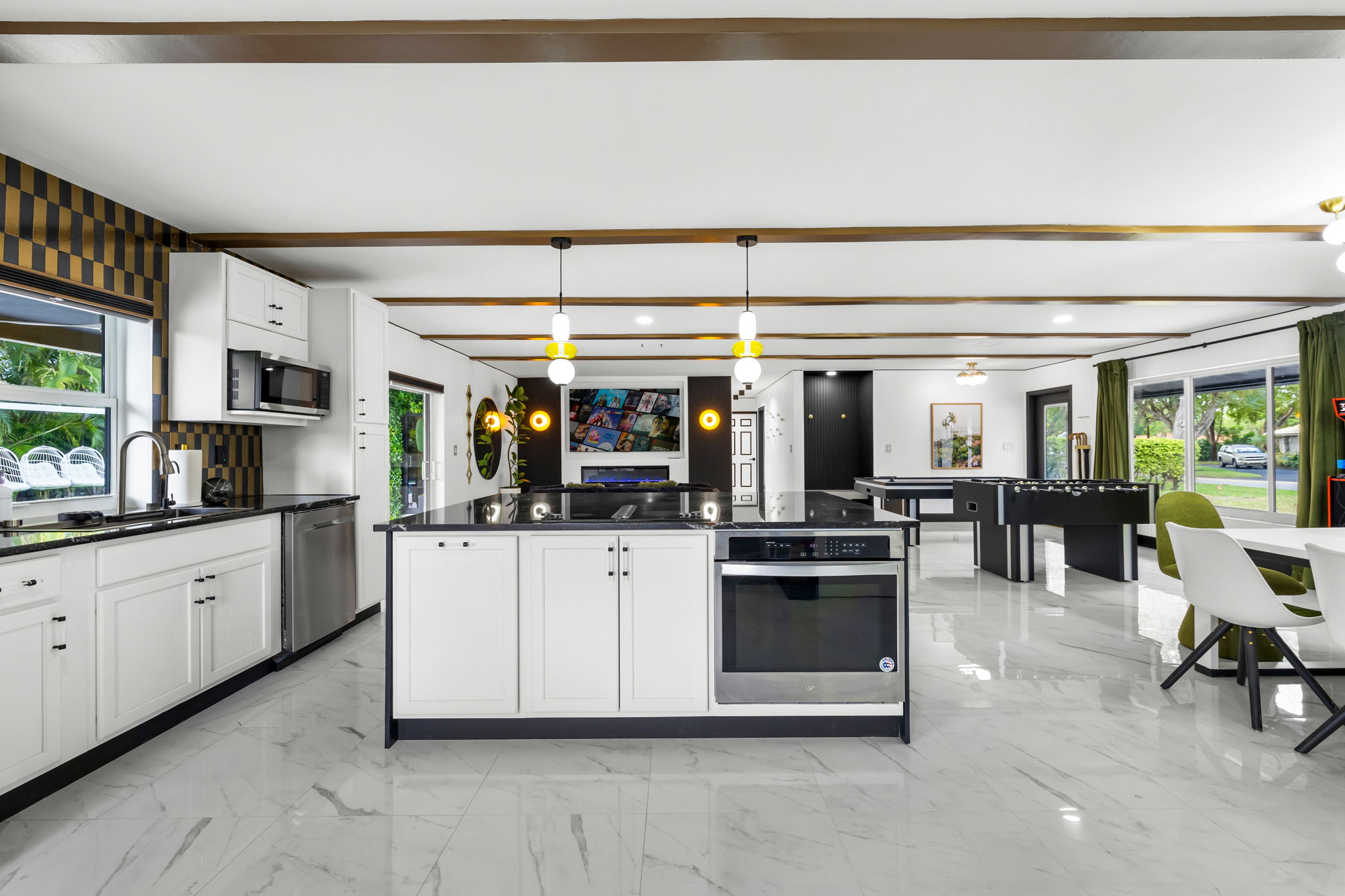 This meticulously remodeled single-family home features four bedrooms and two baths, offering a generous 2,040 square feet of living space. Built in 1976, the residence has been updated with high-end finishes and a professionally designed interior, creating a harmonious blend of style and functionality. The modern open floor plan is perfect for both everyday living and entertaining, showcasing a full chef's kitchen and an electric fireplace as centerpieces of the home.