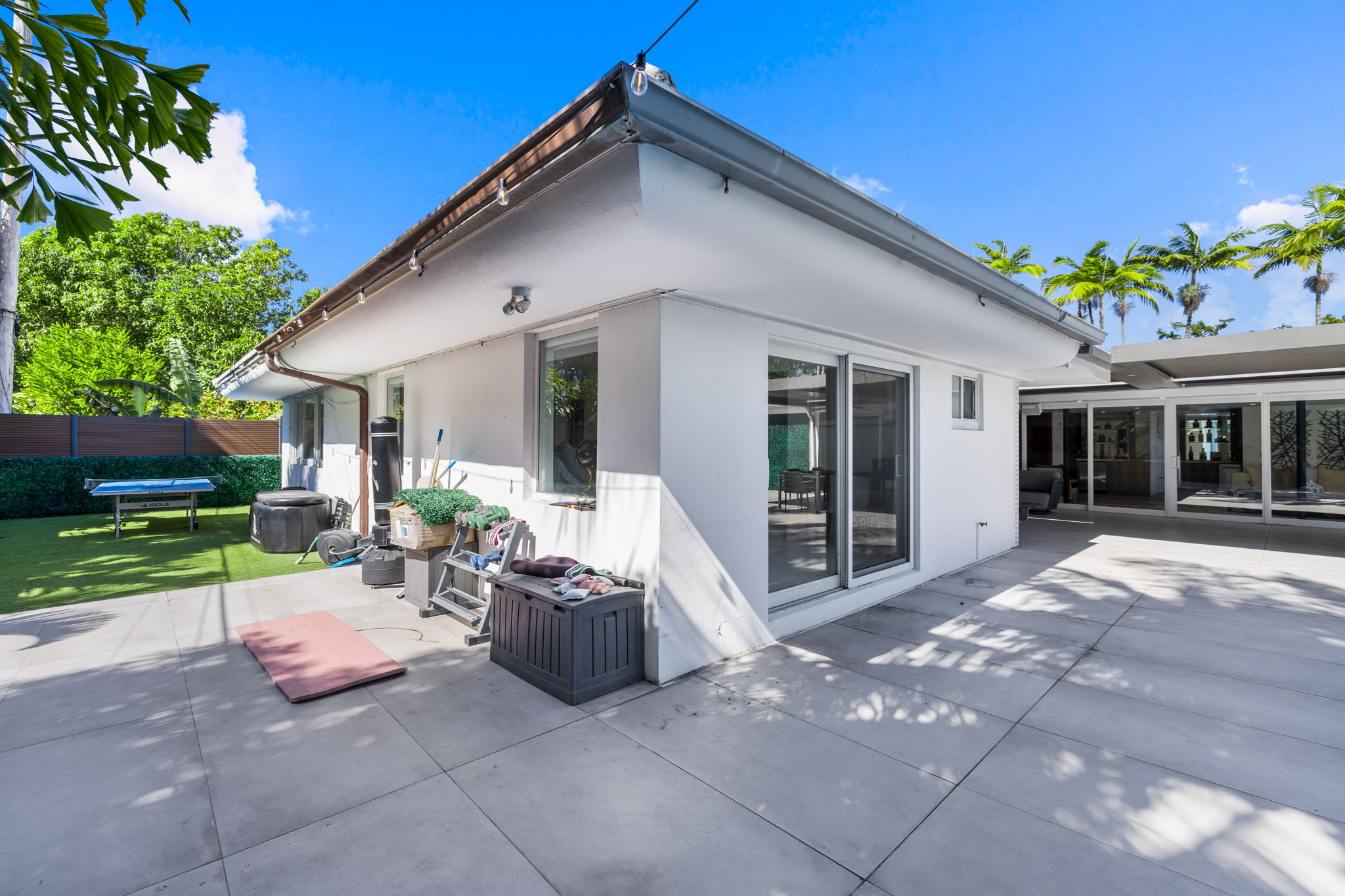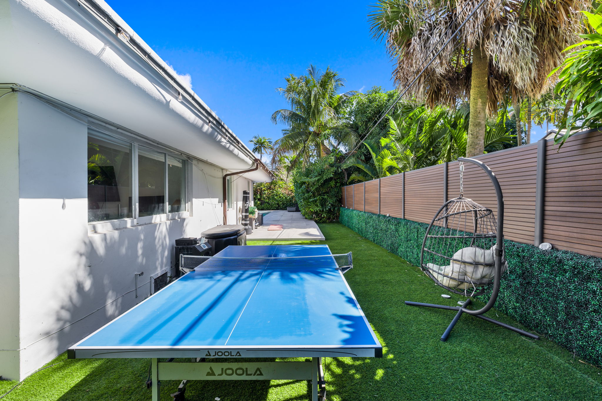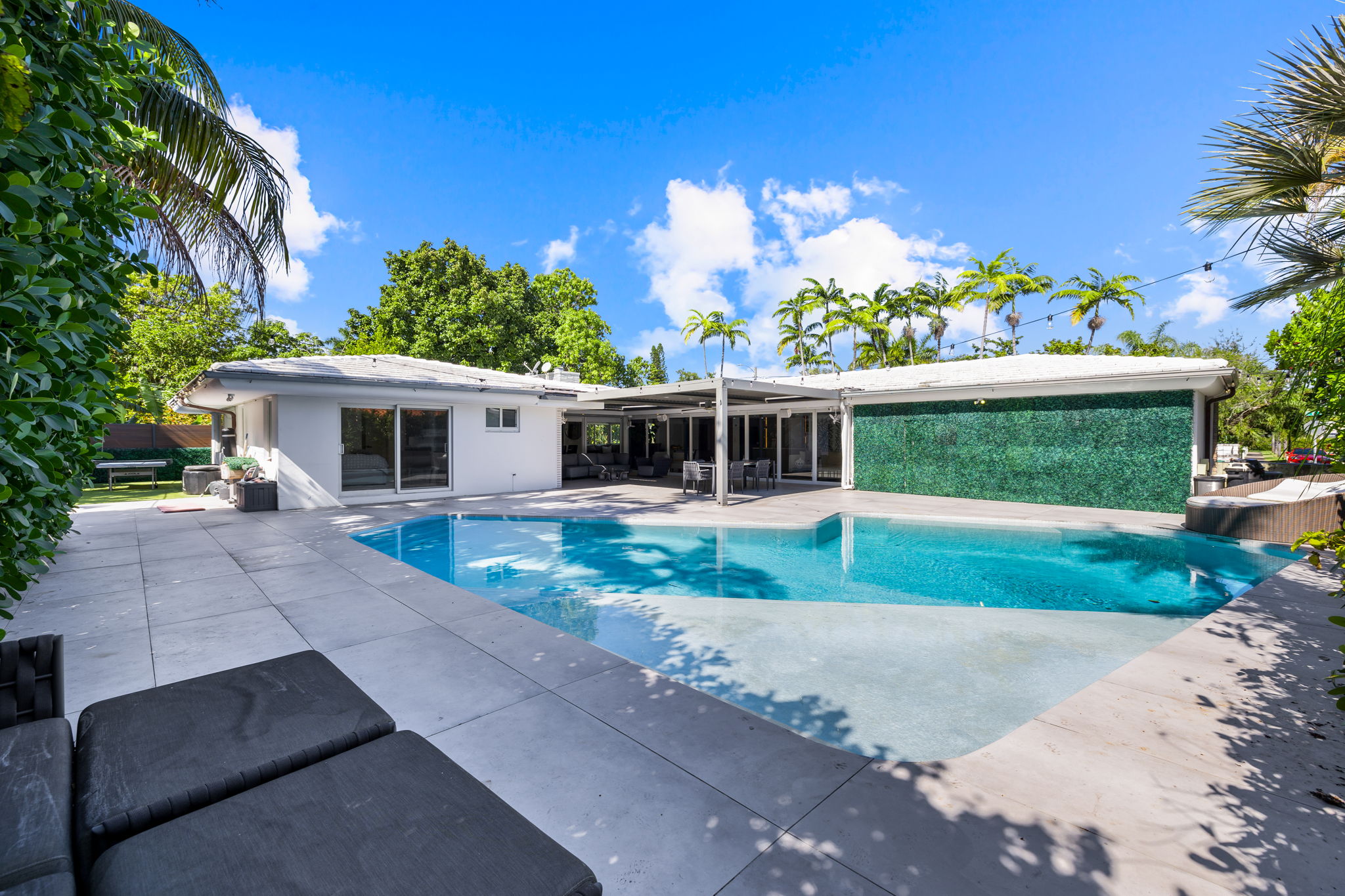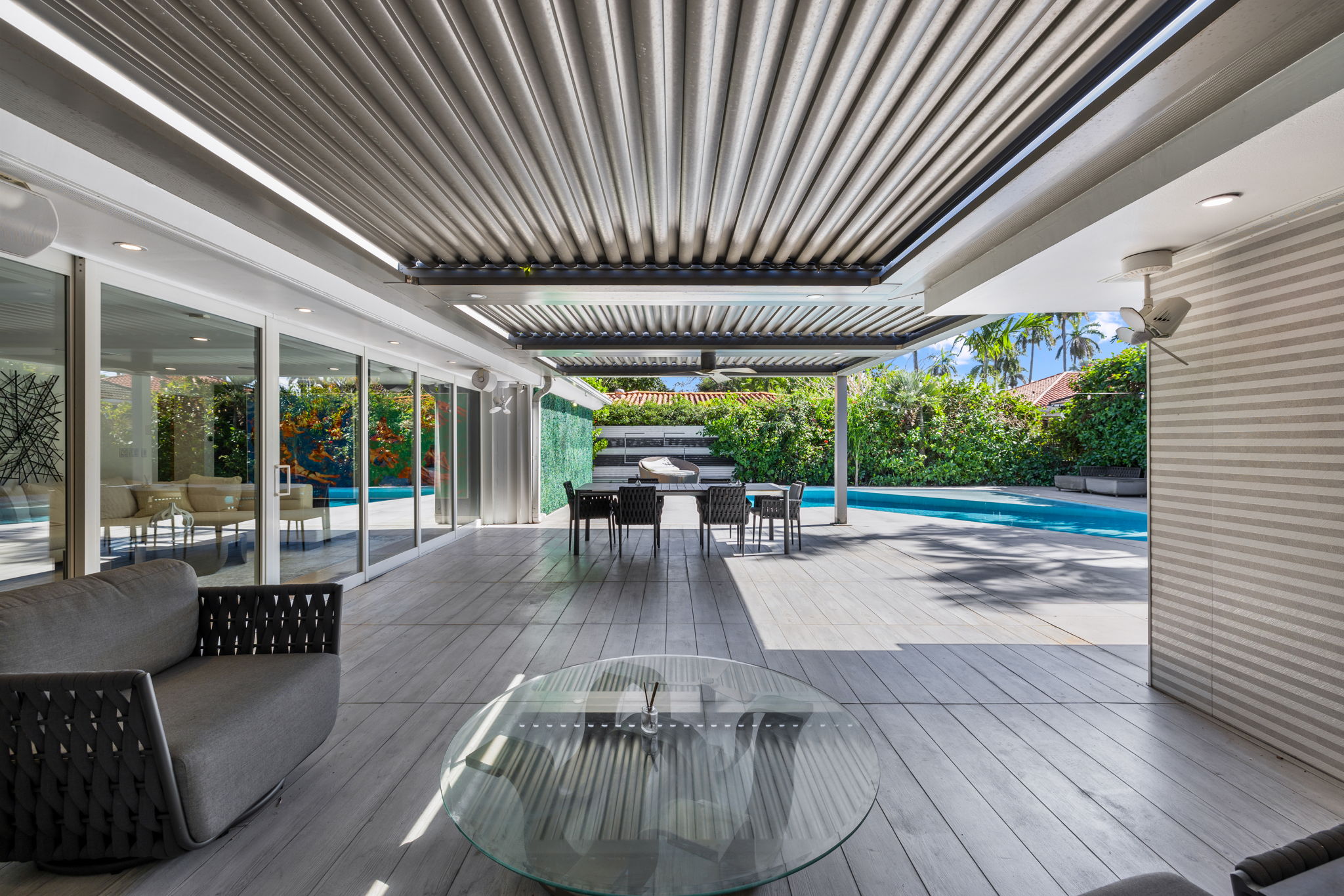 The outdoor space is thoughtfully designed to take advantage of the South Florida climate, featuring a saltwater pool, covered lounge areas, and new patio stonework, complemented by astroturf landscaping for low maintenance. Integrated surround sound speakers throughout the interior and exterior ensure an enjoyable entertainment experience, whether hosting friends or simply unwinding at home.