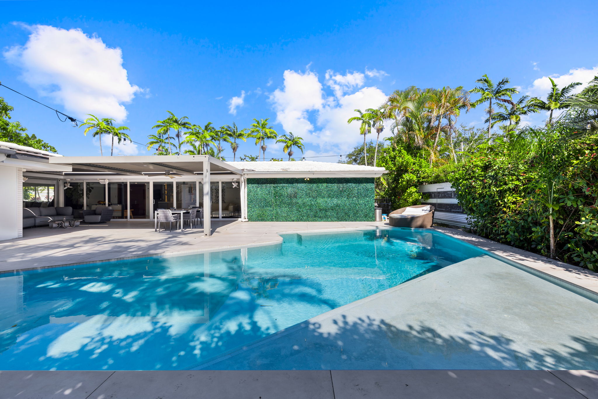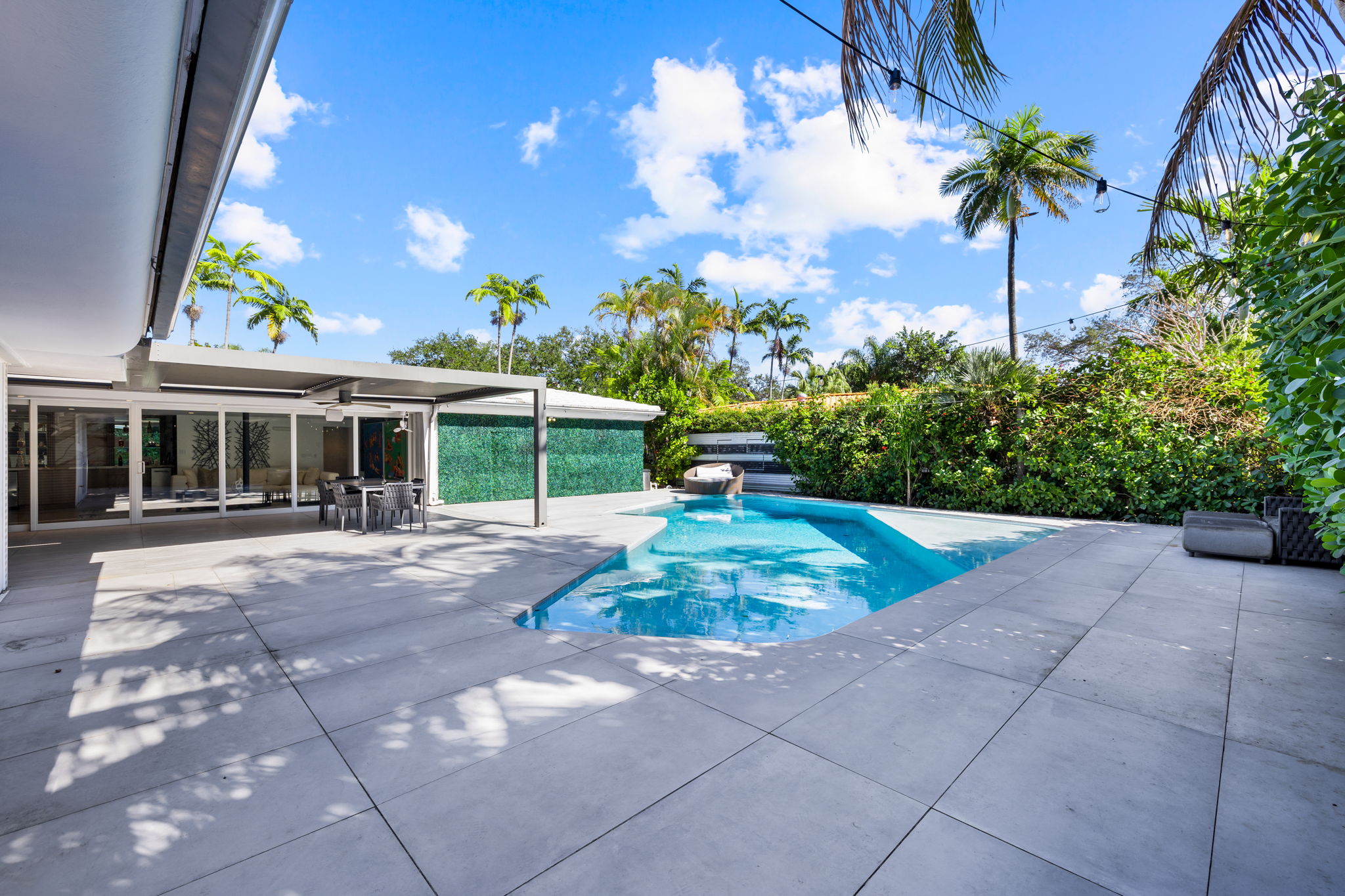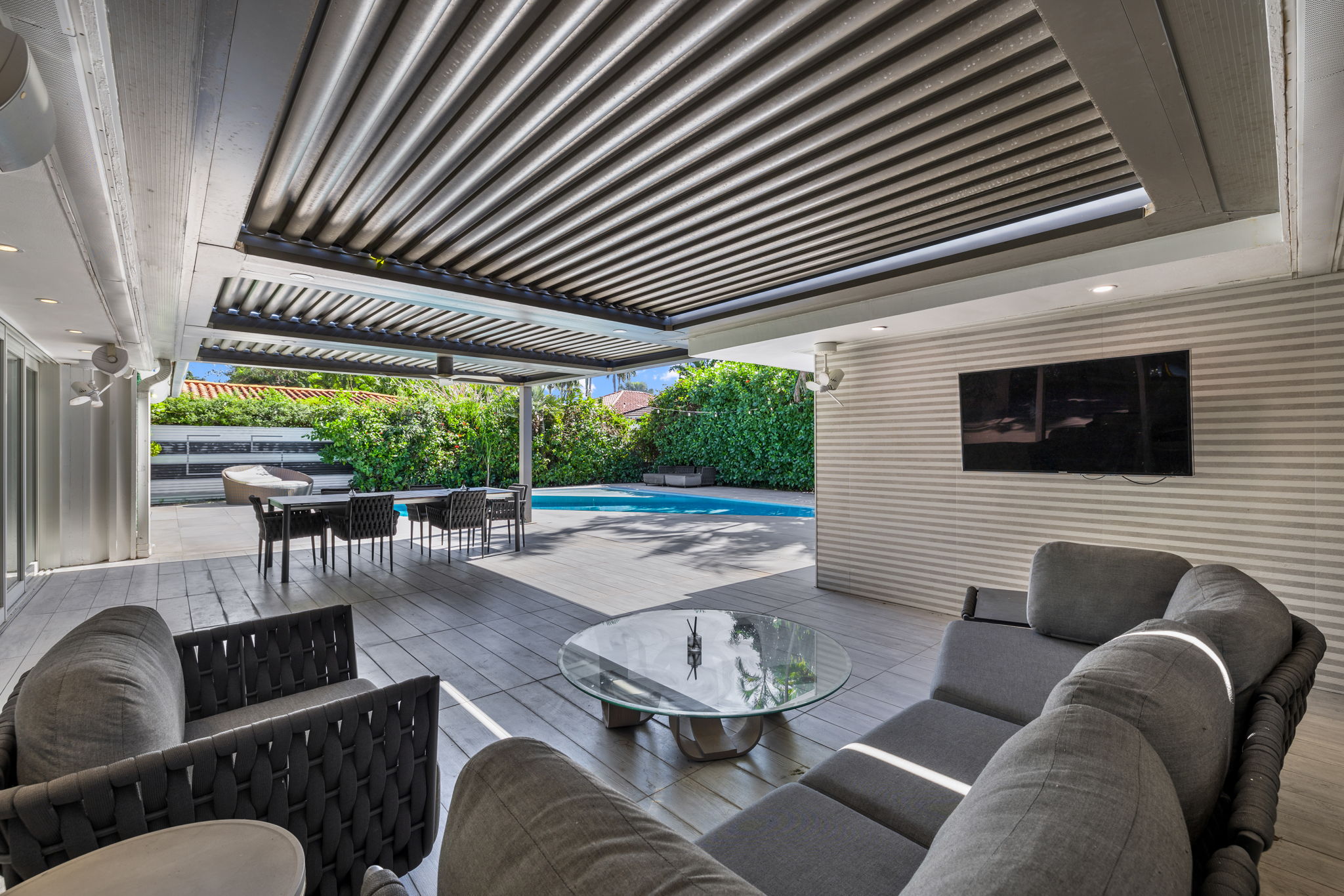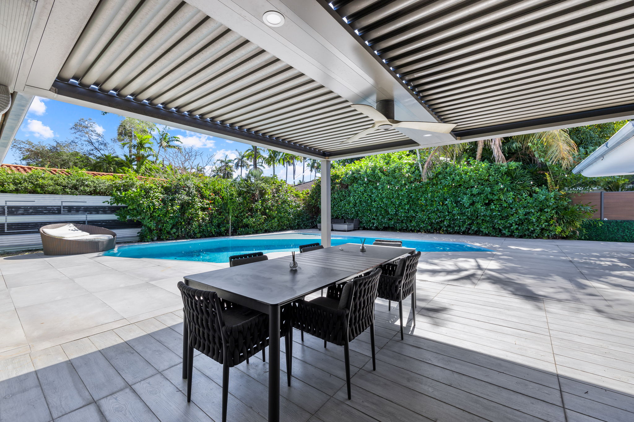 The outdoor space is thoughtfully designed to take advantage of the South Florida climate, featuring a saltwater pool, covered lounge areas, and new patio stonework, complemented by astroturf landscaping for low maintenance. Integrated surround sound speakers throughout the interior and exterior ensure an enjoyable entertainment experience, whether hosting friends or simply unwinding at home.