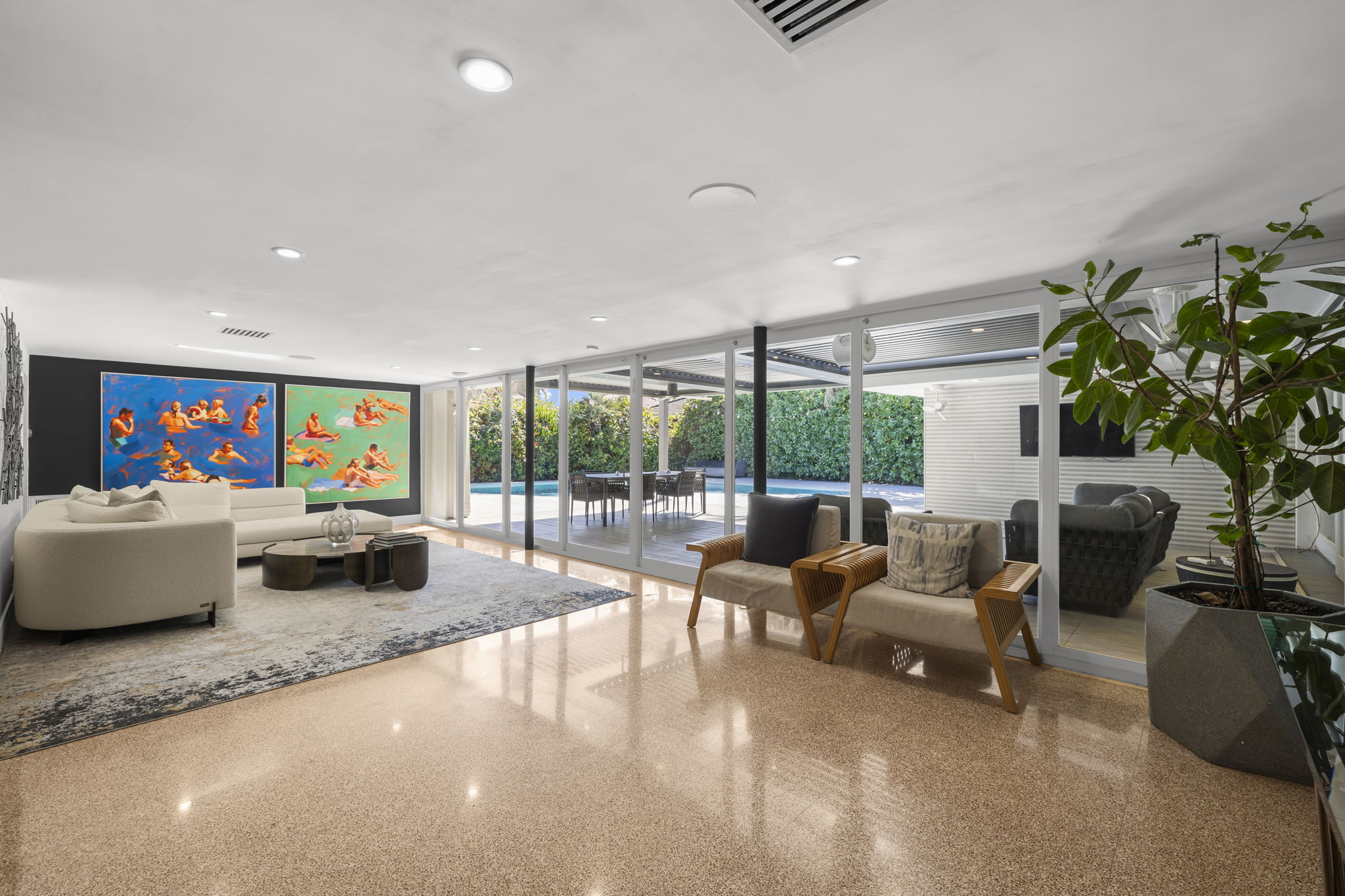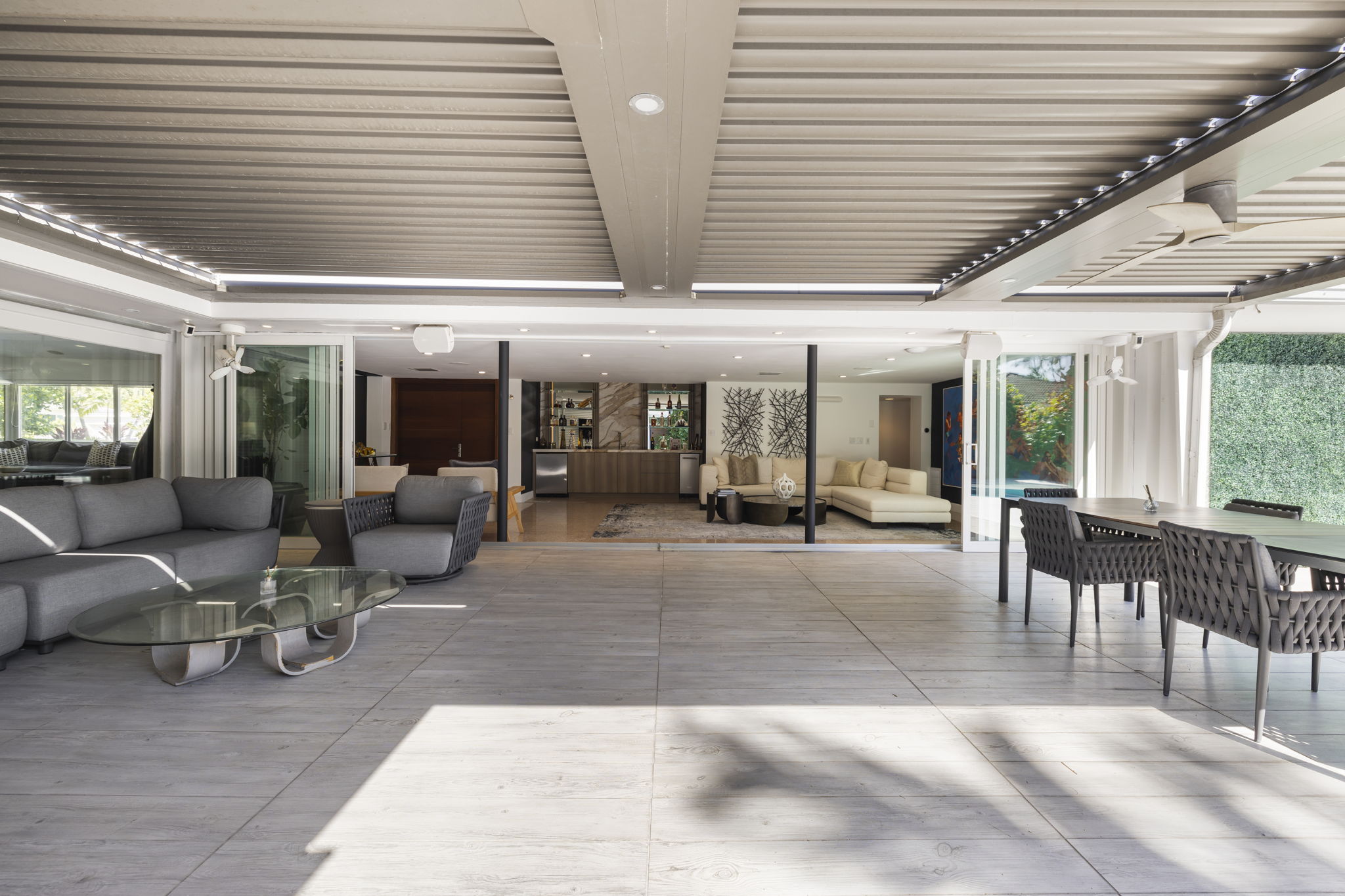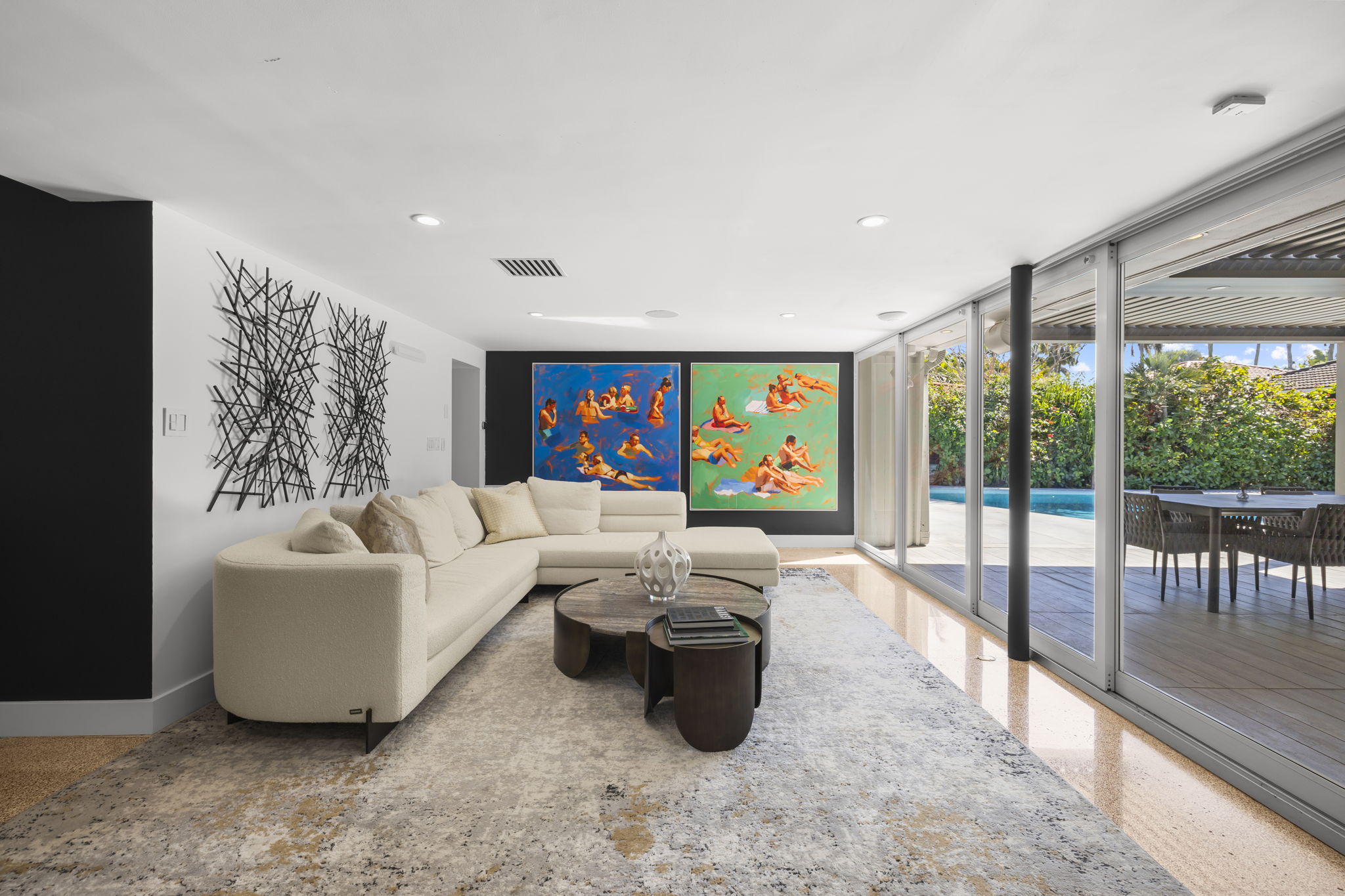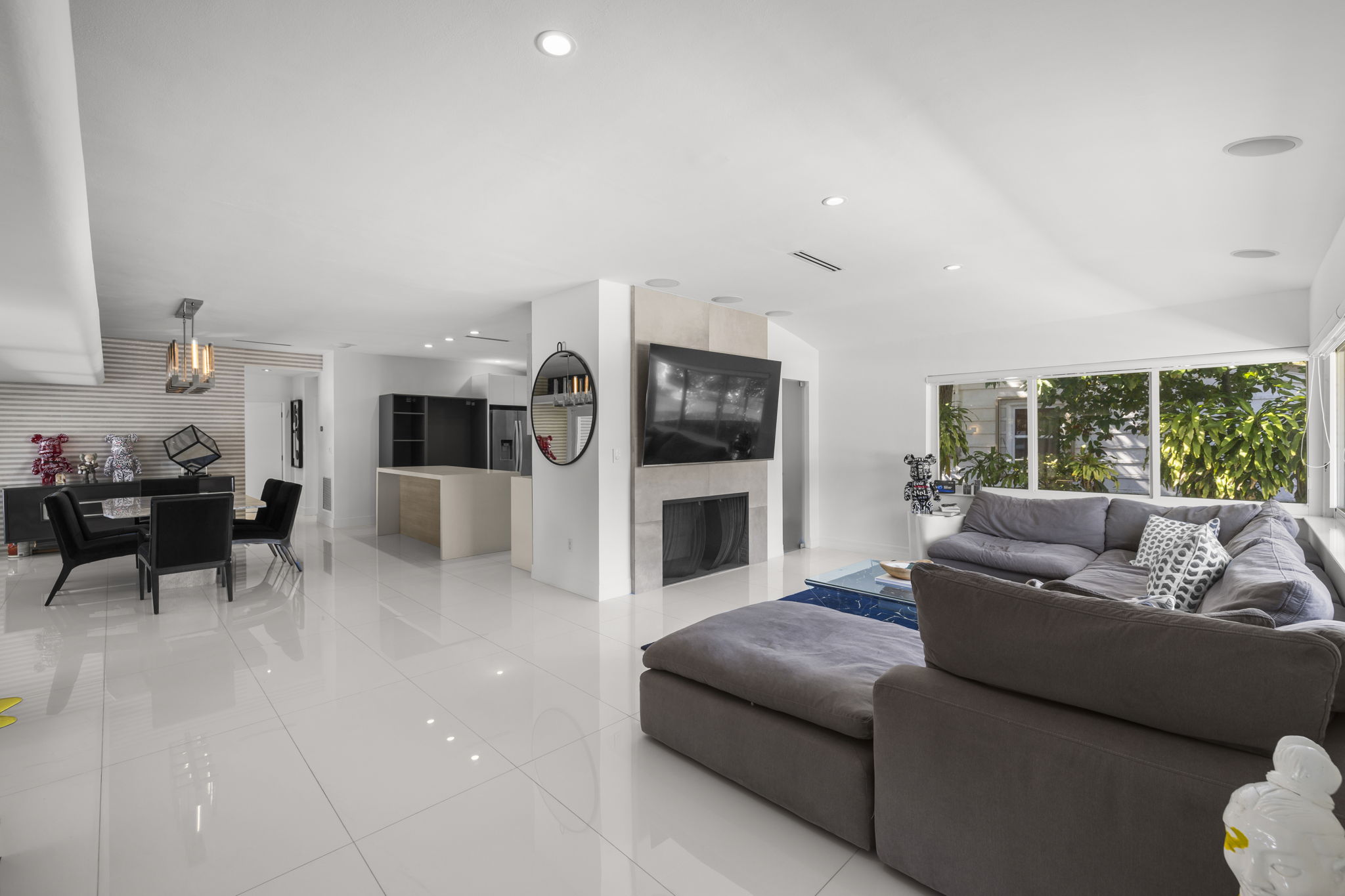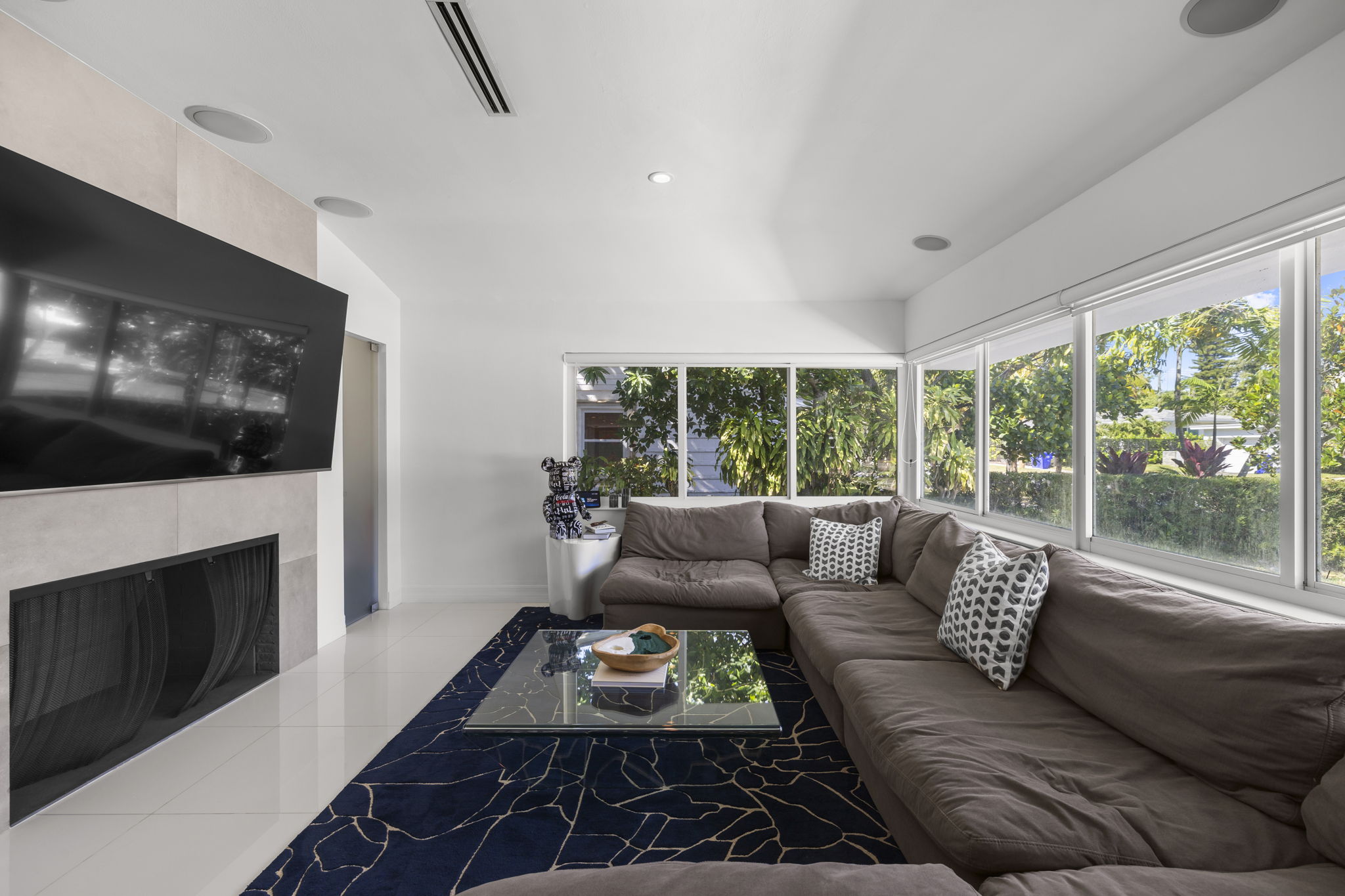 The outdoor space is thoughtfully designed to take advantage of the South Florida climate, featuring a saltwater pool, covered lounge areas, and new patio stonework, complemented by astroturf landscaping for low maintenance. Integrated surround sound speakers throughout the interior and exterior ensure an enjoyable entertainment experience, whether hosting friends or simply unwinding at home.