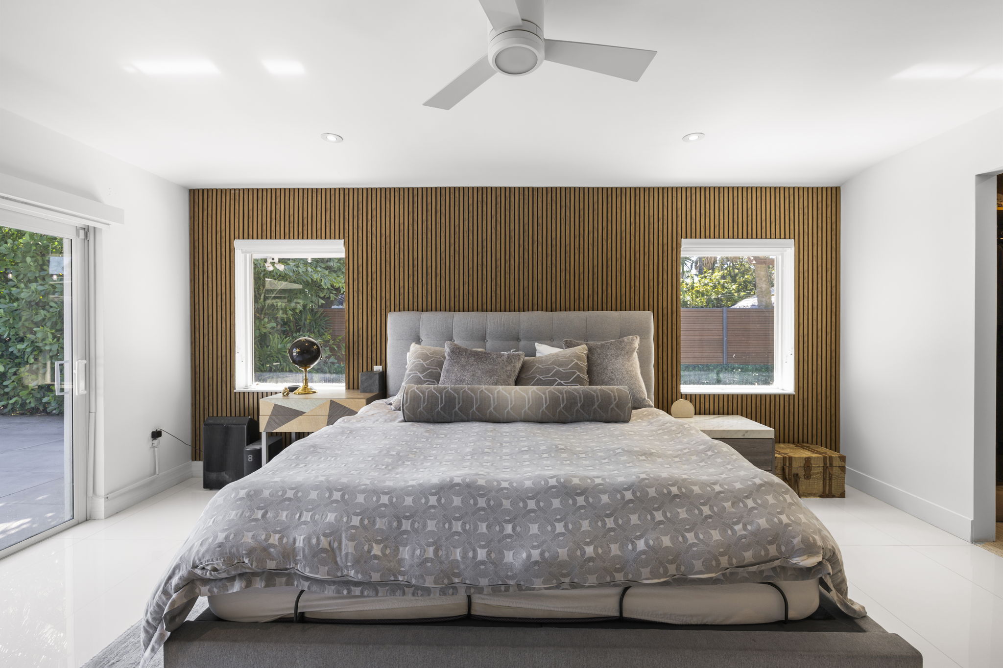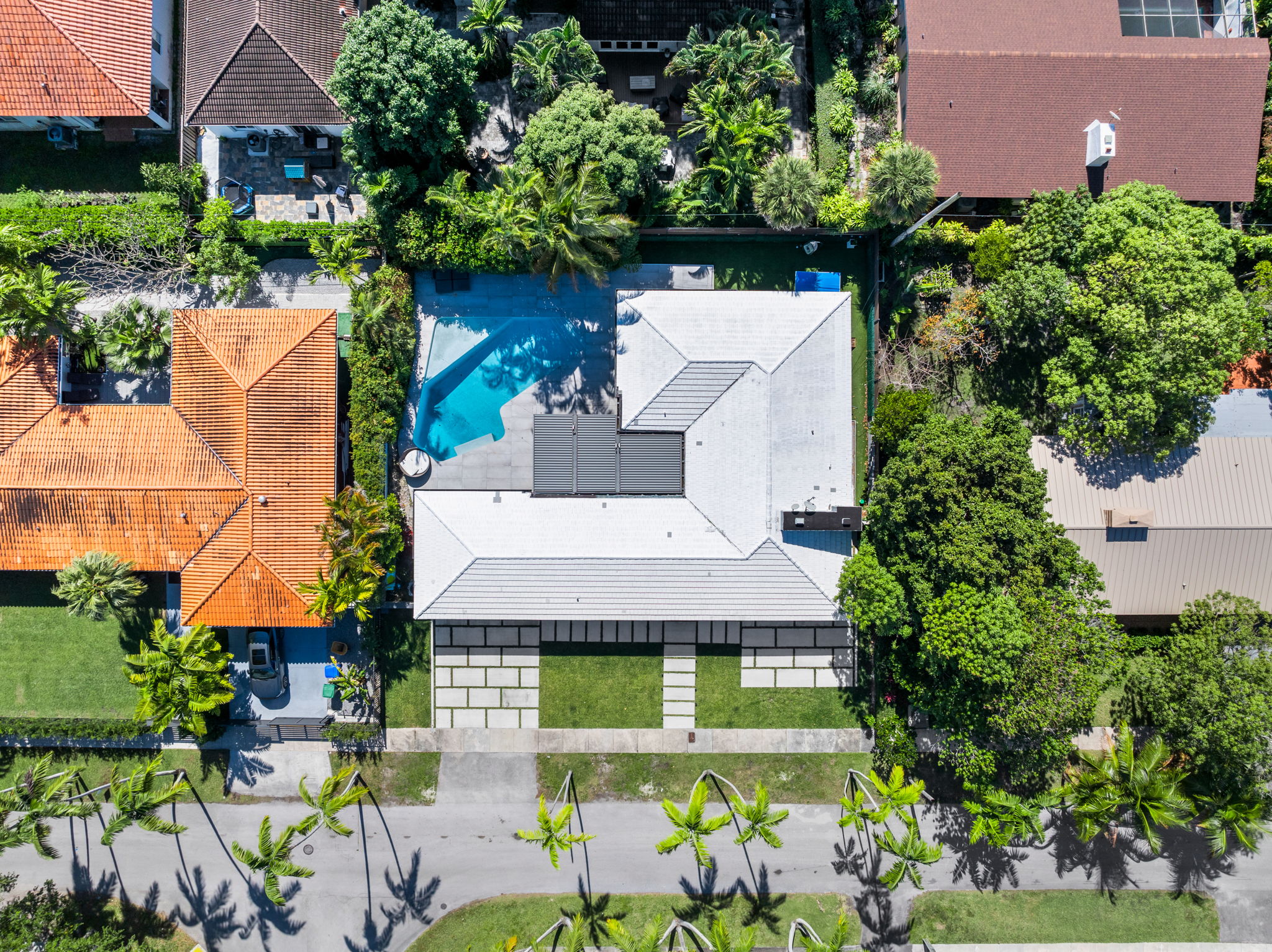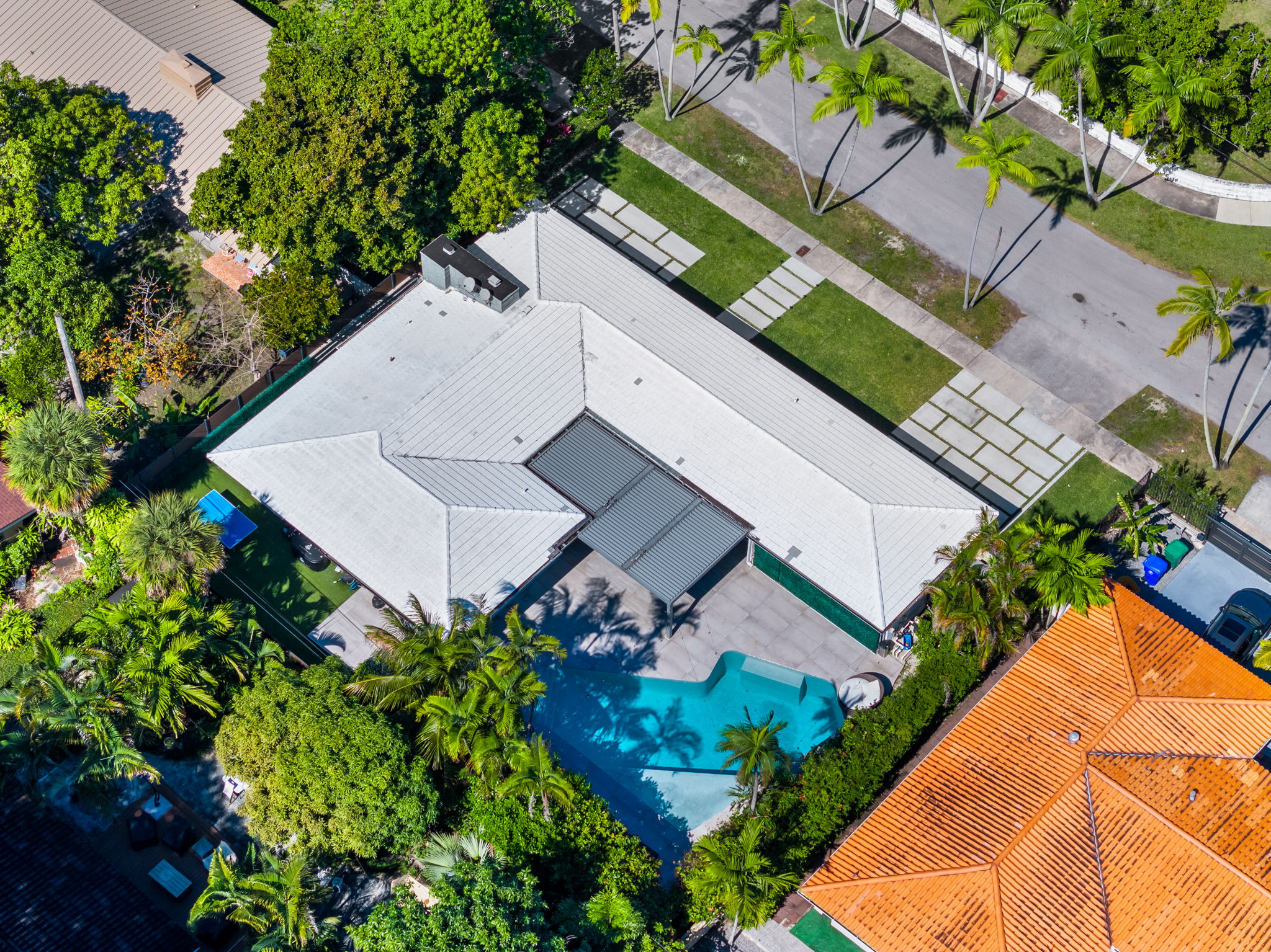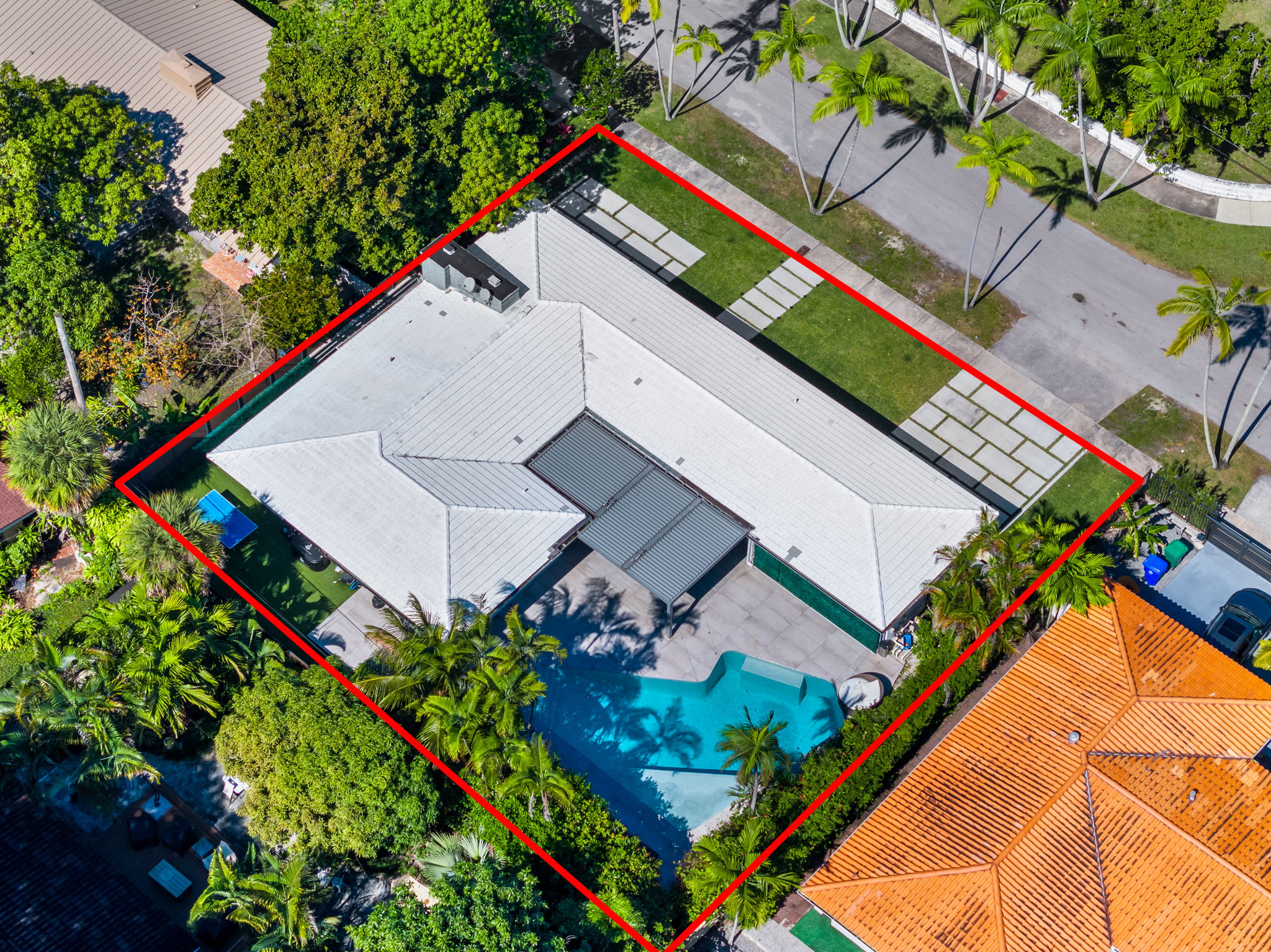 The outdoor space is thoughtfully designed to take advantage of the South Florida climate, featuring a saltwater pool, covered lounge areas, and new patio stonework, complemented by astroturf landscaping for low maintenance. Integrated surround sound speakers throughout the interior and exterior ensure an enjoyable entertainment experience, whether hosting friends or simply unwinding at home.