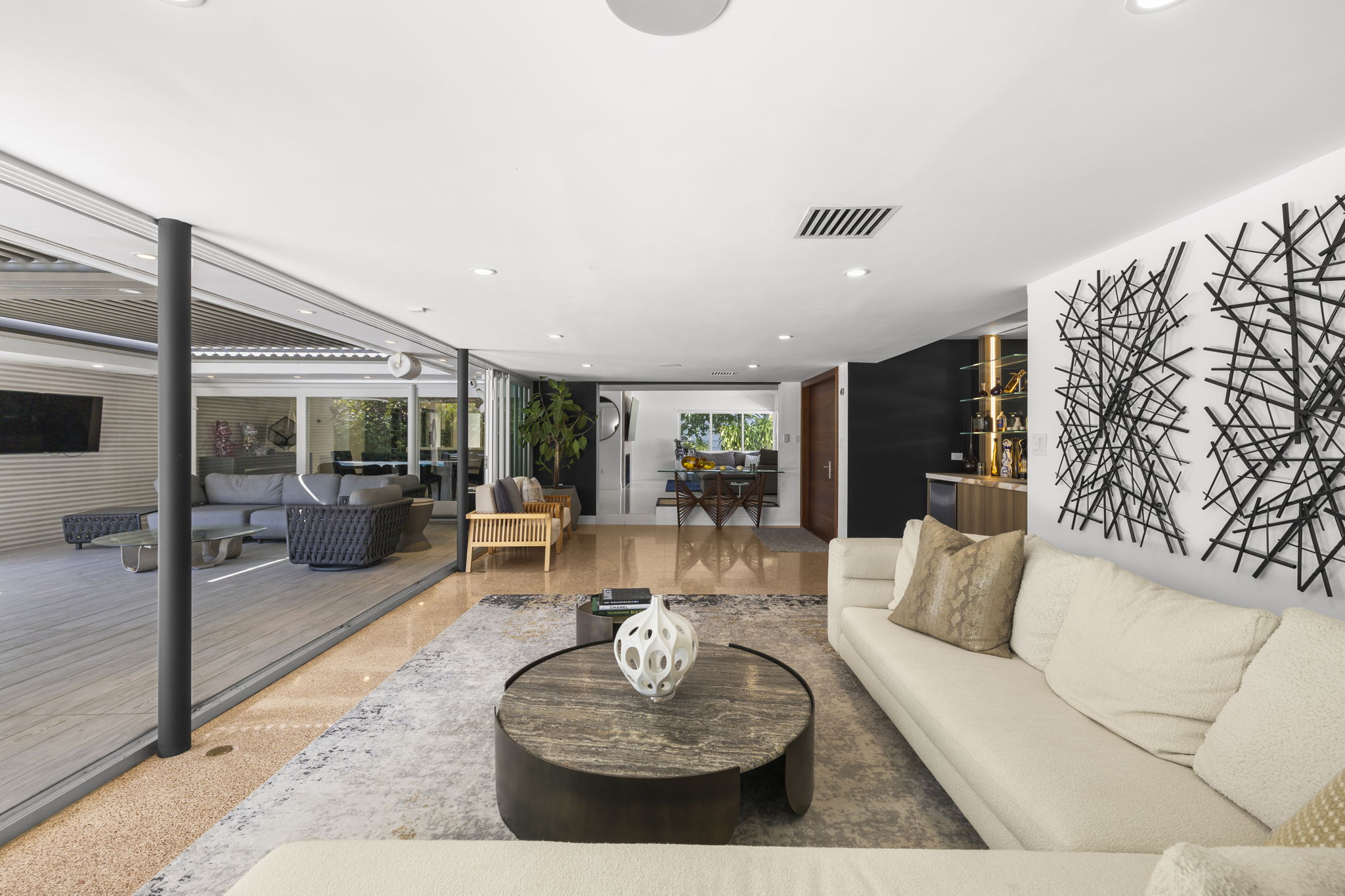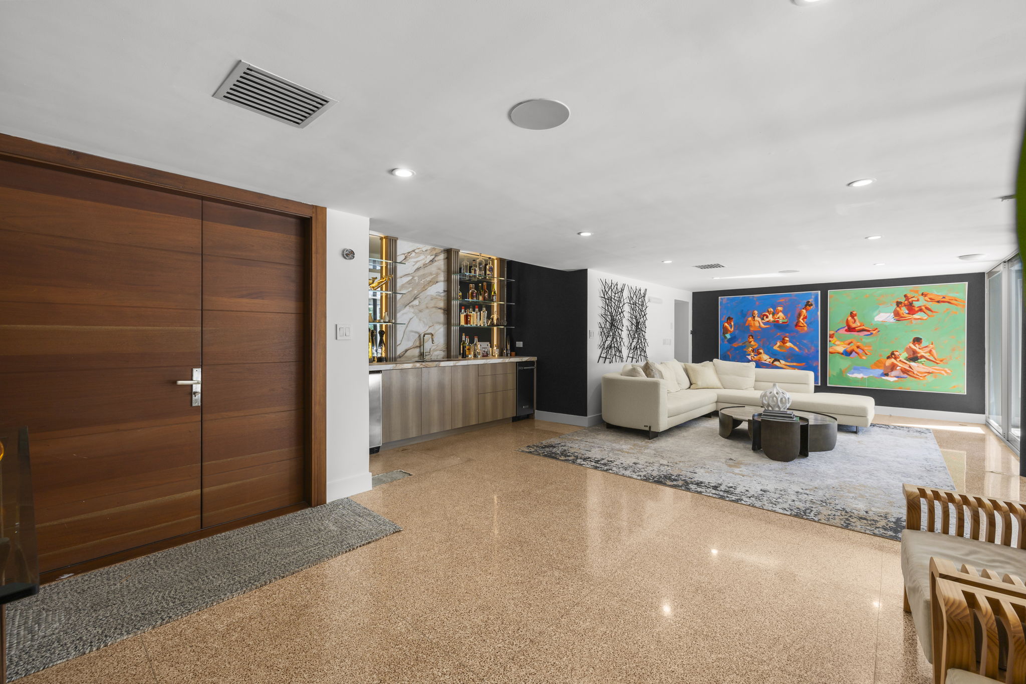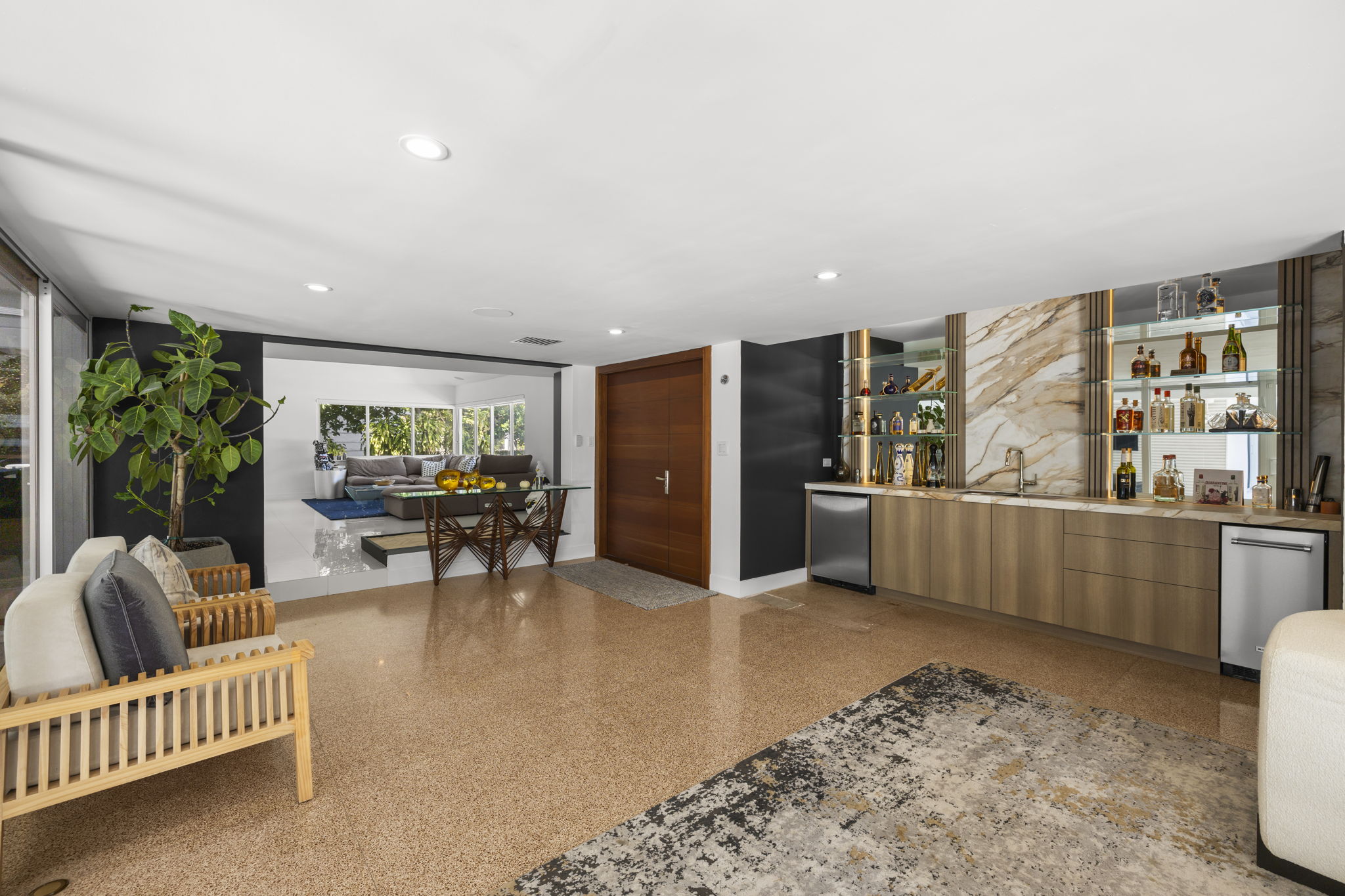 This meticulously upgraded residence presents a perfect blend of timeless design and modern amenities, embodying the essence of South Florida living. Spanning 2,988 square feet, it offers two spacious bedrooms and three well-appointed bathrooms, providing ample space for both comfort and entertainment. The stylish terrazzo and white tile flooring throughout enhances the home’s contemporary aesthetic.