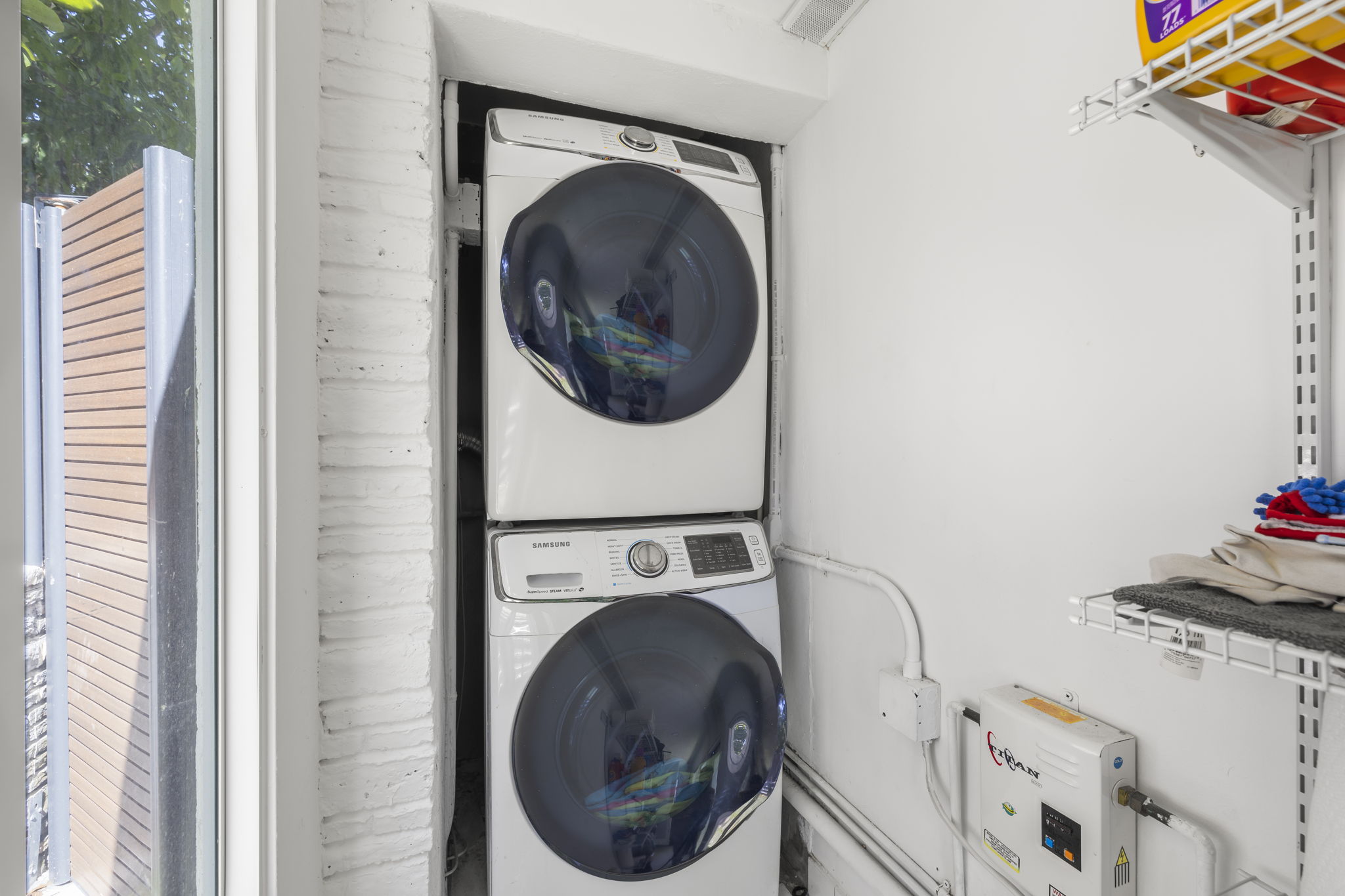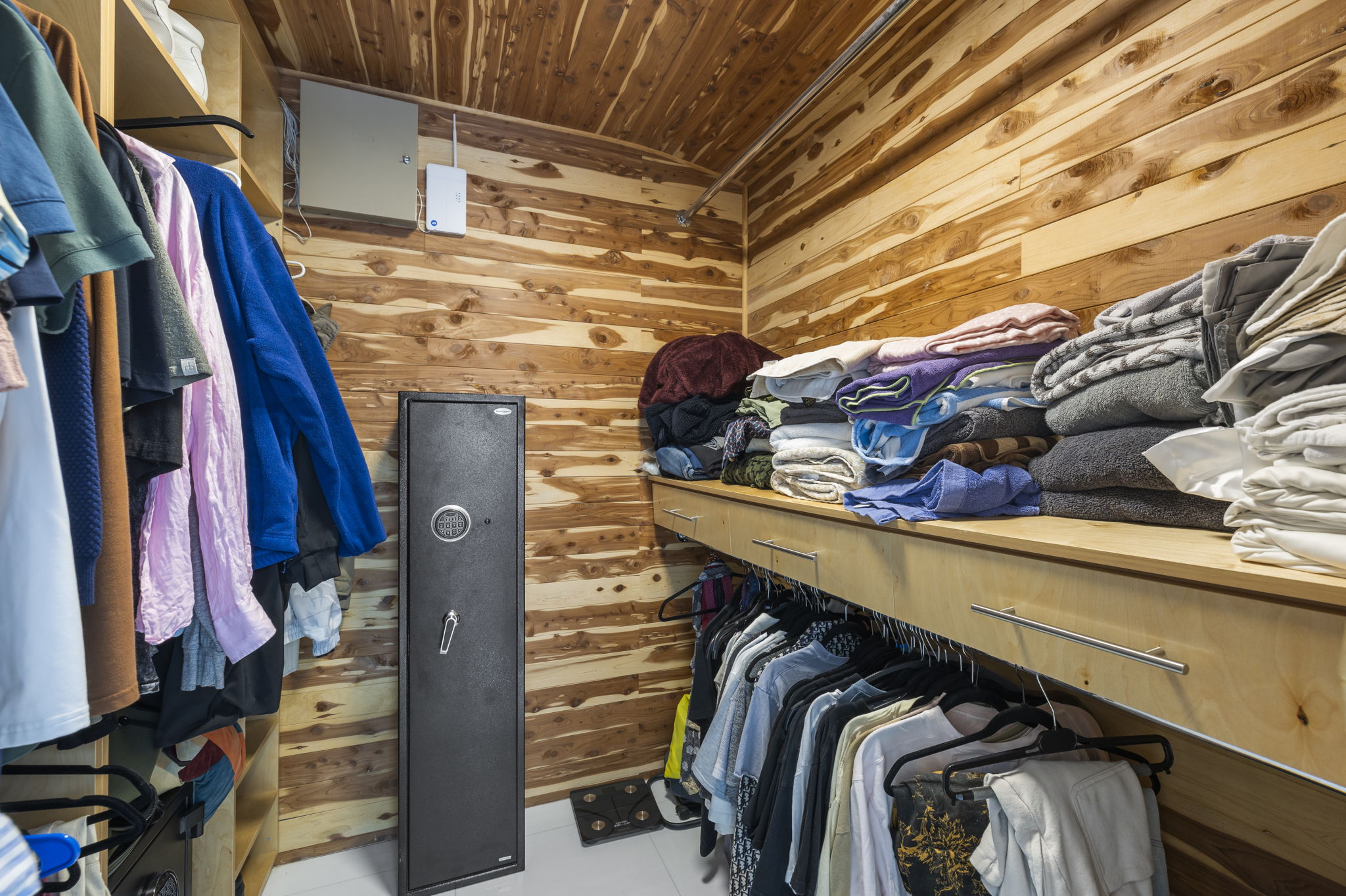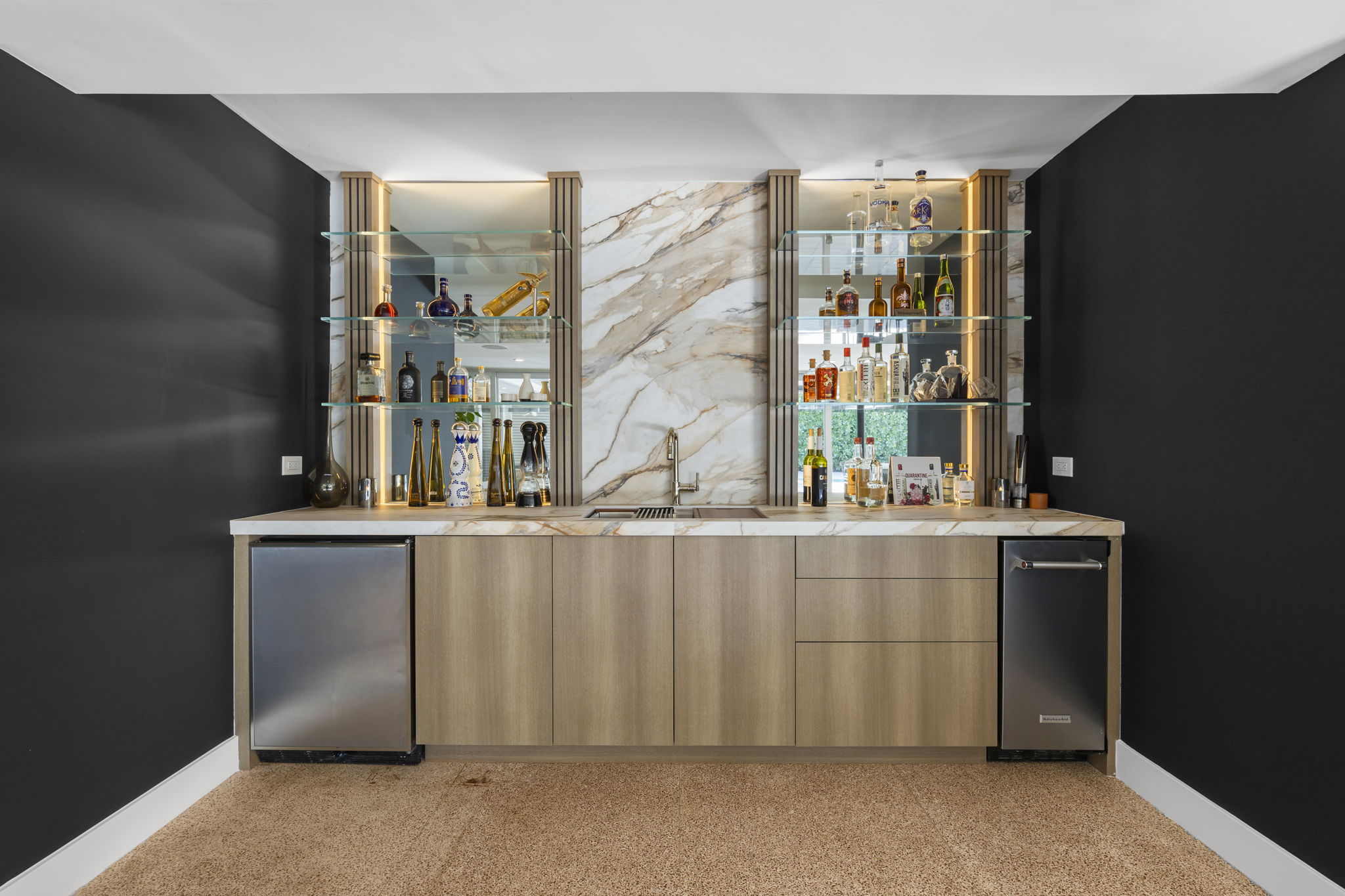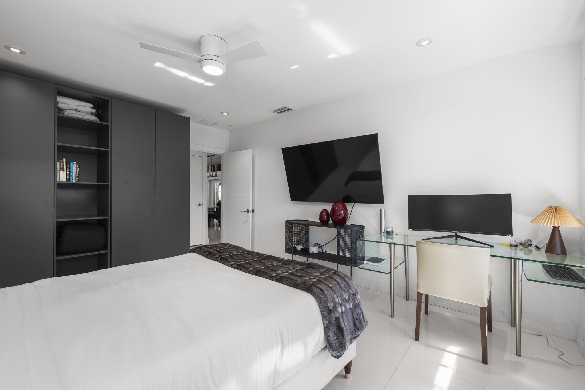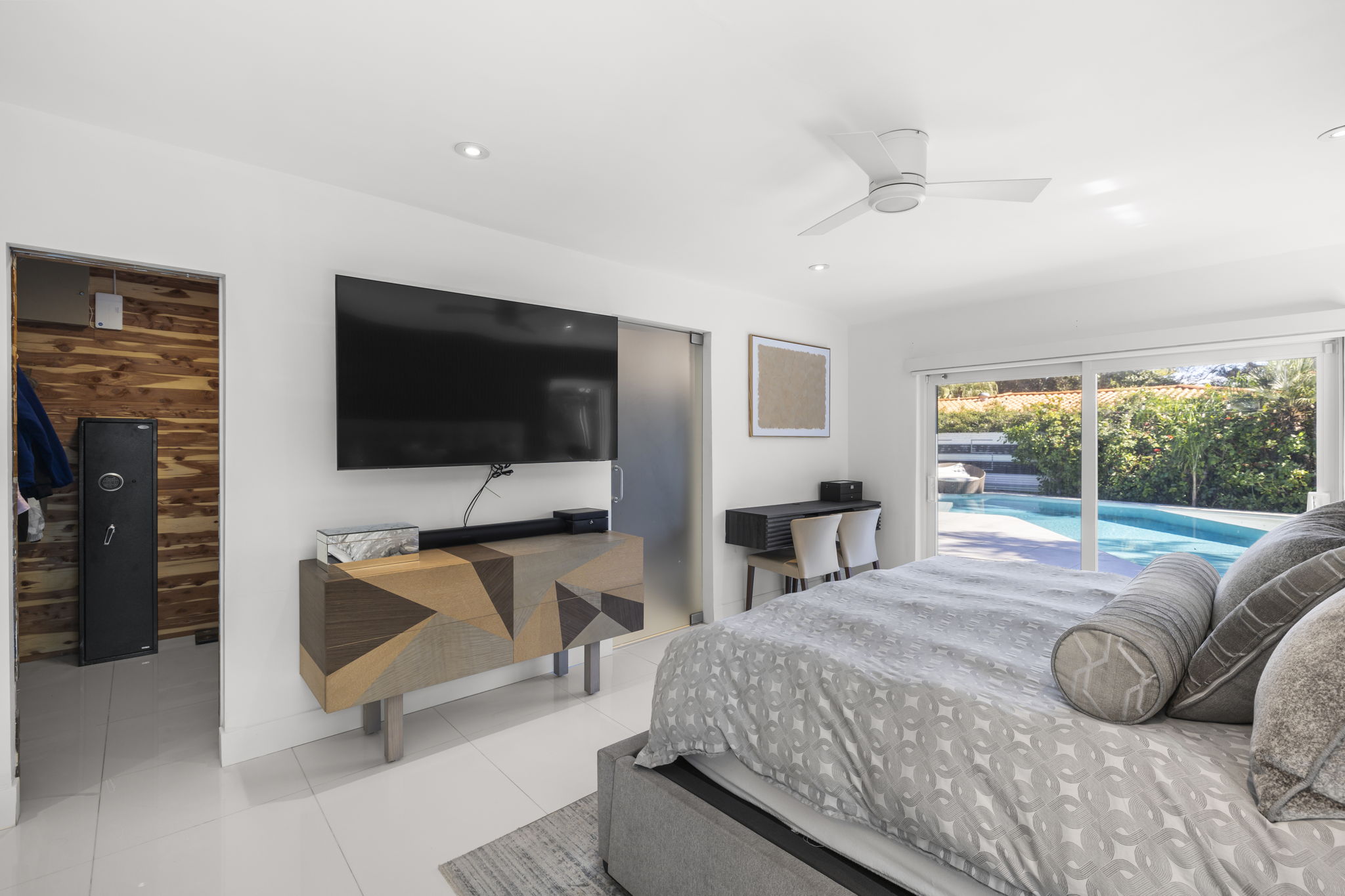 A highlight of the property is the dedicated entertainment room, featuring a fully customized wet bar that sets the stage for memorable gatherings. The primary suite includes two custom walk-in closets and sliding glass doors that lead to a tranquil backyard retreat, elevating the sense of privacy and relaxation. Security is prioritized with a fingerprint-access automatic door lock, ensuring peace of mind for residents.