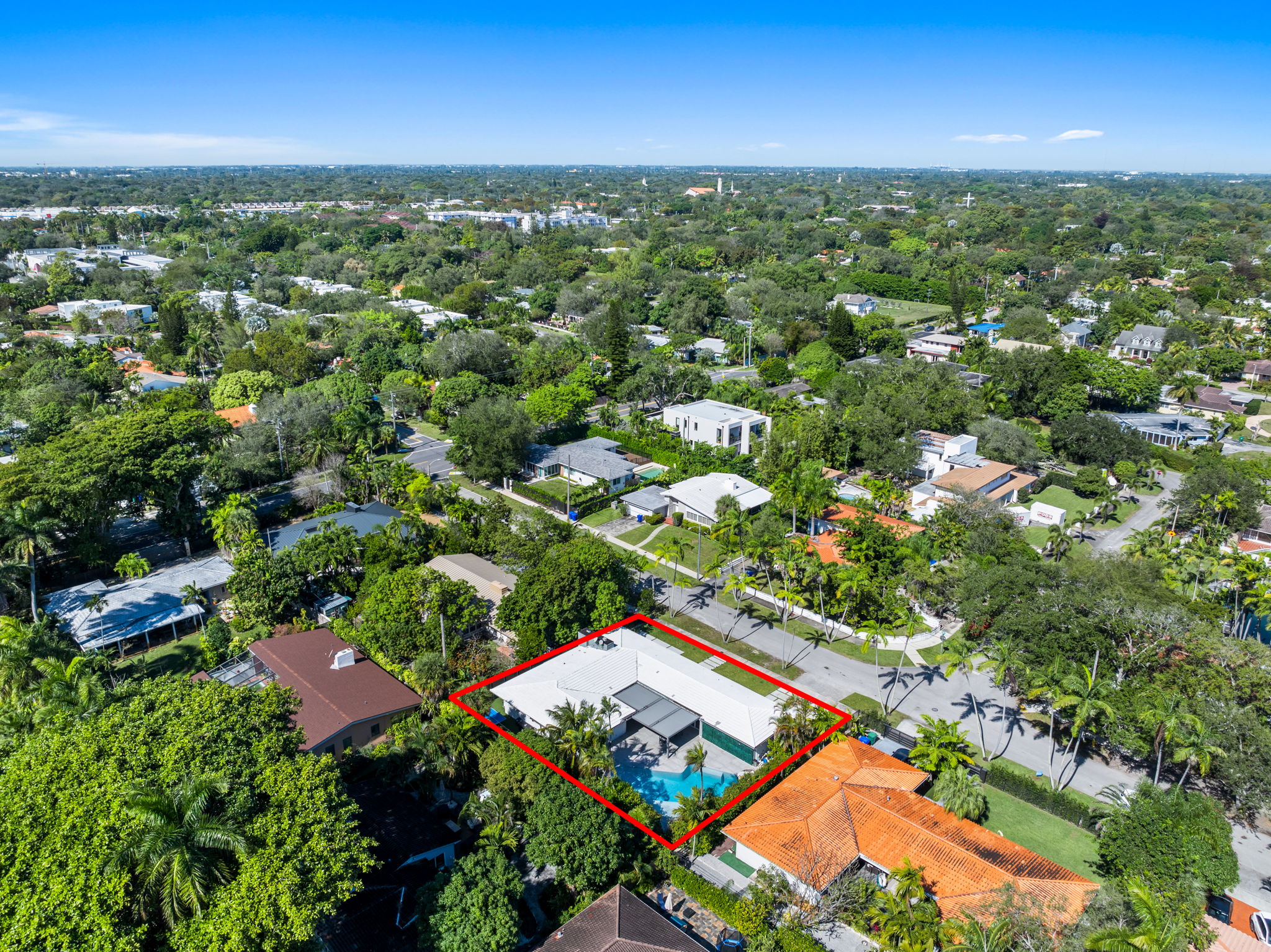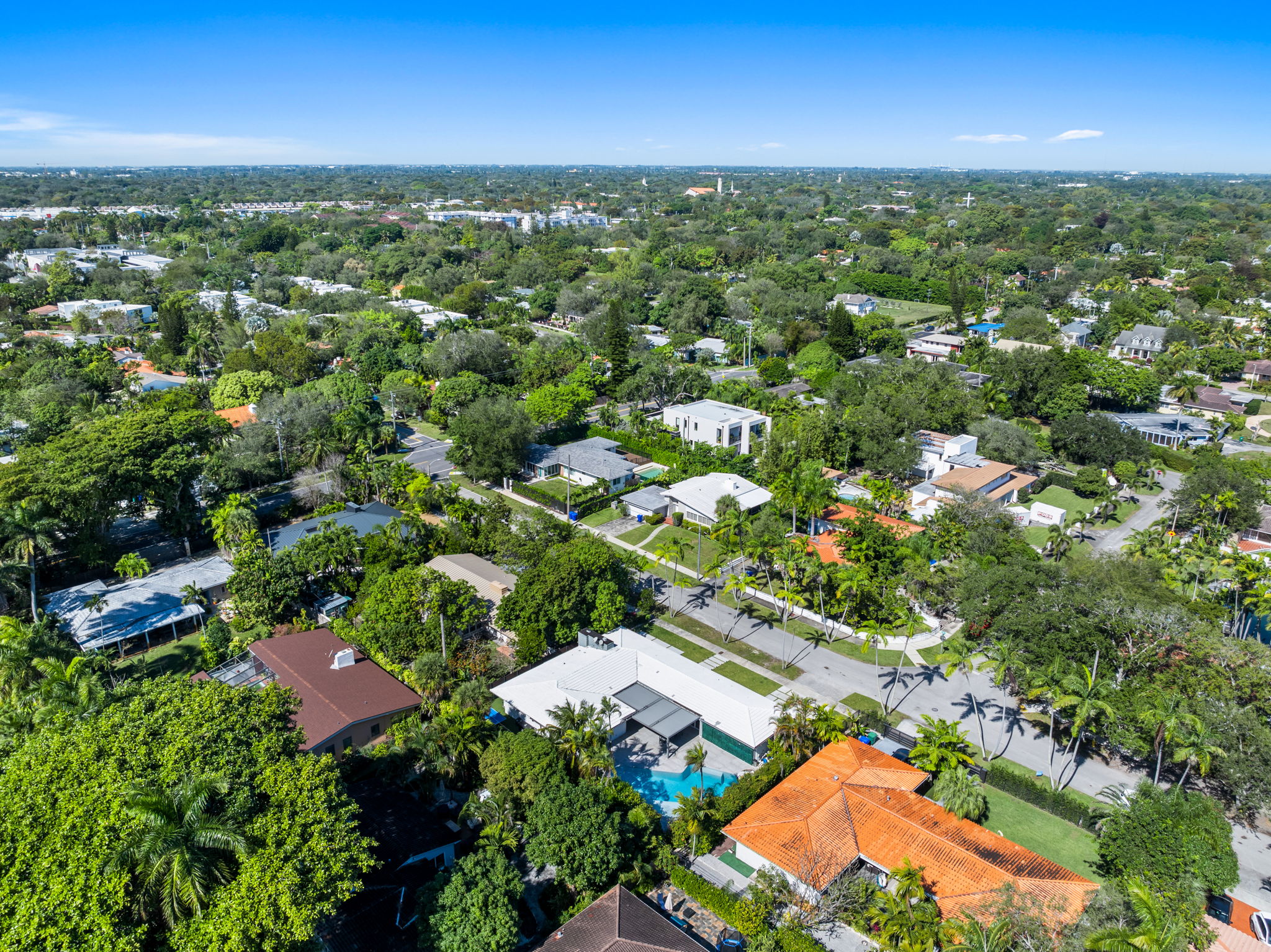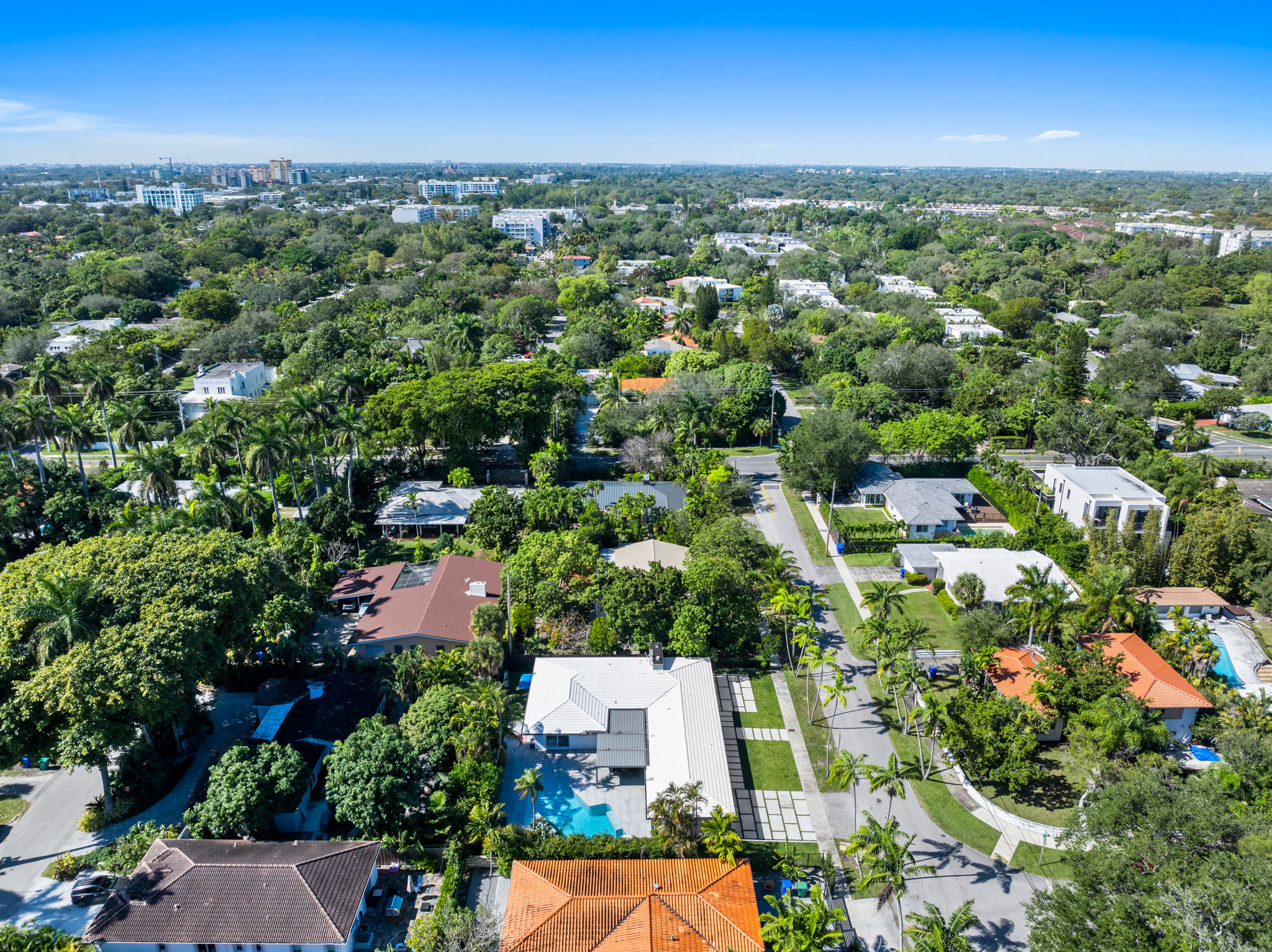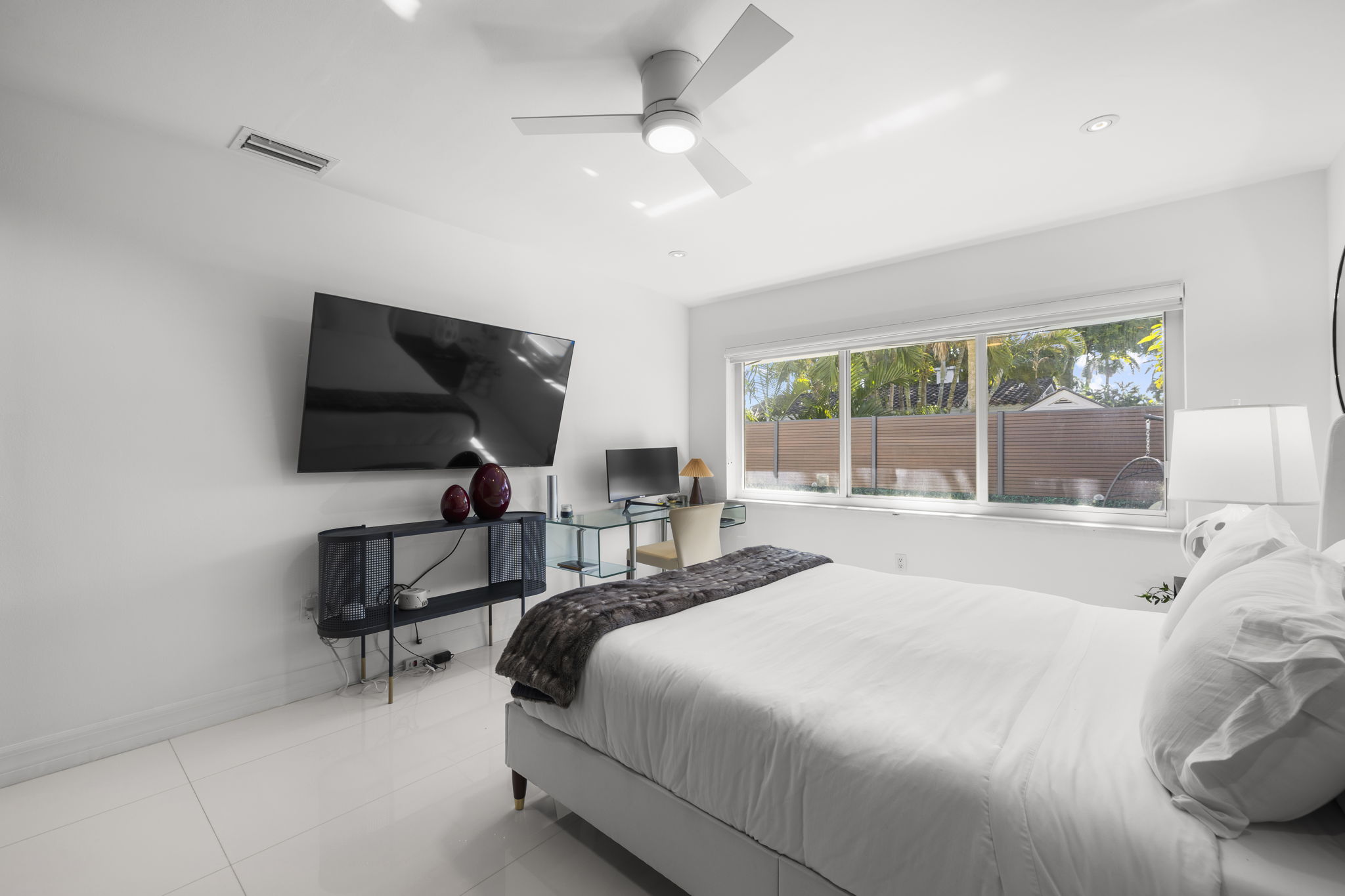 Additional amenities include a two-car covered garage, a conveniently located laundry room, a full security camera system, and high-impact windows designed to enhance safety. This residence stands as a testament to elegant living, making it a prime choice for those seeking a stylish and functional home in Miami.