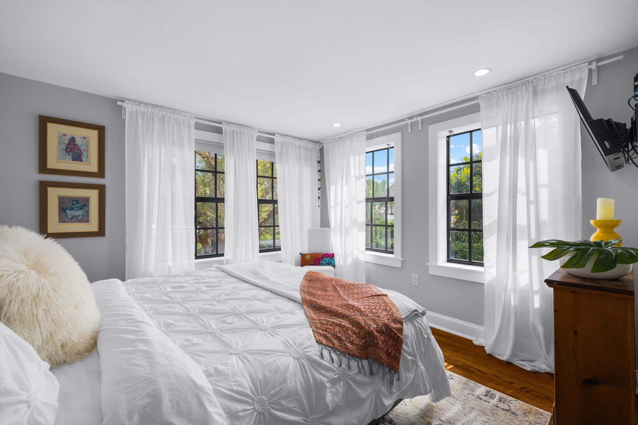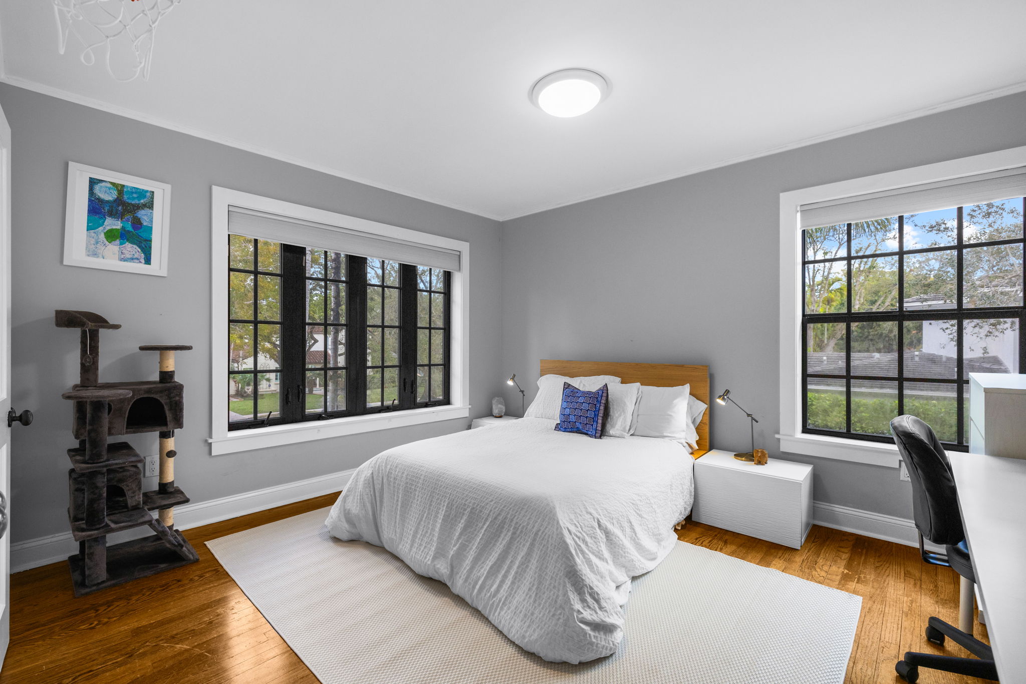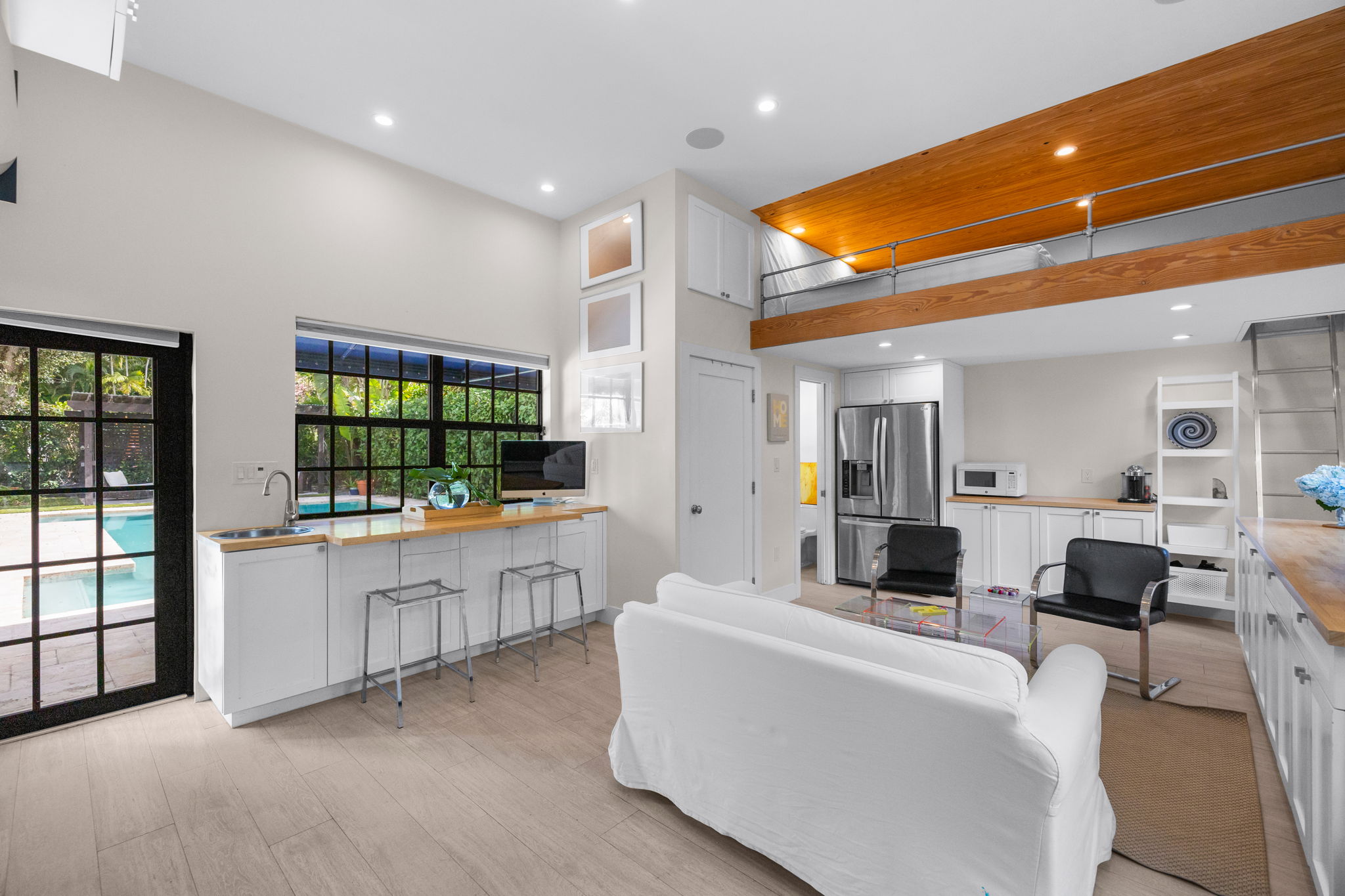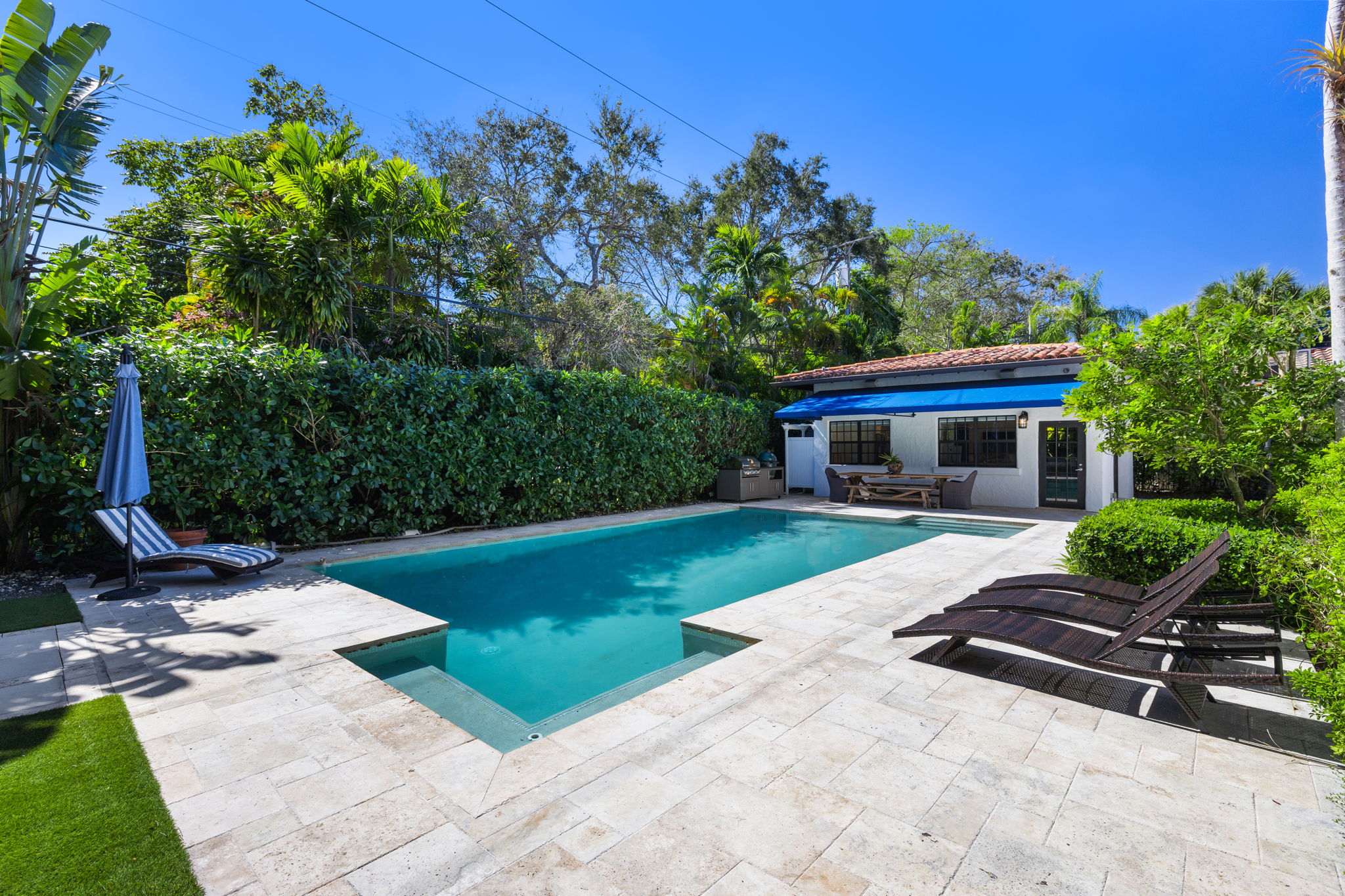 For those who appreciate outdoor living, the property showcases a large pool surrounded by generous green space, making it ideal for relaxation and entertaining. Additionally, a detached, air-conditioned flex space provides 411 square feet of potential, suitable for various uses such as a studio, gym, office, or guest suite.