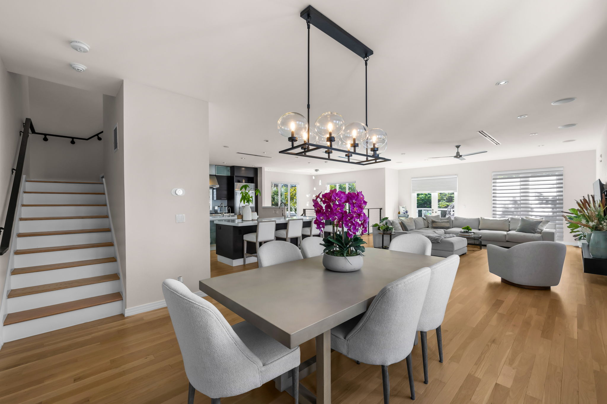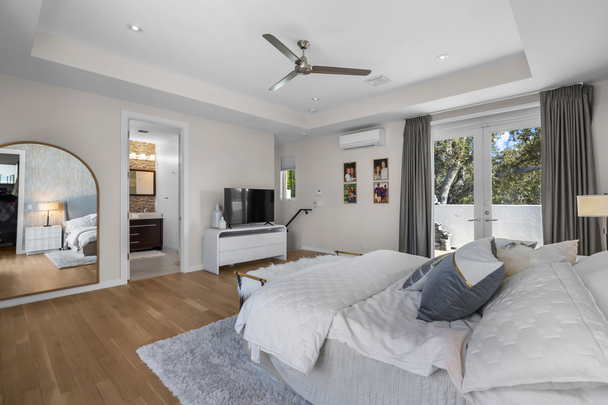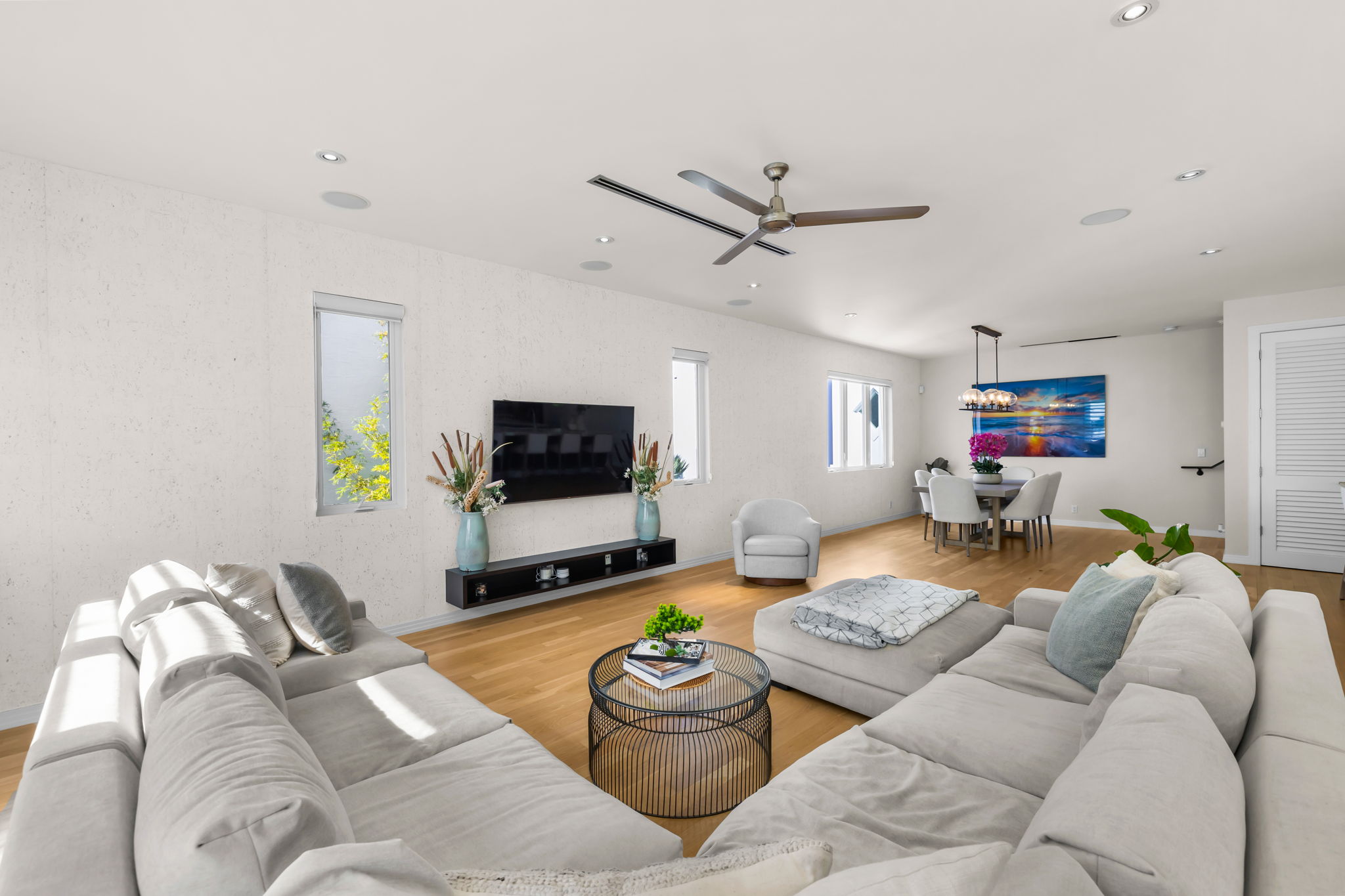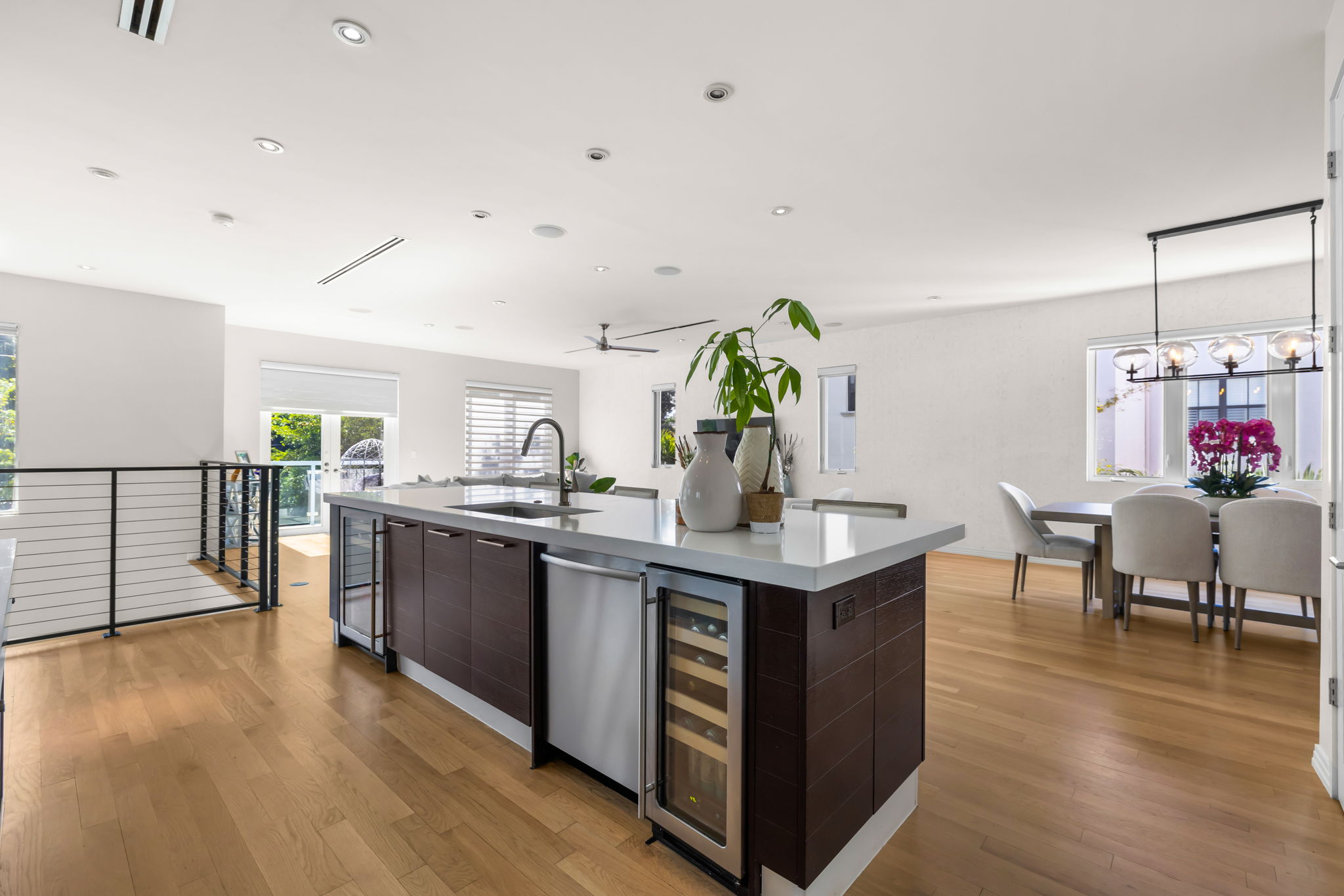 The second-floor living area seamlessly integrates the kitchen, dining, and living spaces, creating a warm, inviting environment. The chef's kitchen is equipped with a natural gas range, dual islands, and quartz countertops, complemented by high-end appliances that cater to culinary enthusiasts. The primary suite serves as a personal retreat, showcasing dual walk-in closets and a luxurious spa-inspired bathroom with a separate tub and shower, along with private terraces for relaxation.