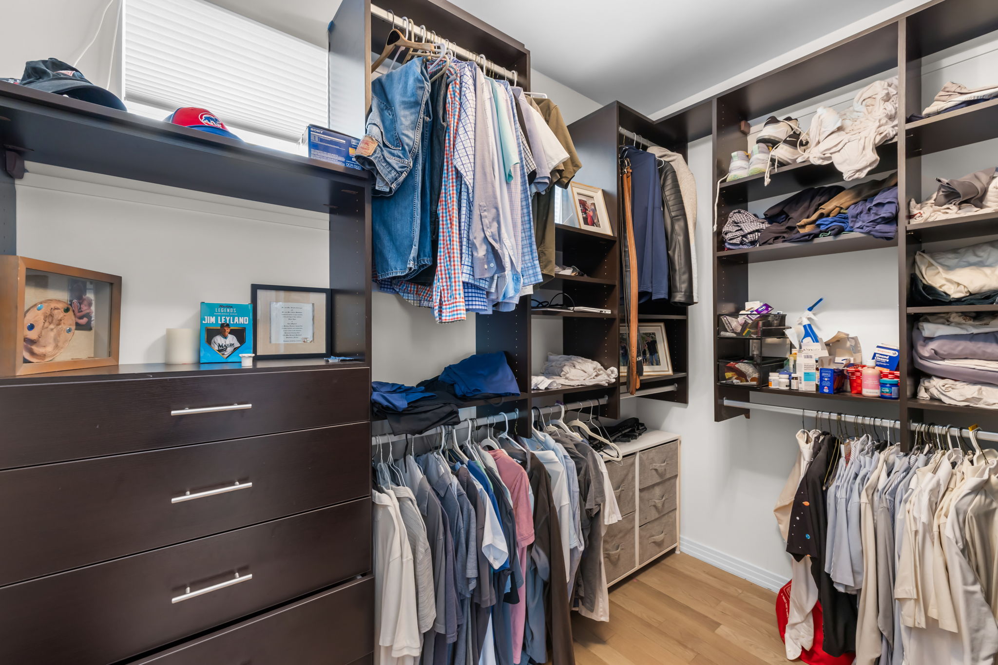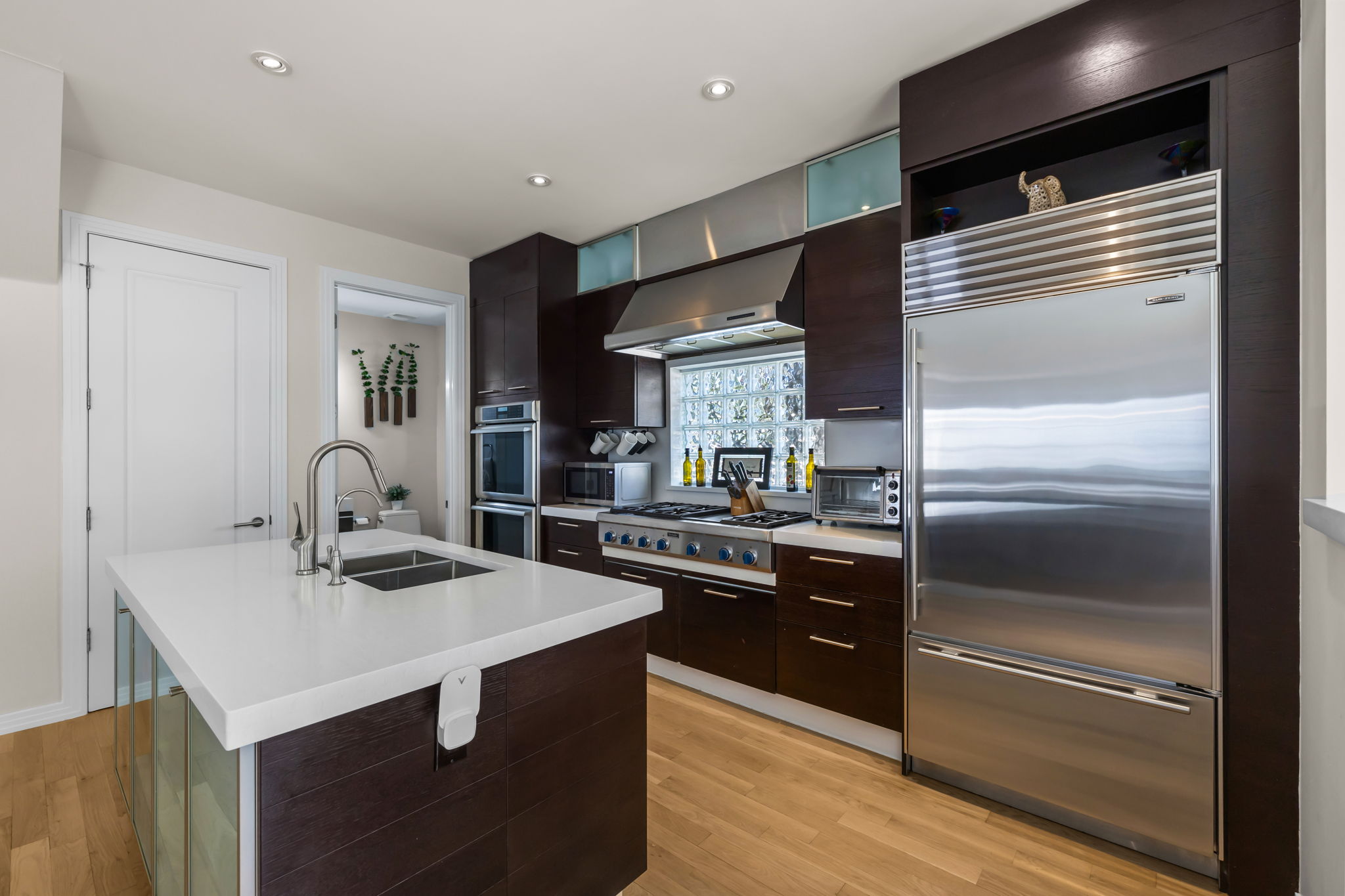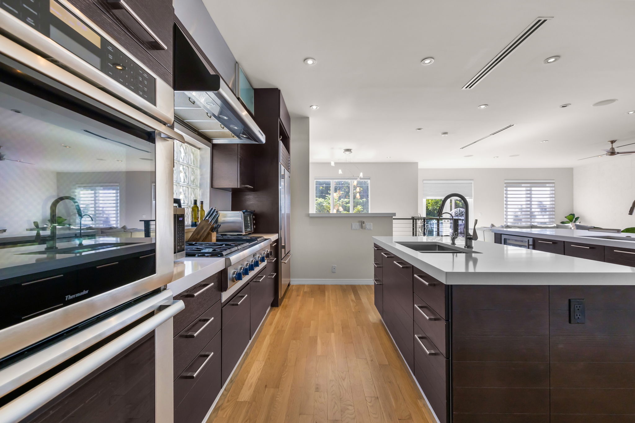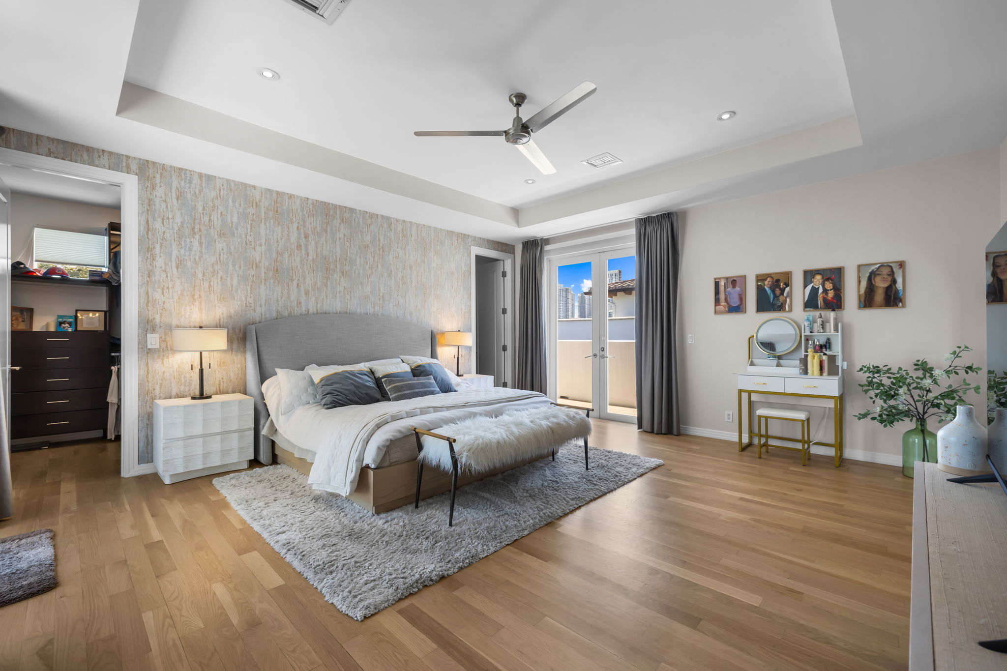 The second-floor living area seamlessly integrates the kitchen, dining, and living spaces, creating a warm, inviting environment. The chef's kitchen is equipped with a natural gas range, dual islands, and quartz countertops, complemented by high-end appliances that cater to culinary enthusiasts. The primary suite serves as a personal retreat, showcasing dual walk-in closets and a luxurious spa-inspired bathroom with a separate tub and shower, along with private terraces for relaxation.