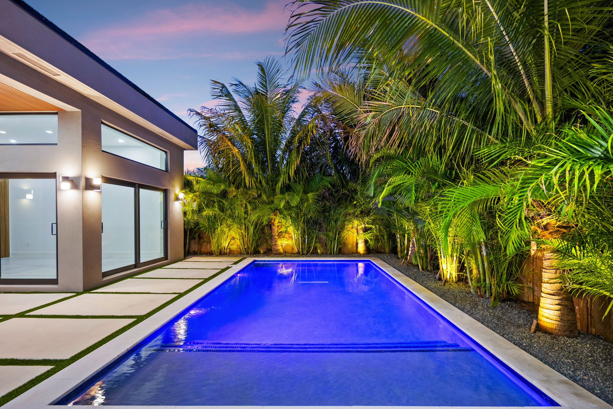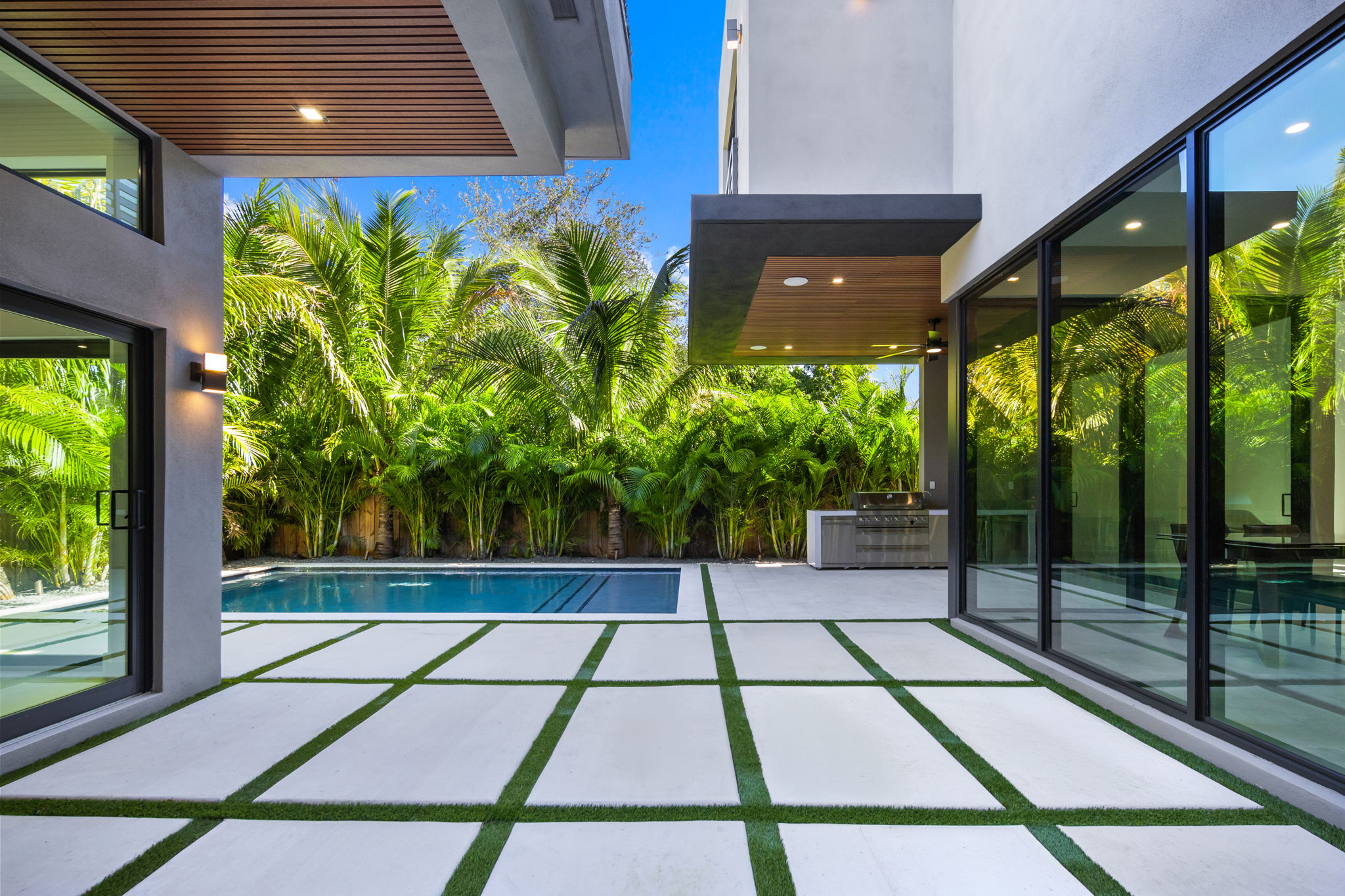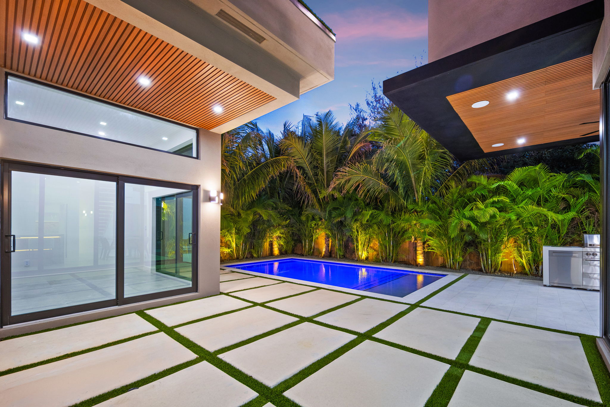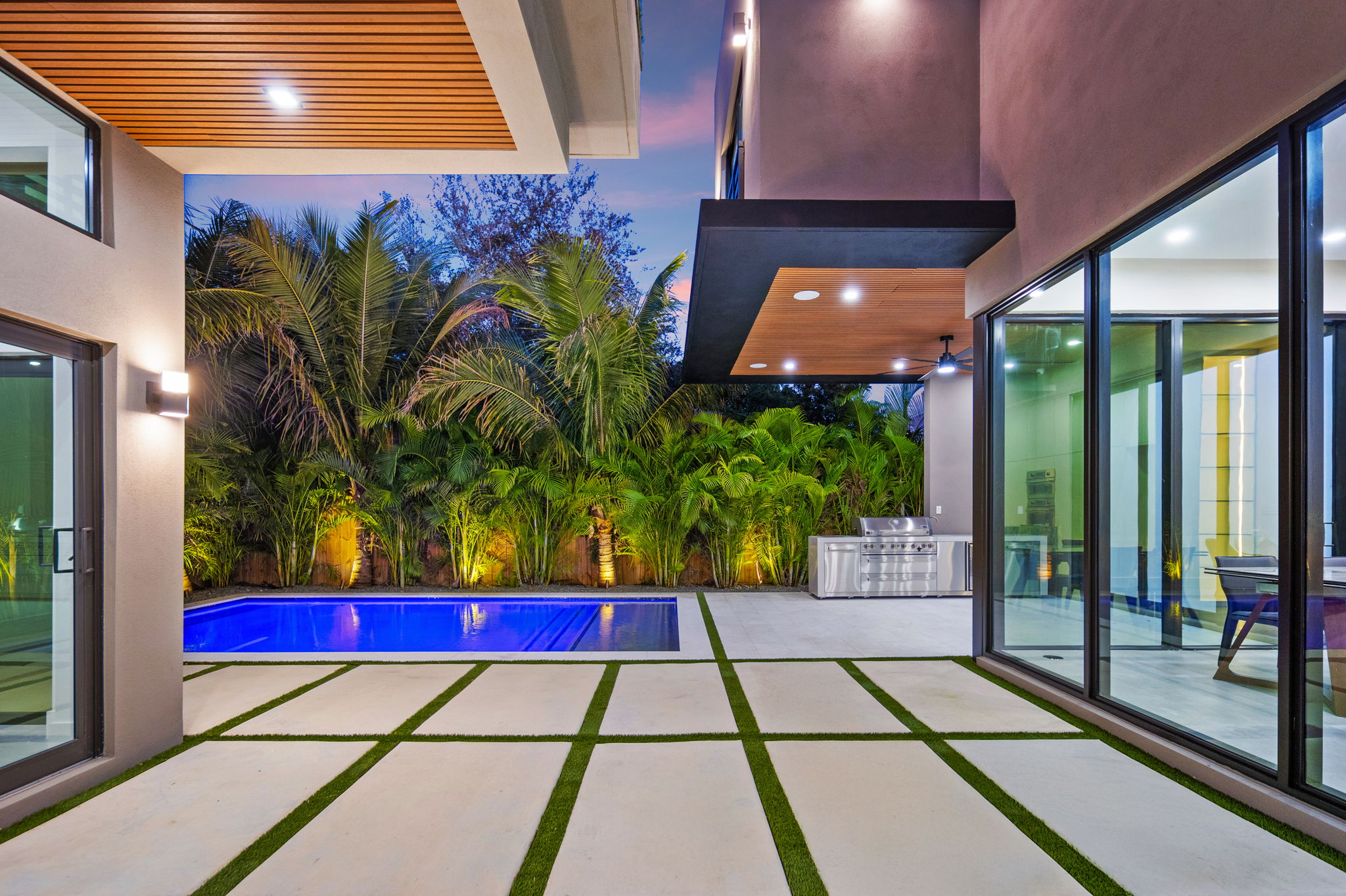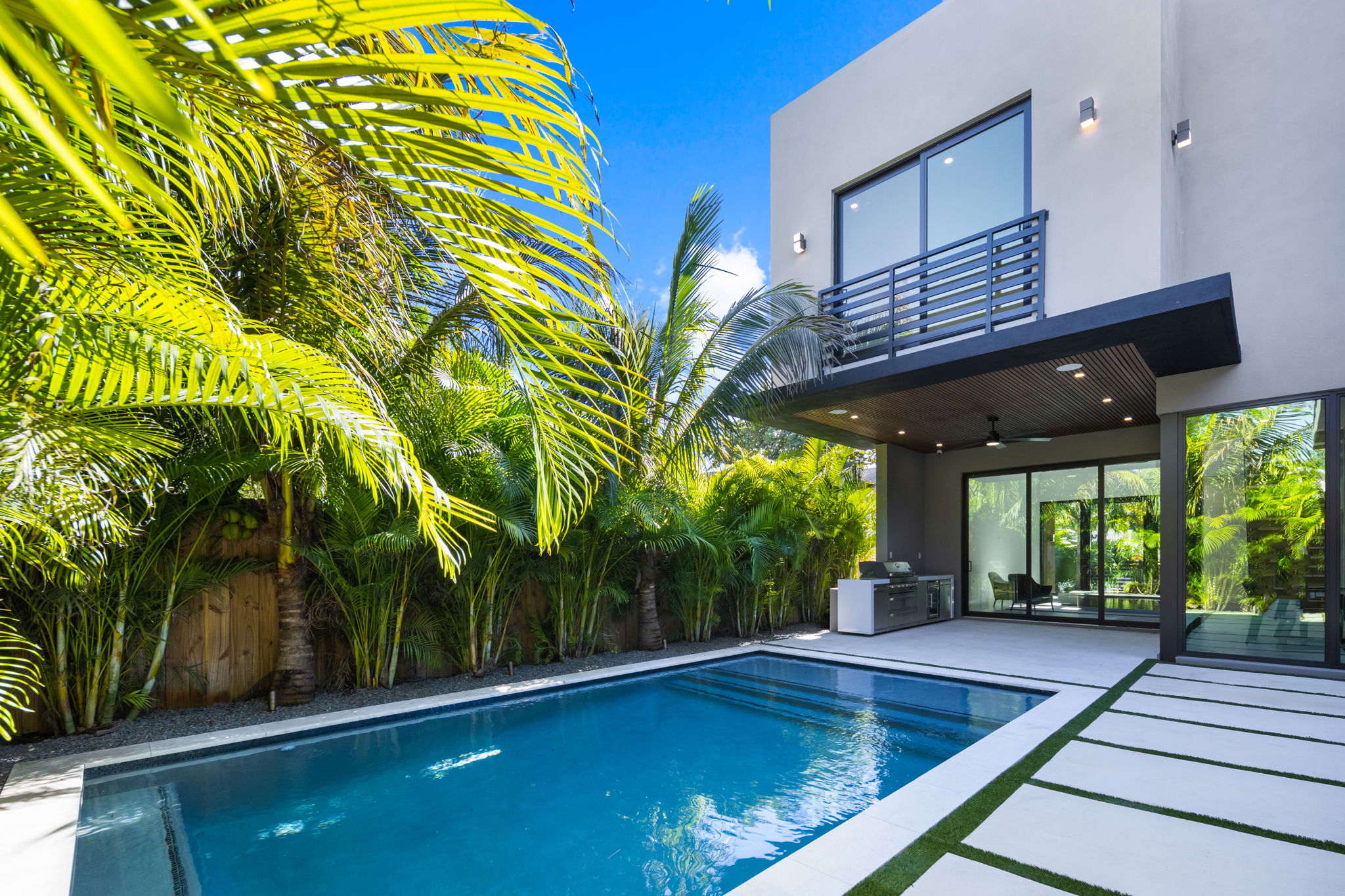 Outside, the inviting backyard is designed for relaxation and entertainment, featuring lush landscaping, a heated saltwater pool, an outdoor grill, and a guest house complete with a kitchenette and full bath. This space provides both privacy and convenience, ideal for hosting visitors or utilizing as a private retreat.