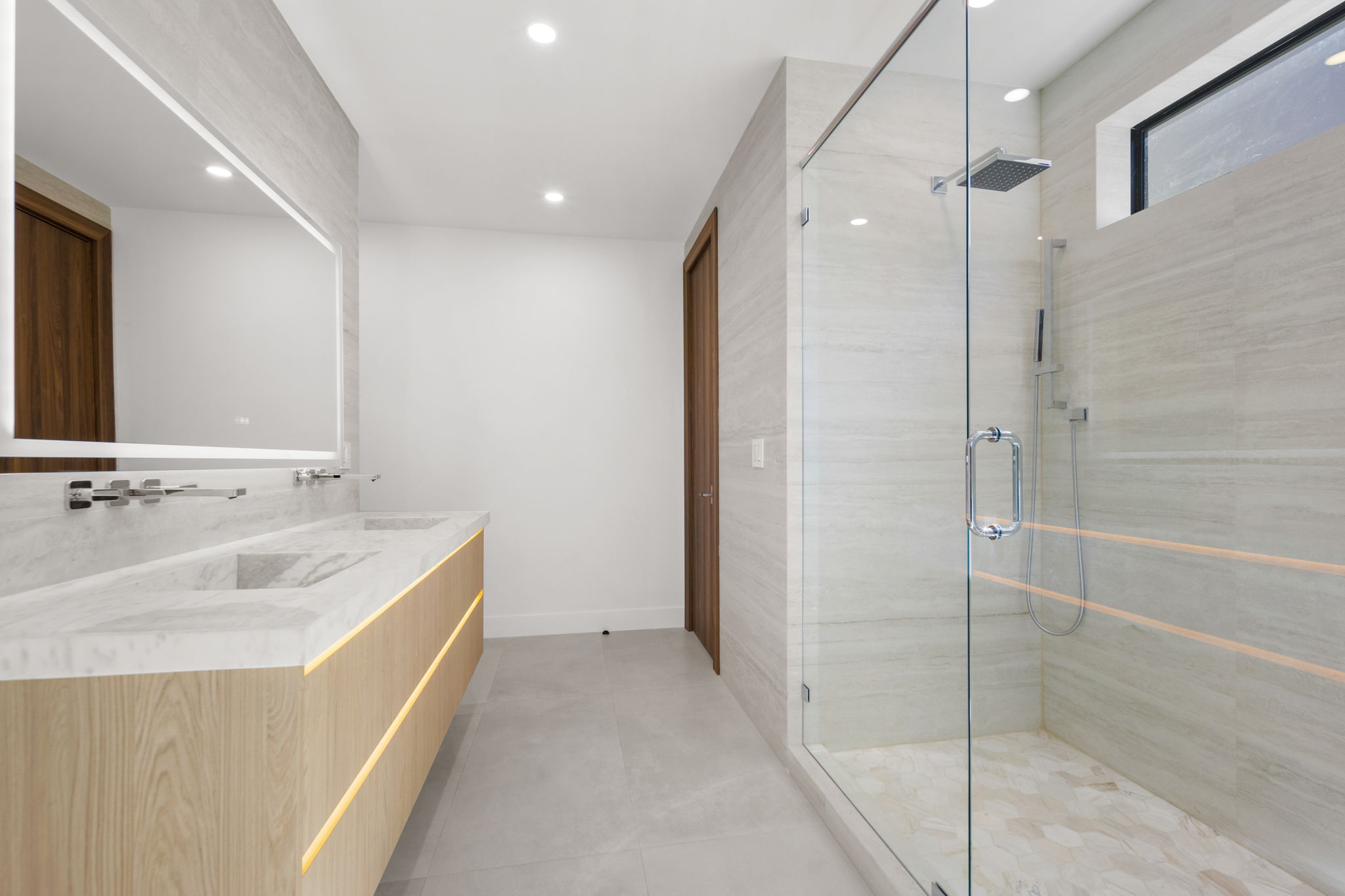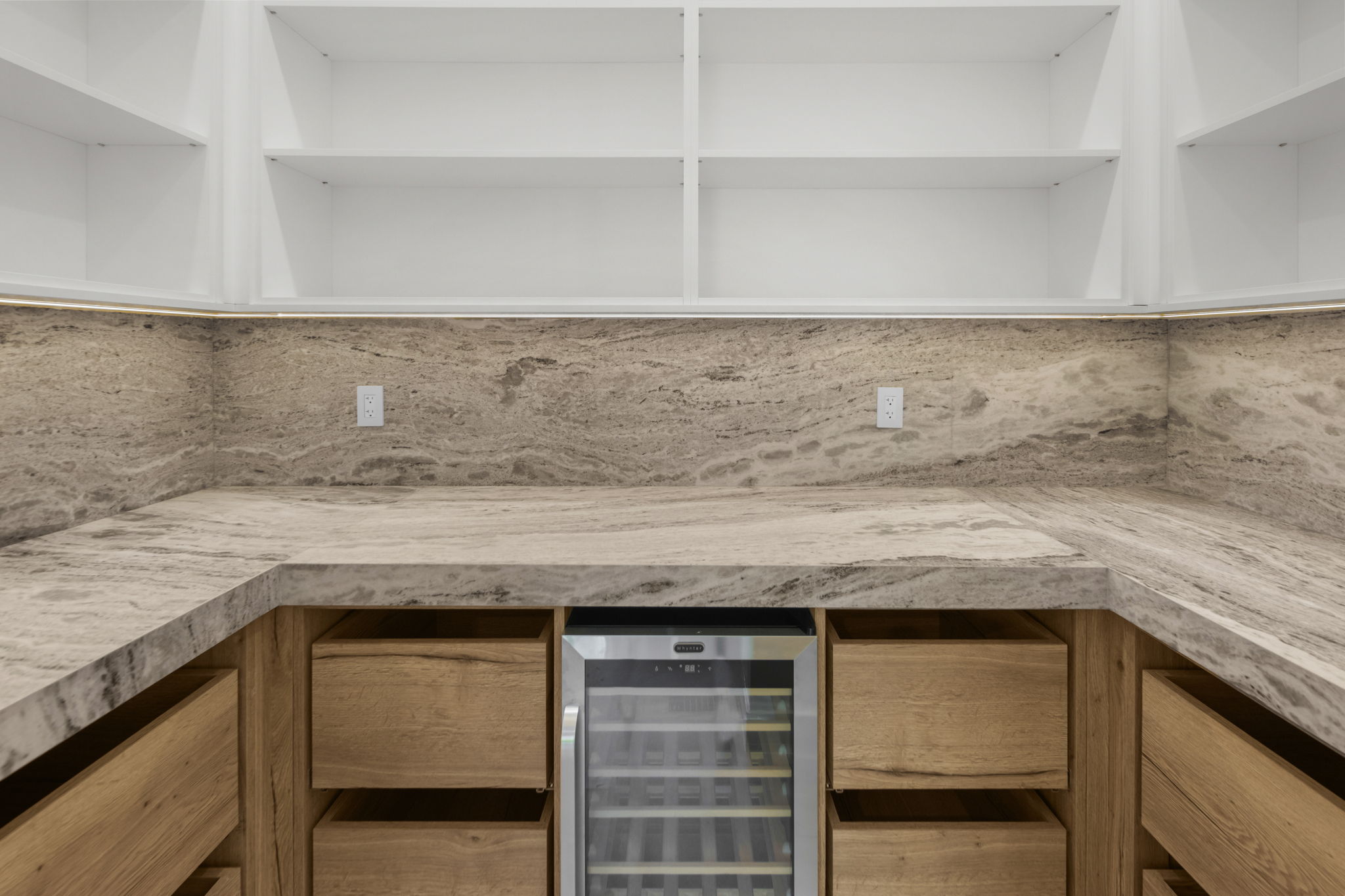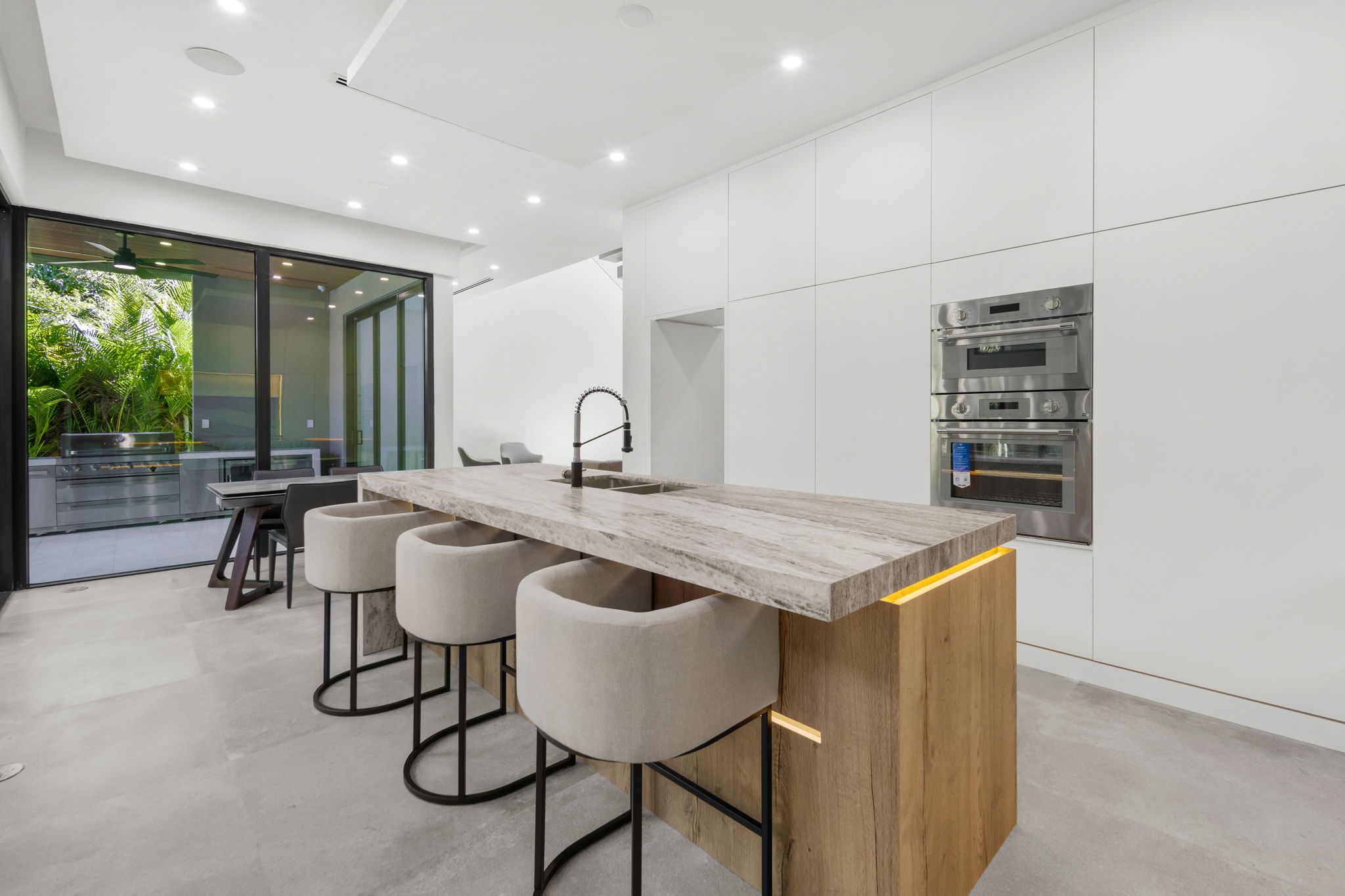 The gourmet kitchen is a highlight, equipped with top-of-the-line appliances, a generous oversized pantry, and beautiful stone countertops complemented by sleek cabinetry. Each bedroom offers custom built-out closets and en-suite bathrooms that underline the attention to detail throughout the residence. The emphasis on high-end finishes and accent lighting creates an inviting yet refined ambiance.