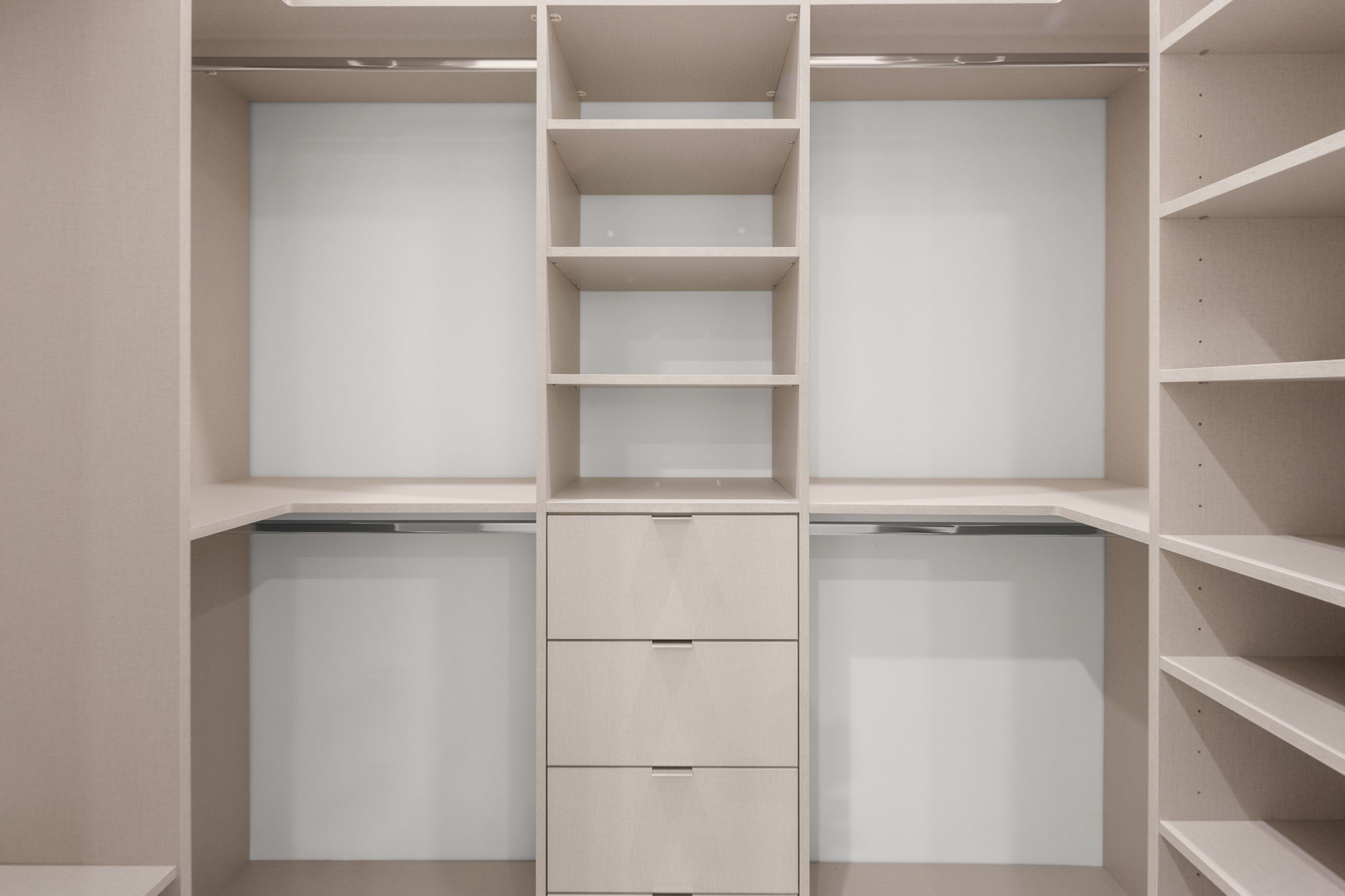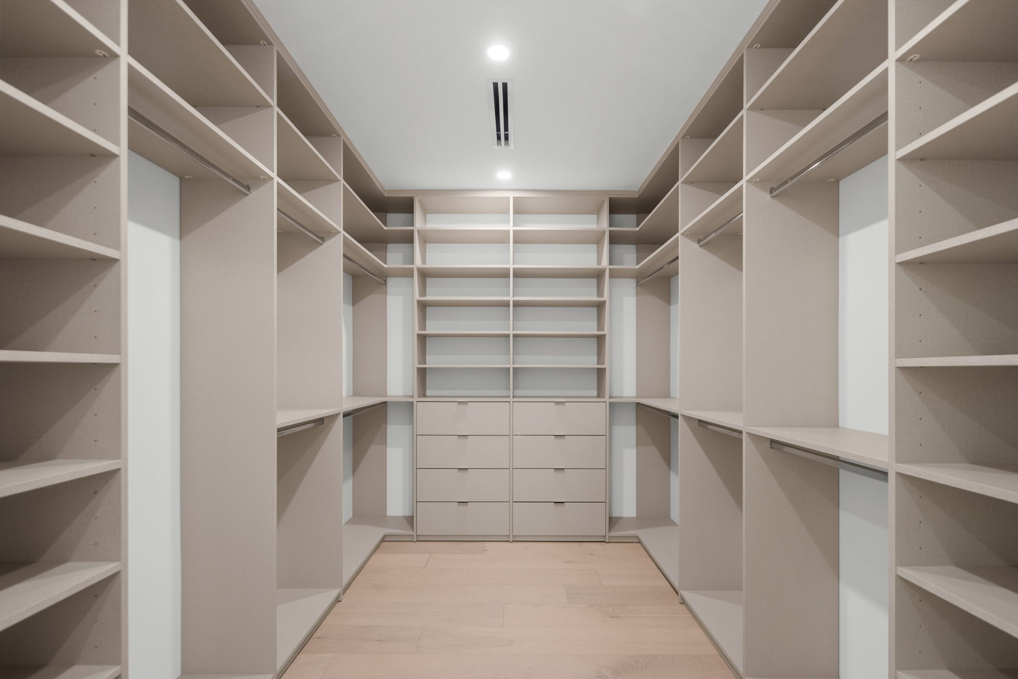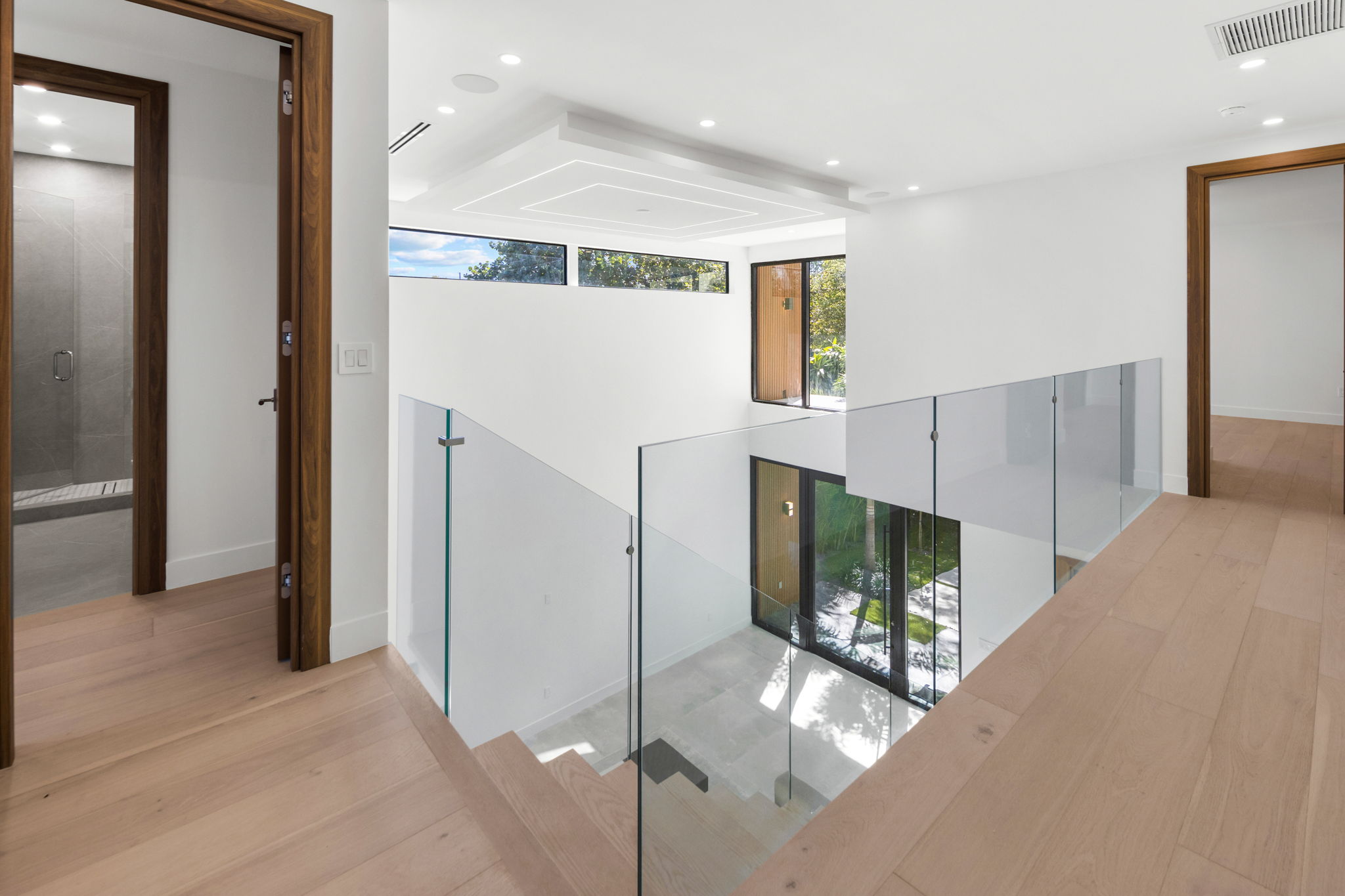 The gourmet kitchen is a highlight, equipped with top-of-the-line appliances, a generous oversized pantry, and beautiful stone countertops complemented by sleek cabinetry. Each bedroom offers custom built-out closets and en-suite bathrooms that underline the attention to detail throughout the residence. The emphasis on high-end finishes and accent lighting creates an inviting yet refined ambiance.