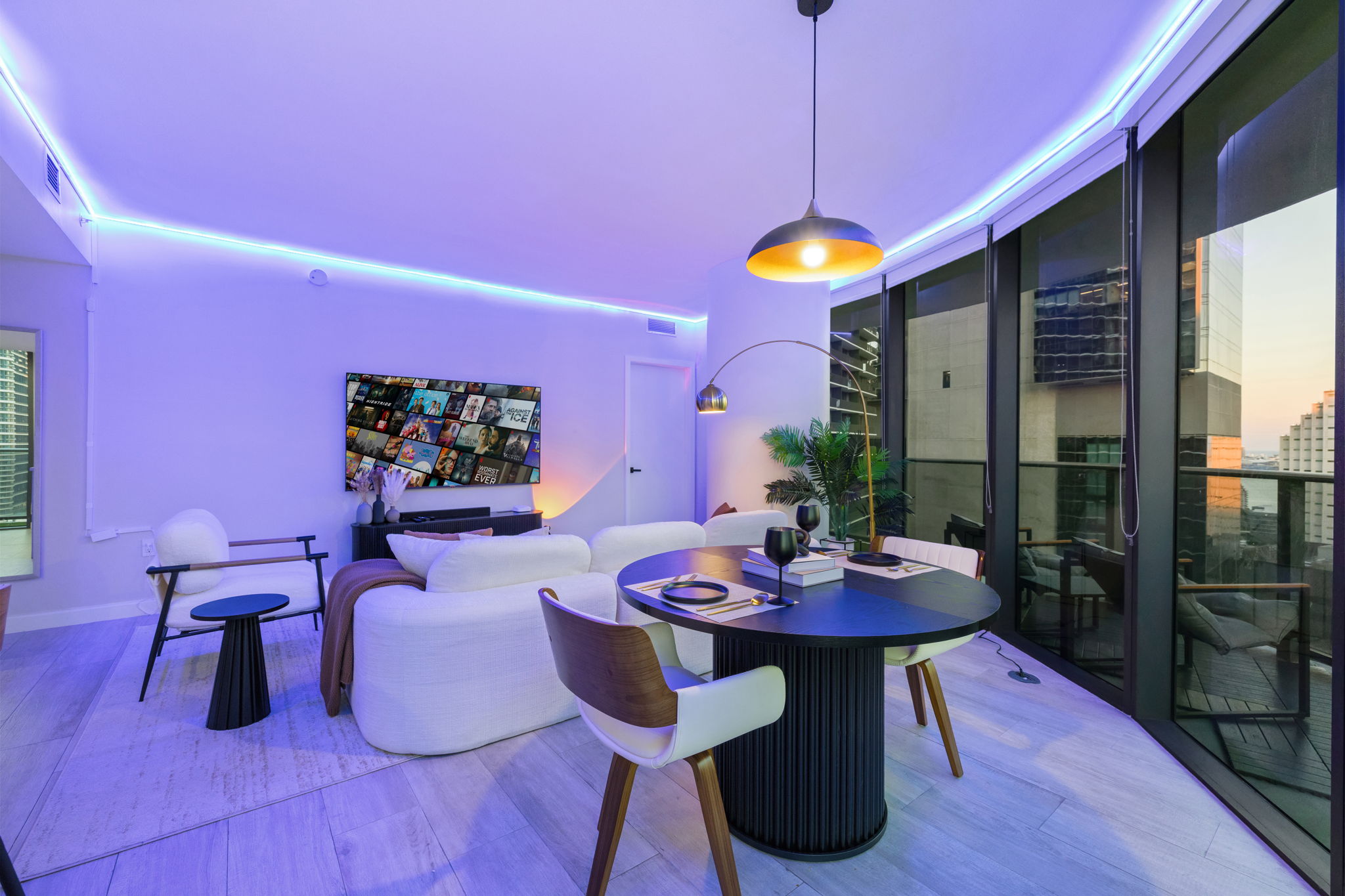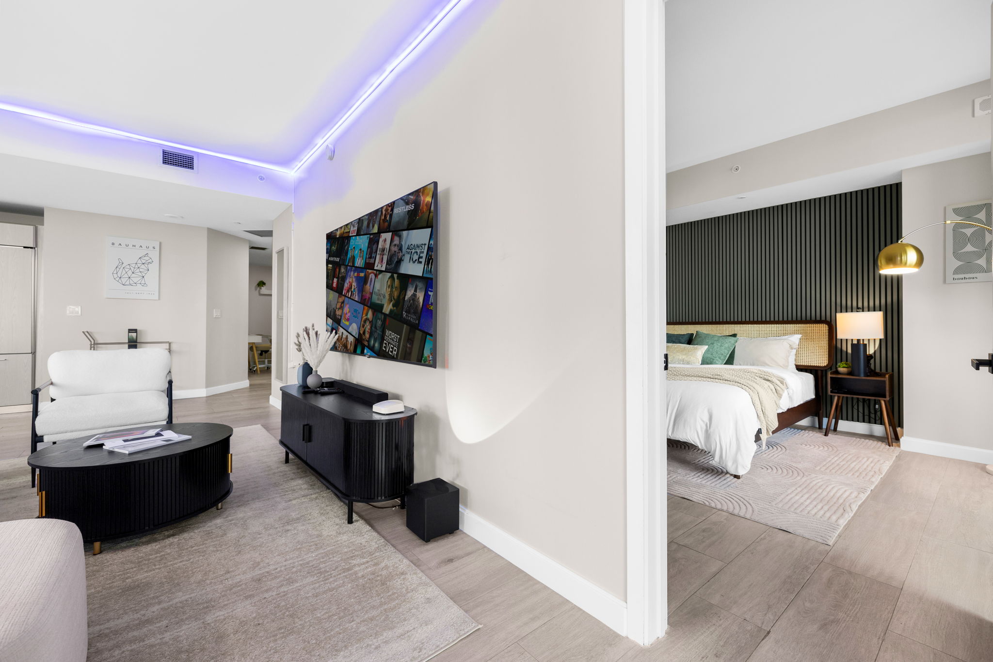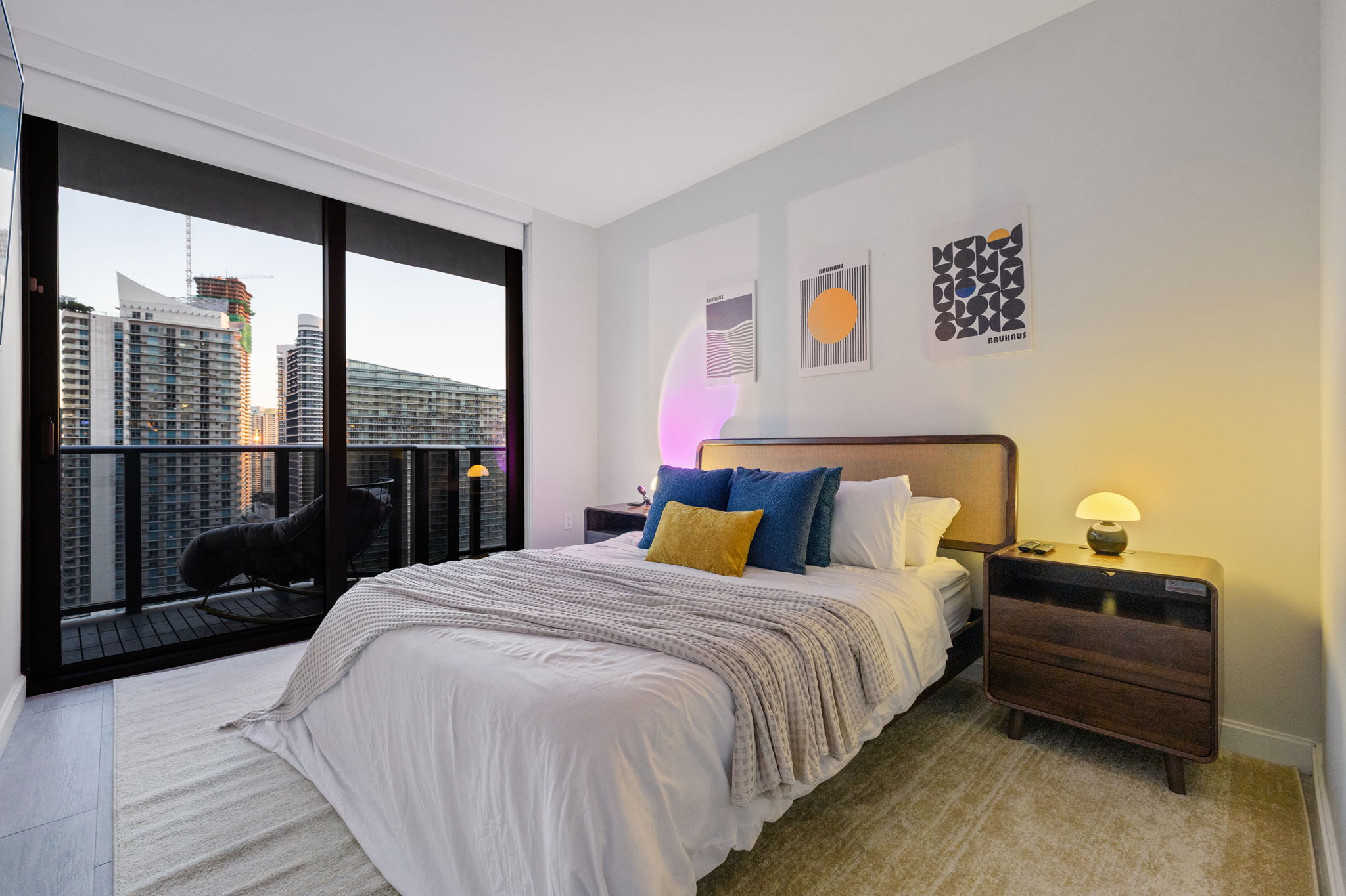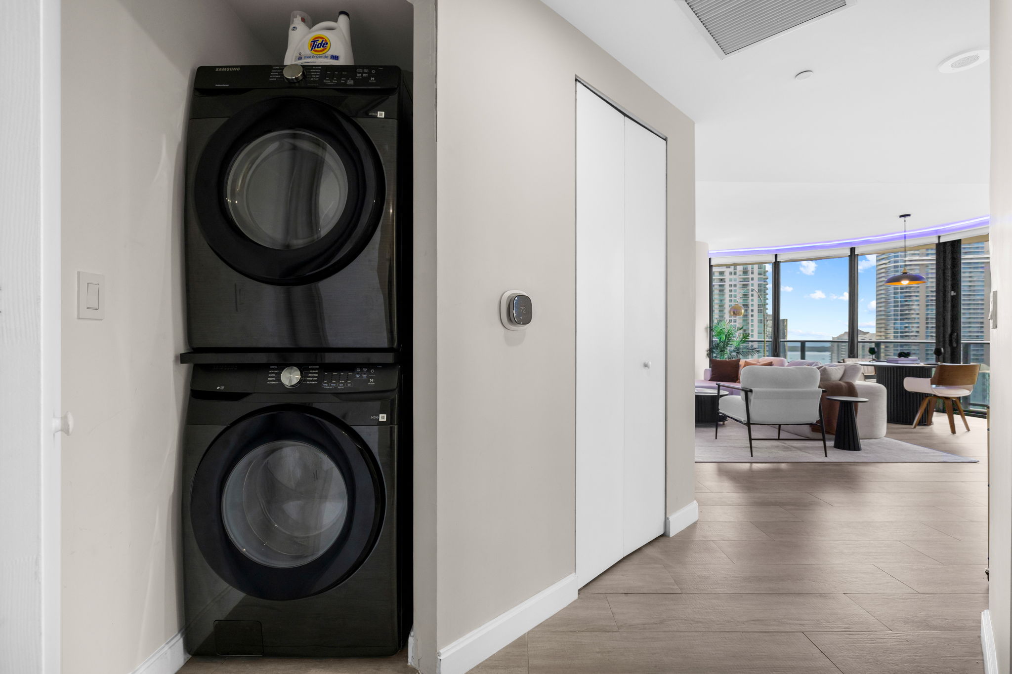 The unit has been recently refreshed, showcasing designer furniture and custom lighting that enhance the contemporary aesthetic. Natural light flows in from the southeast exposure, providing stunning views of the bay and skyline while minimizing afternoon heat. High-end appliances and luxury finishes complete this well-appointed living space, ensuring comfort and style.