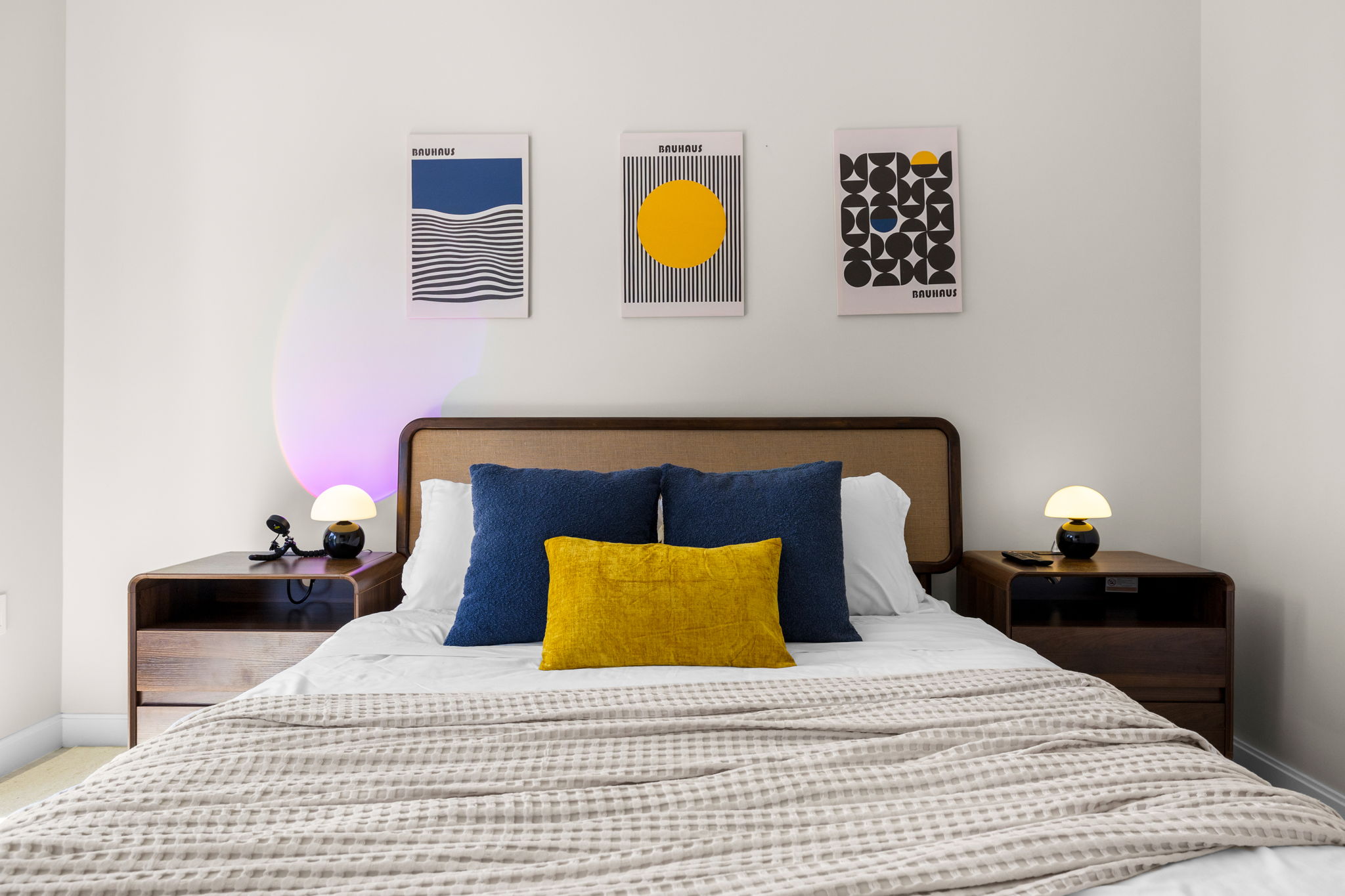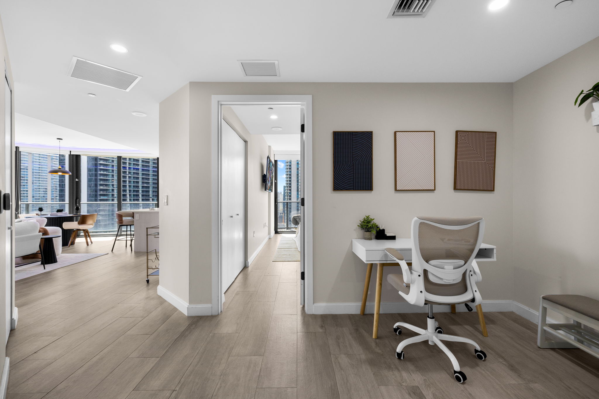 This high-floor residence offers a thoughtful split floor plan, featuring two bedrooms and a den, along with two-and-a-half bathrooms. Each bedroom includes en-suite bathrooms and balcony access, creating a sense of privacy and comfort. The den is aptly designed as a workspace, providing a convenient area for remote work or study. With a total of 1,121 square feet, the layout maximizes both space and functionality.