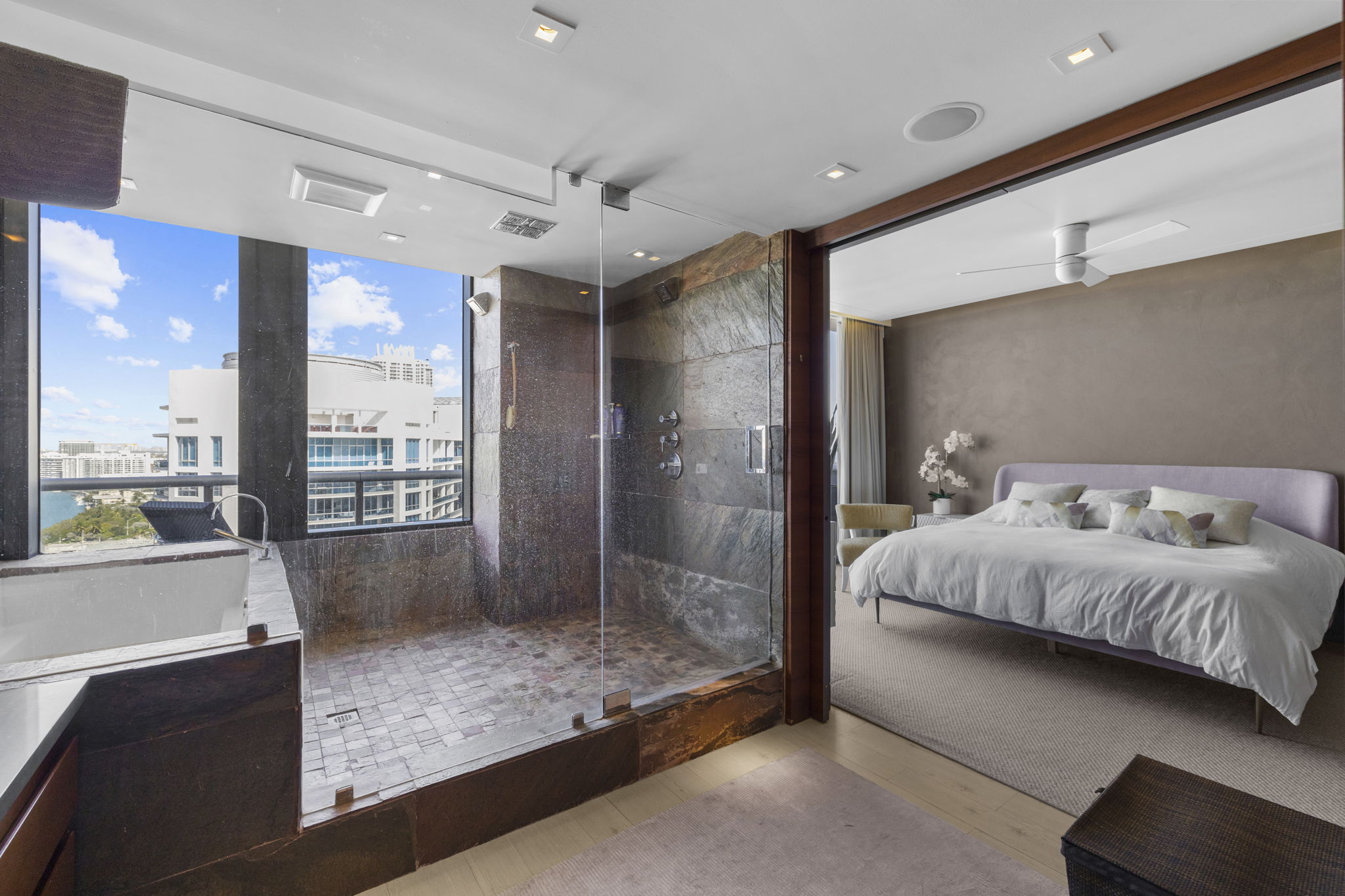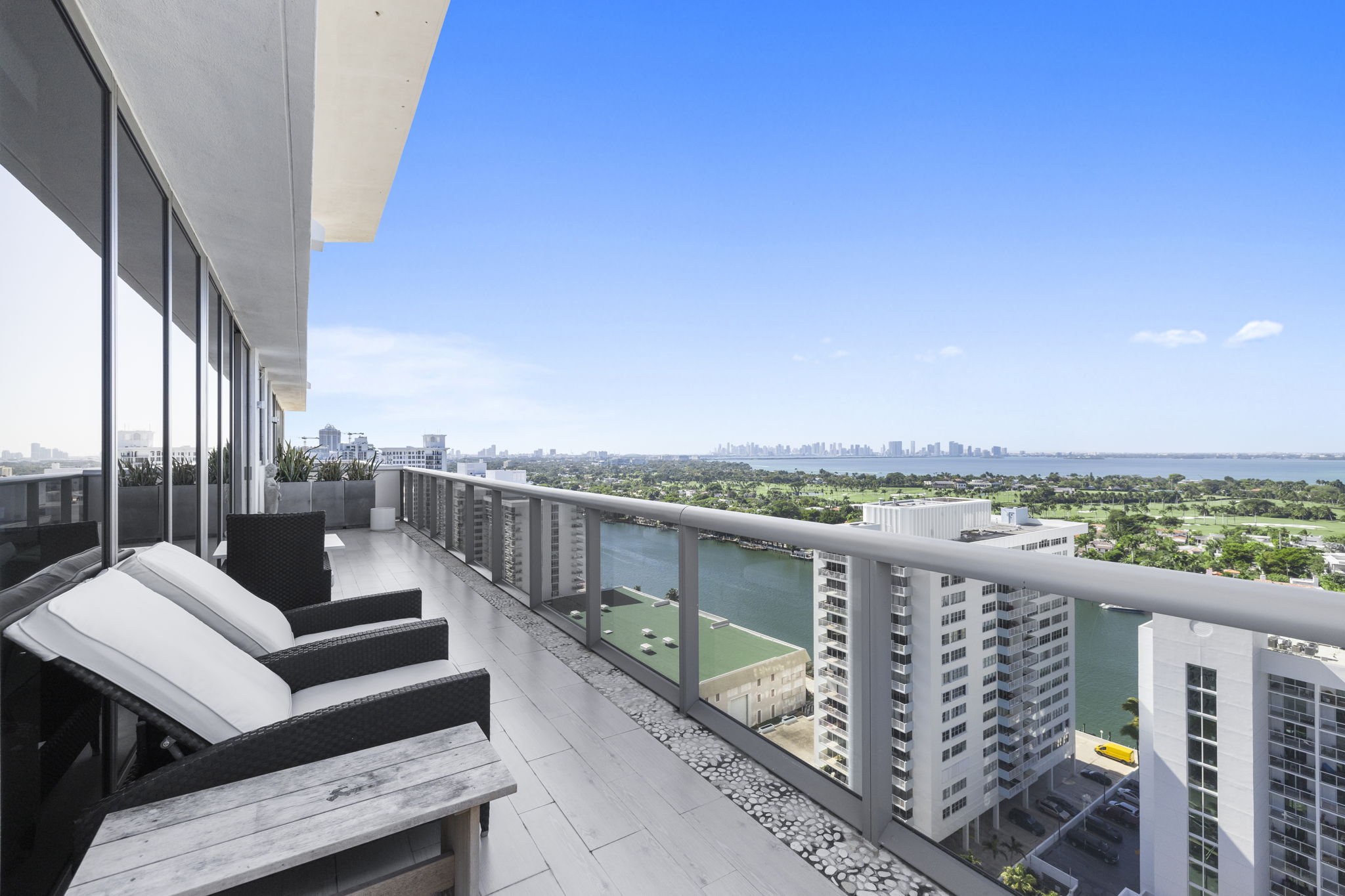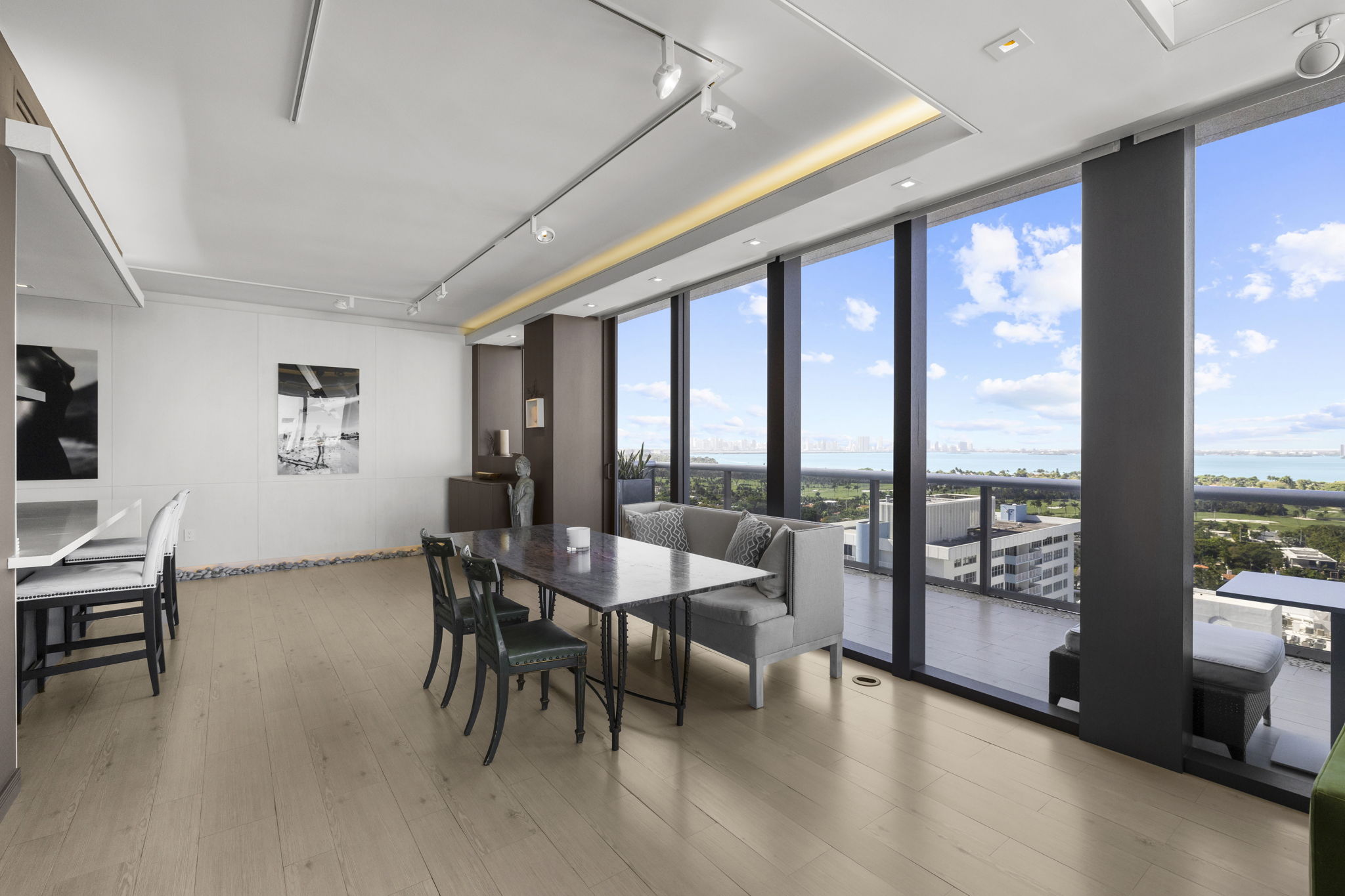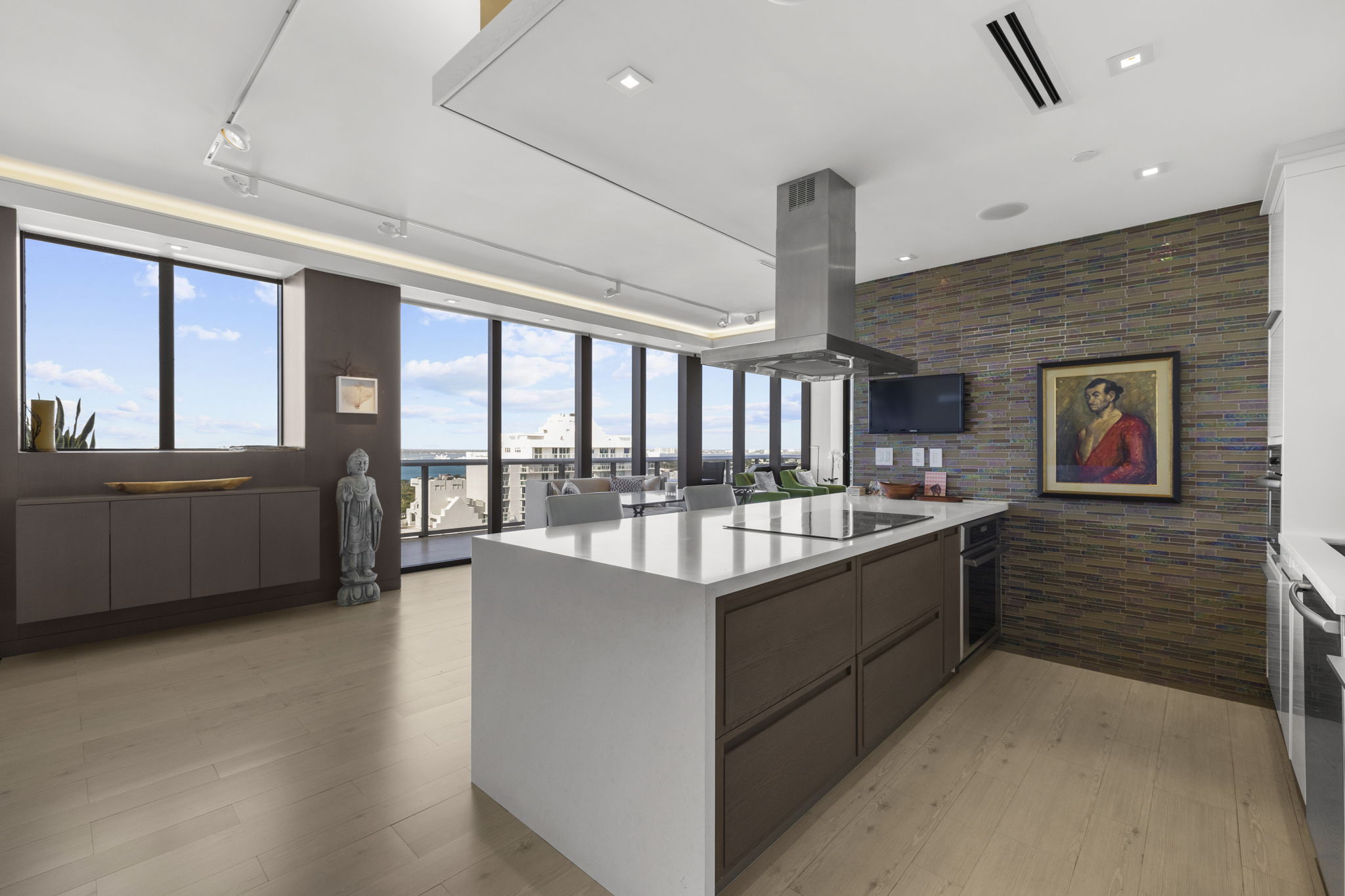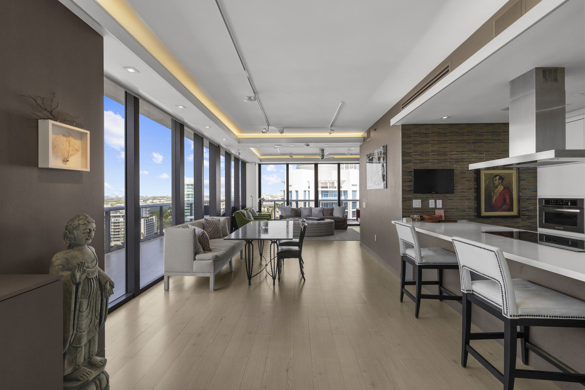 An expansive 918-square-foot wraparound terrace enhances the living space, providing an inviting area for sunbathing, hosting gatherings, and savoring the stunning sunsets overlooking the downtown Miami skyline. The seamless indoor-outdoor flow ensures that you can enjoy the beautiful coastal climate year-round.