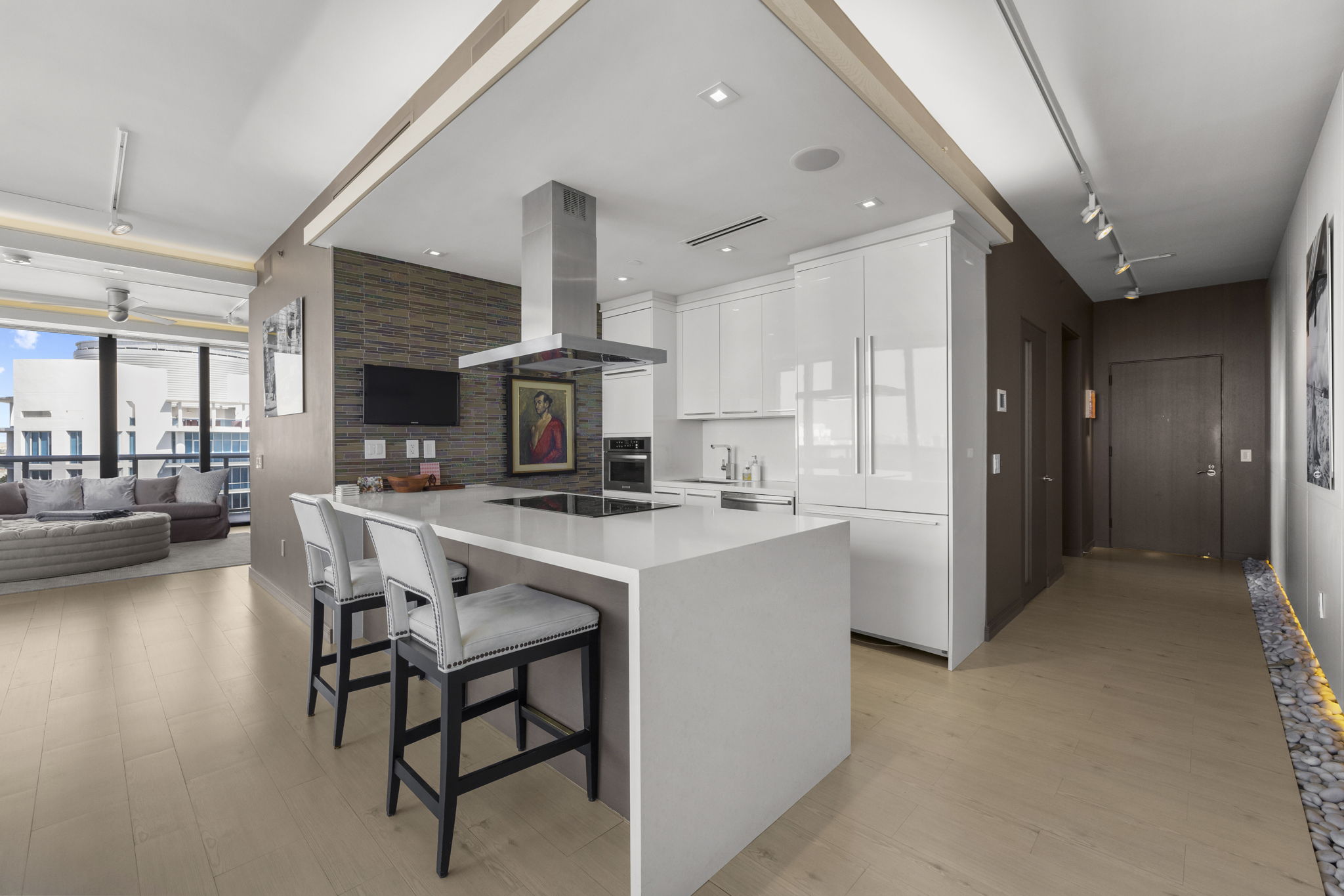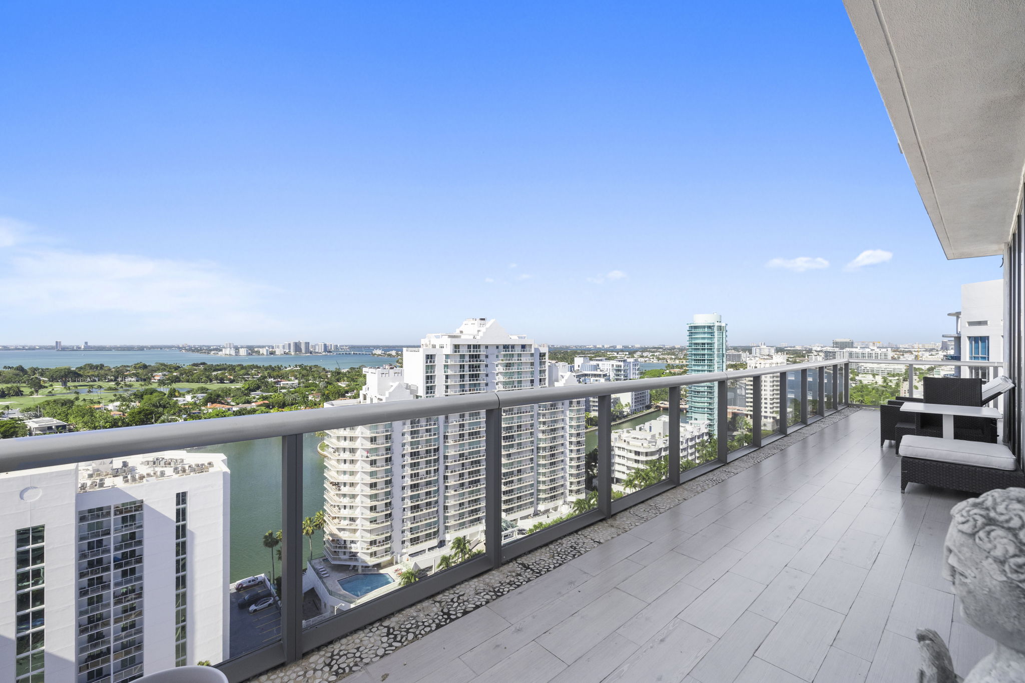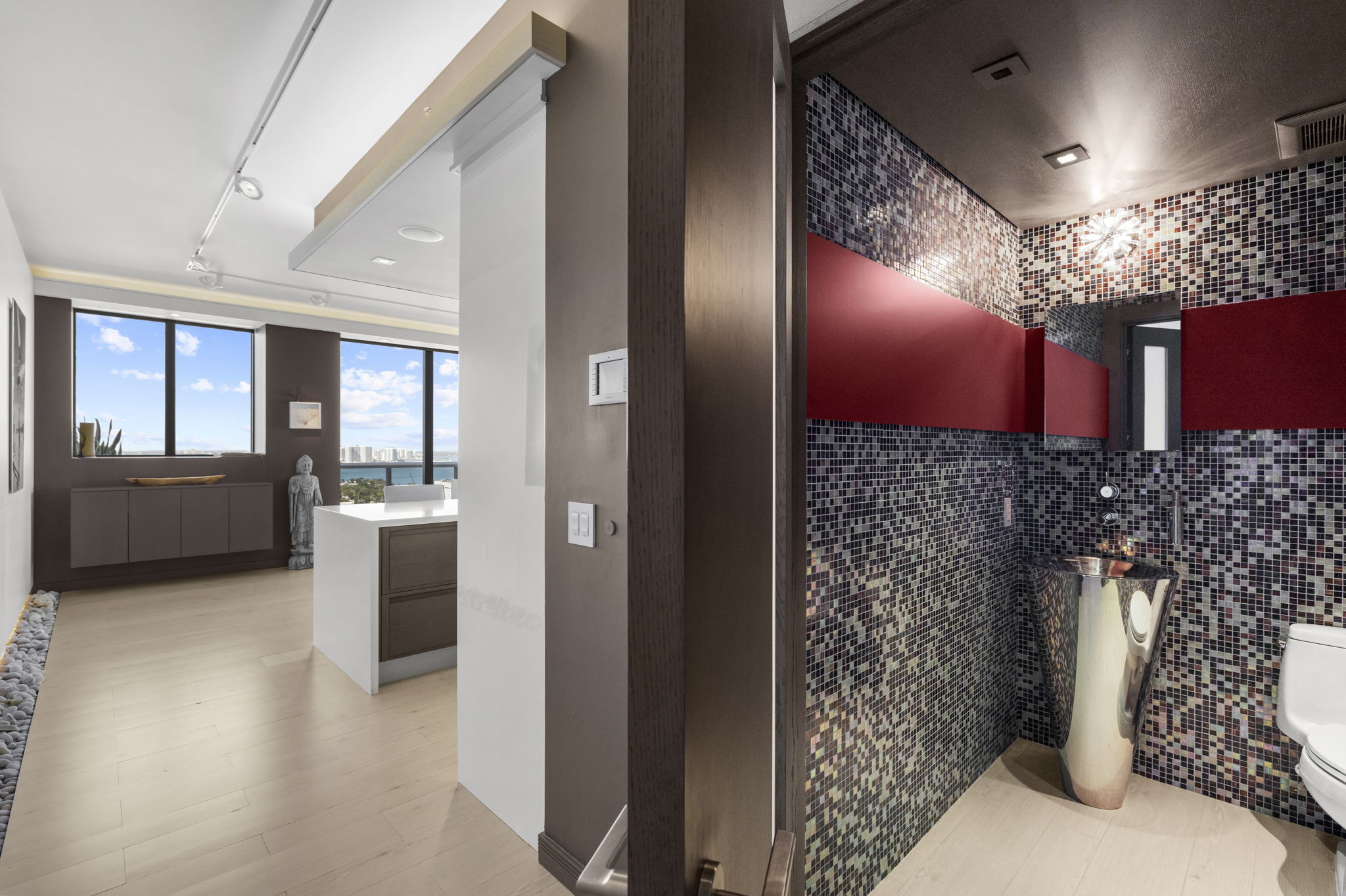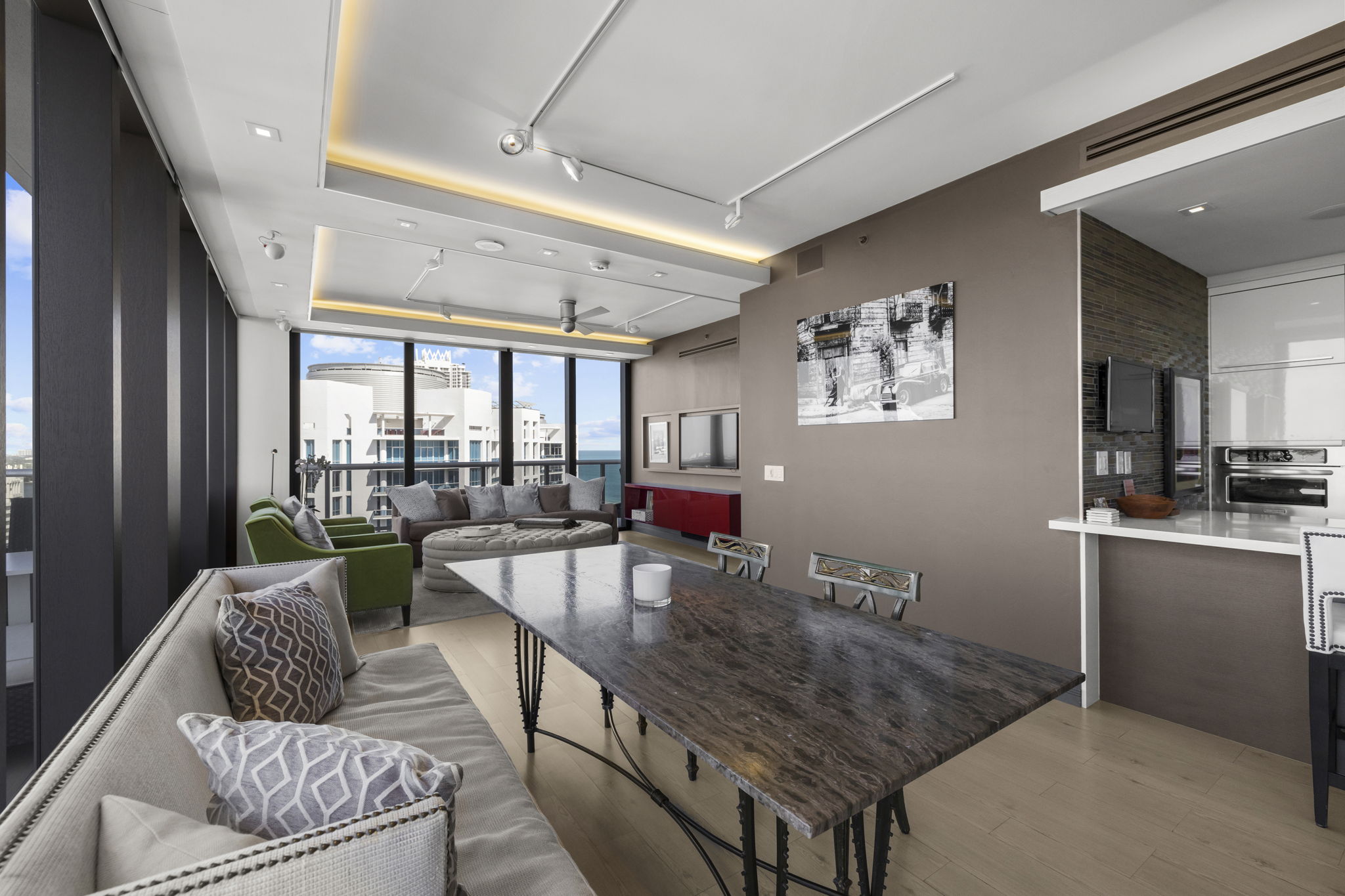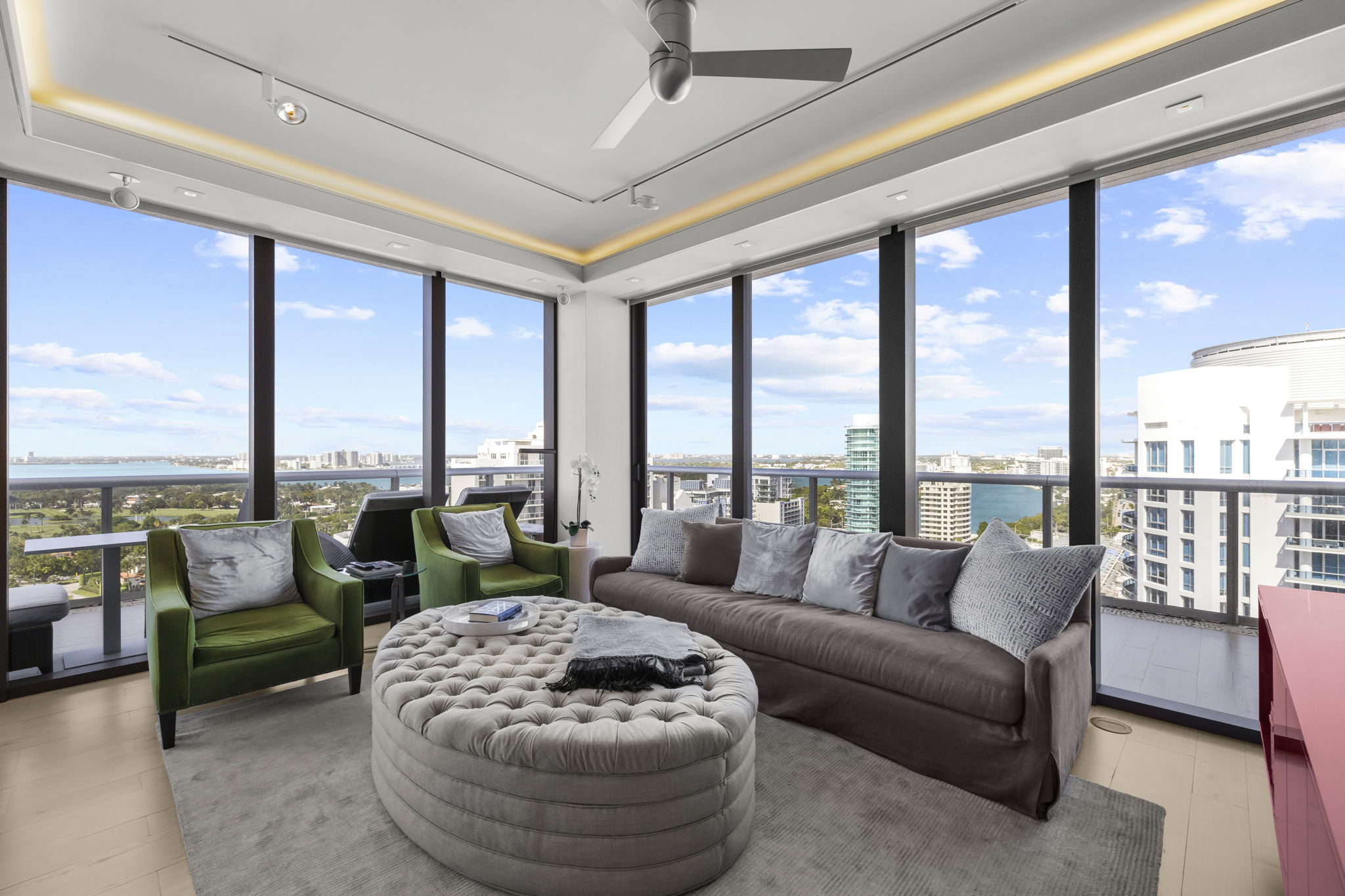 An expansive 918-square-foot wraparound terrace enhances the living space, providing an inviting area for sunbathing, hosting gatherings, and savoring the stunning sunsets overlooking the downtown Miami skyline. The seamless indoor-outdoor flow ensures that you can enjoy the beautiful coastal climate year-round.