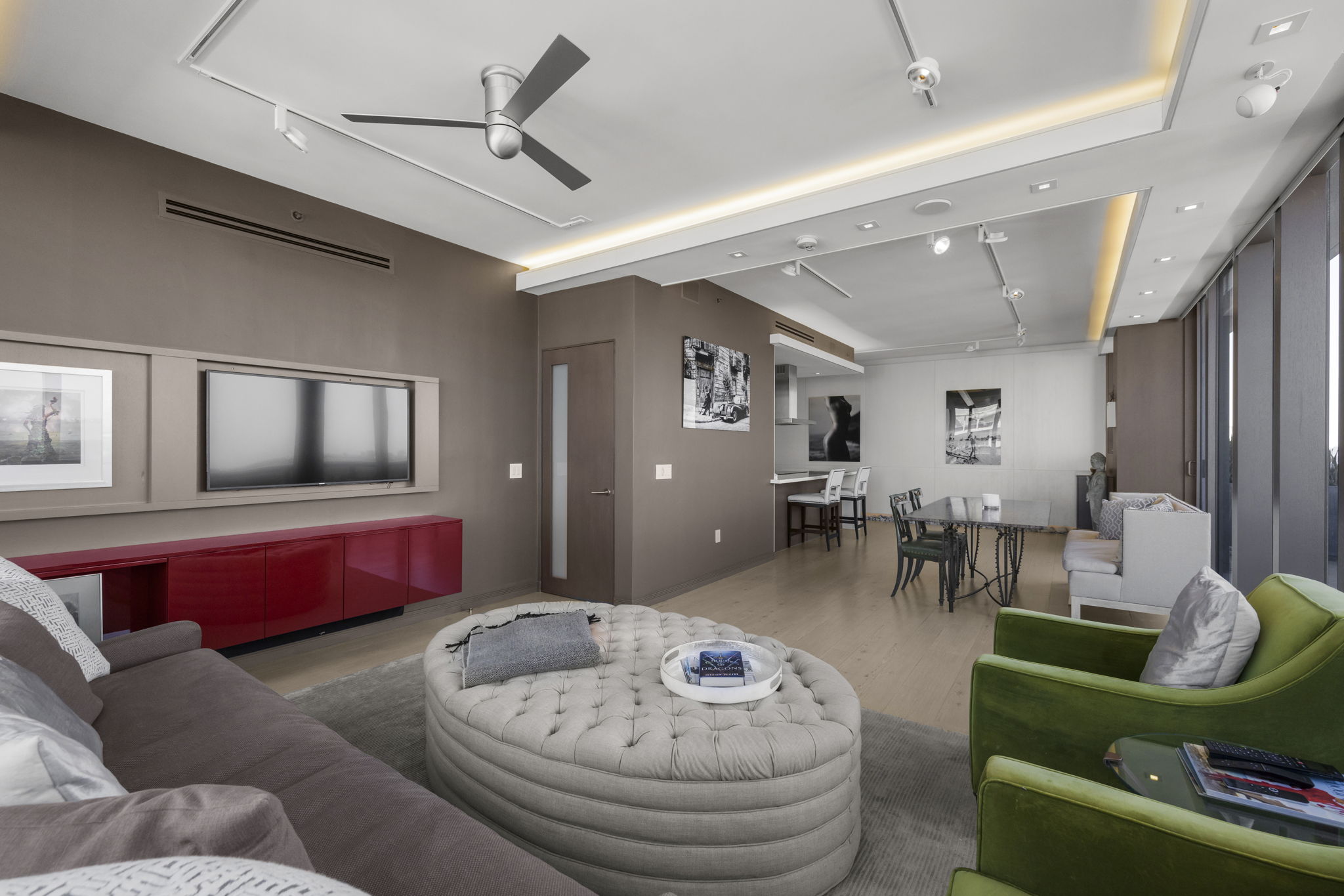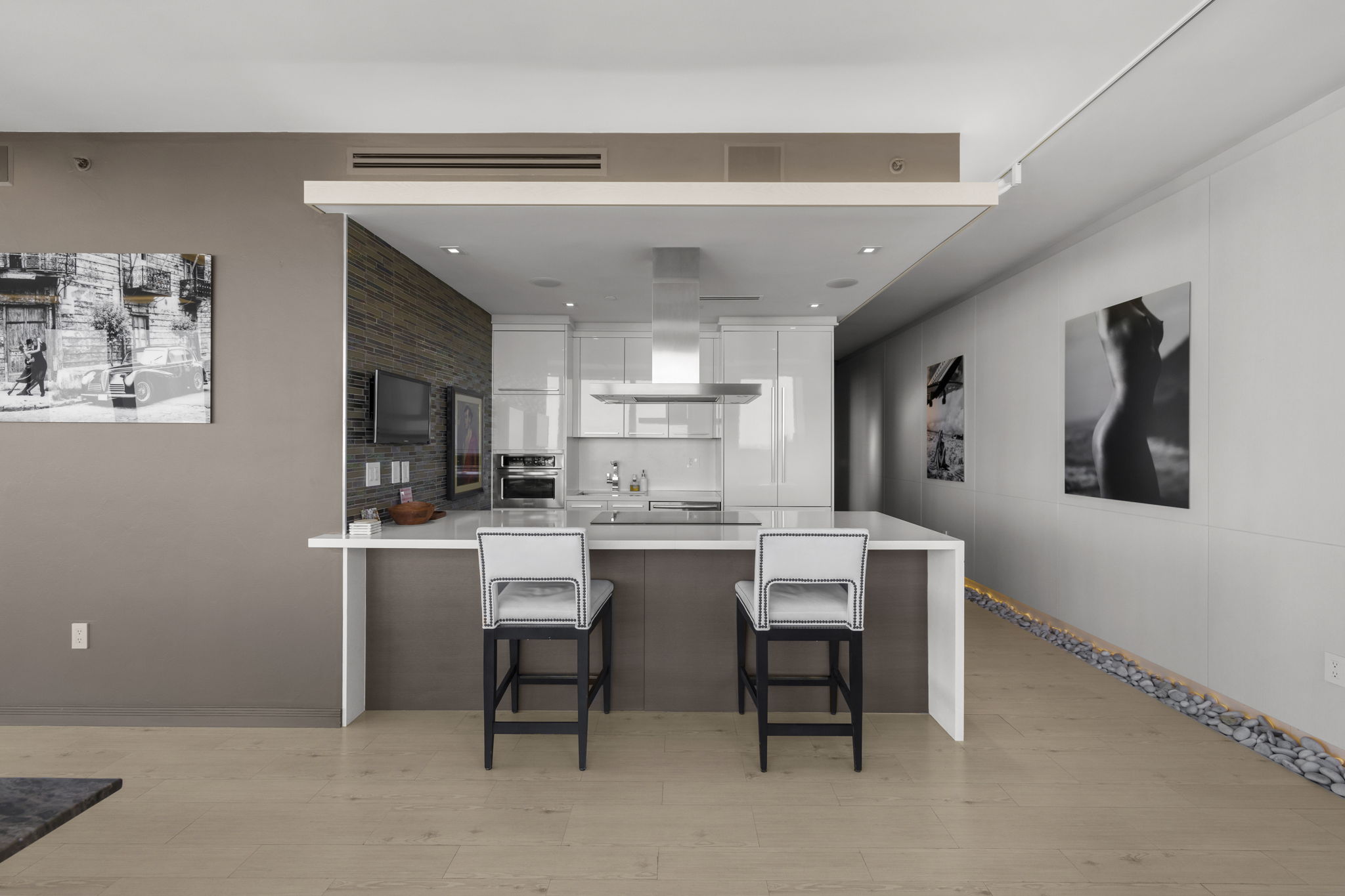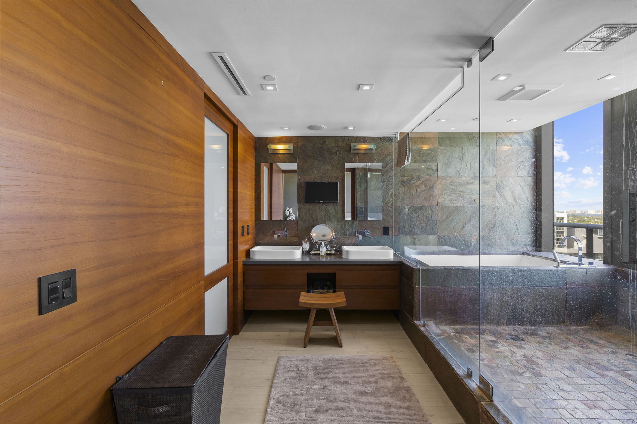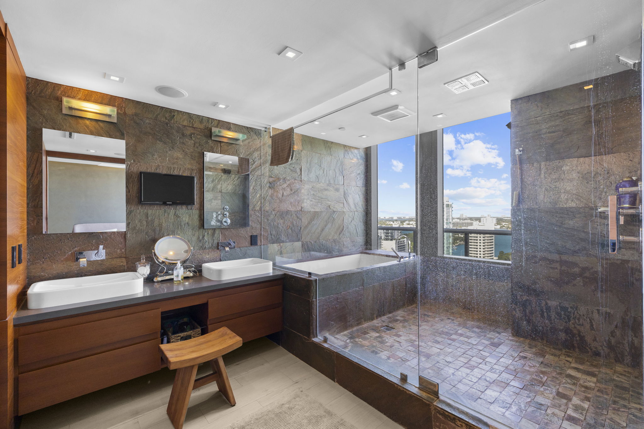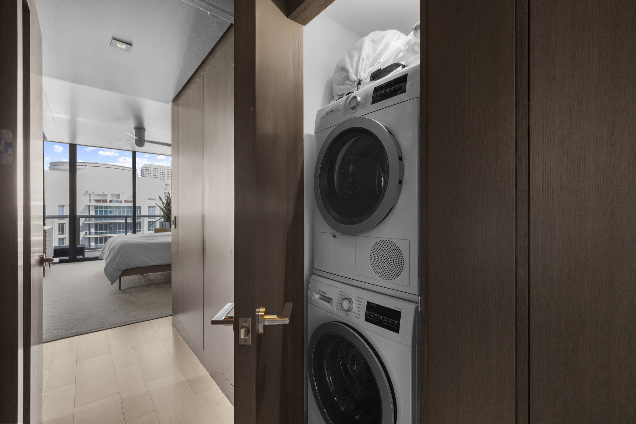 An expansive 918-square-foot wraparound terrace enhances the living space, providing an inviting area for sunbathing, hosting gatherings, and savoring the stunning sunsets overlooking the downtown Miami skyline. The seamless indoor-outdoor flow ensures that you can enjoy the beautiful coastal climate year-round.