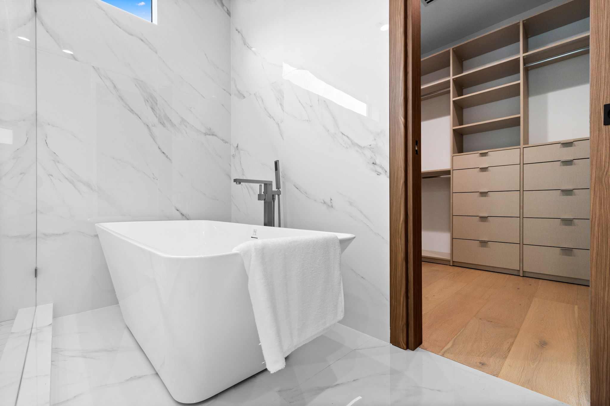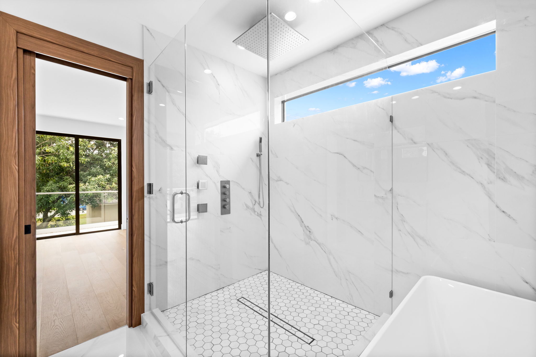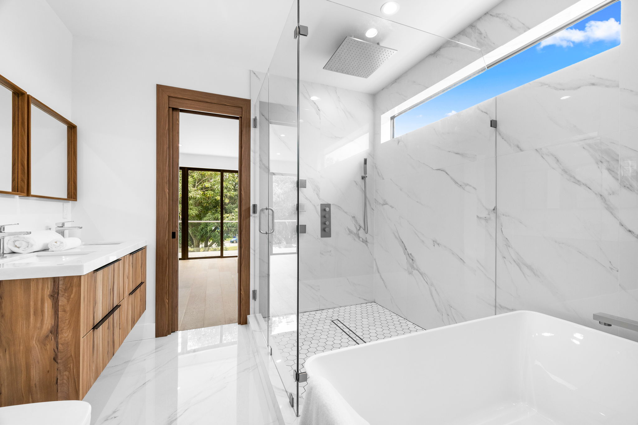 The layout seamlessly transitions into a beautifully landscaped backyard, ideal for outdoor entertaining and relaxation. The outdoor area boasts a high-end summer kitchen and an outdoor shower, enhancing the experience of al fresco living. Inside, high-quality stonework and custom cabinetry showcase meticulous craftsmanship that complements the modern aesthetic.