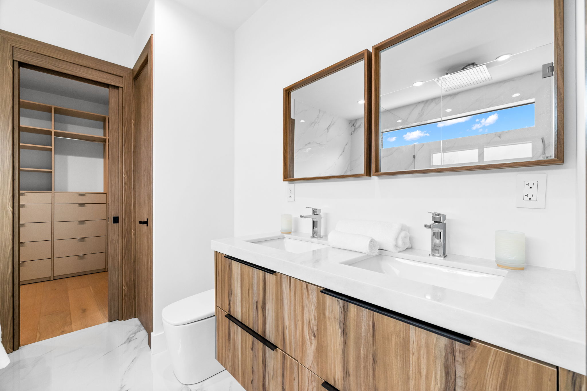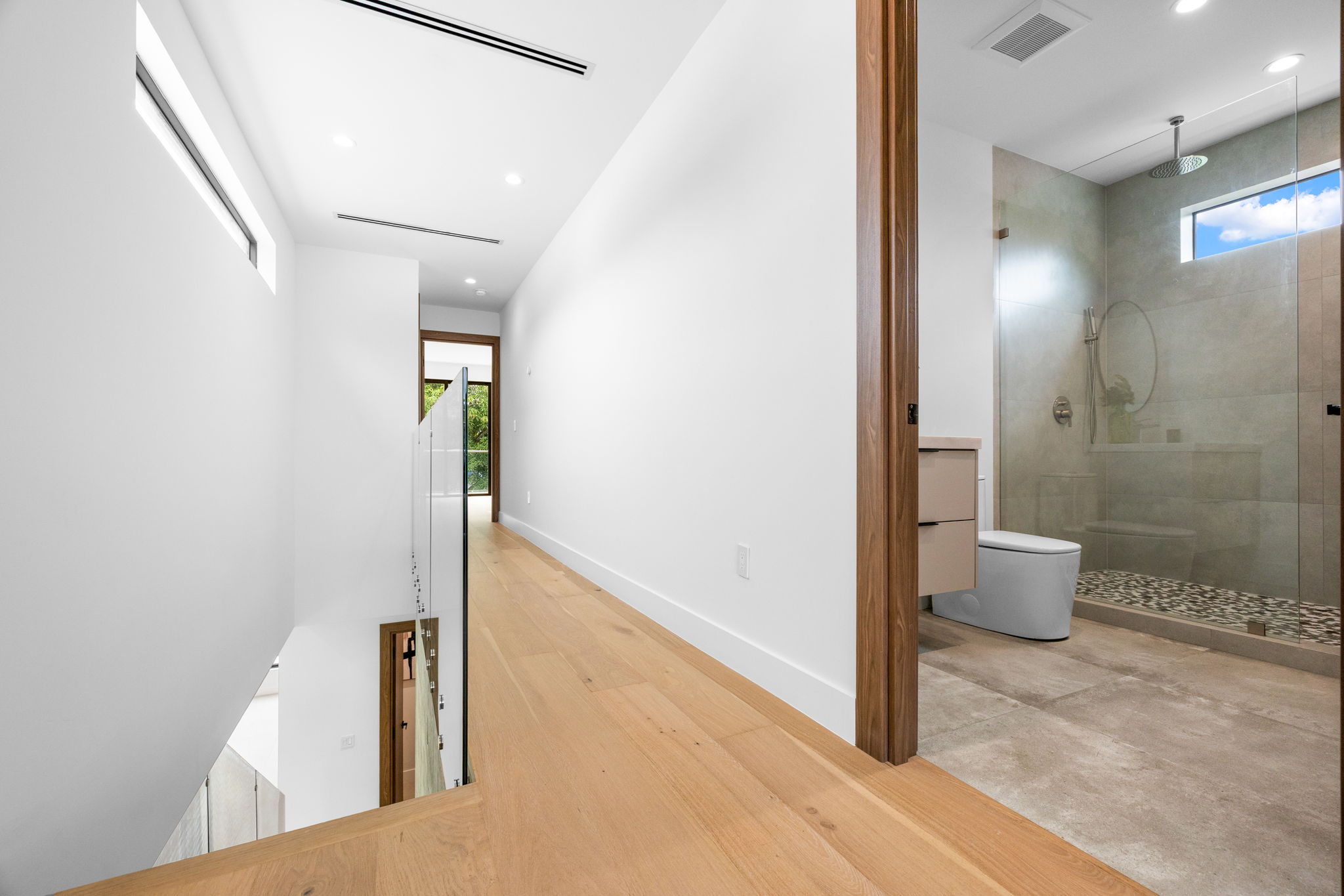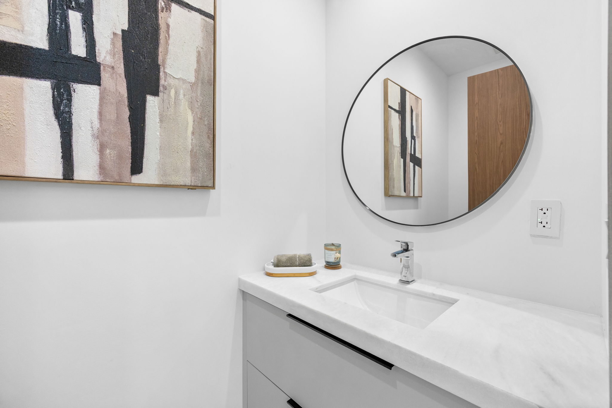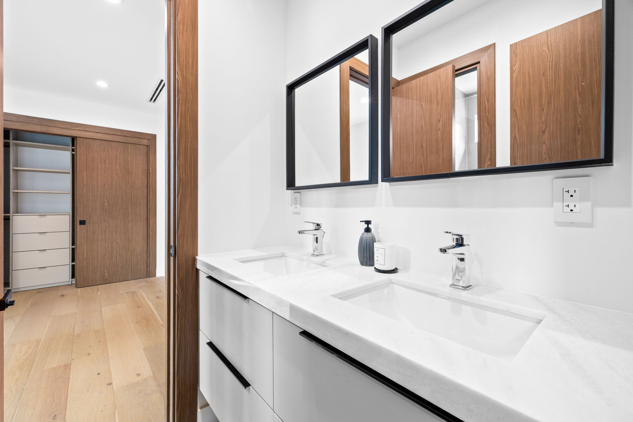 The layout seamlessly transitions into a beautifully landscaped backyard, ideal for outdoor entertaining and relaxation. The outdoor area boasts a high-end summer kitchen and an outdoor shower, enhancing the experience of al fresco living. Inside, high-quality stonework and custom cabinetry showcase meticulous craftsmanship that complements the modern aesthetic.