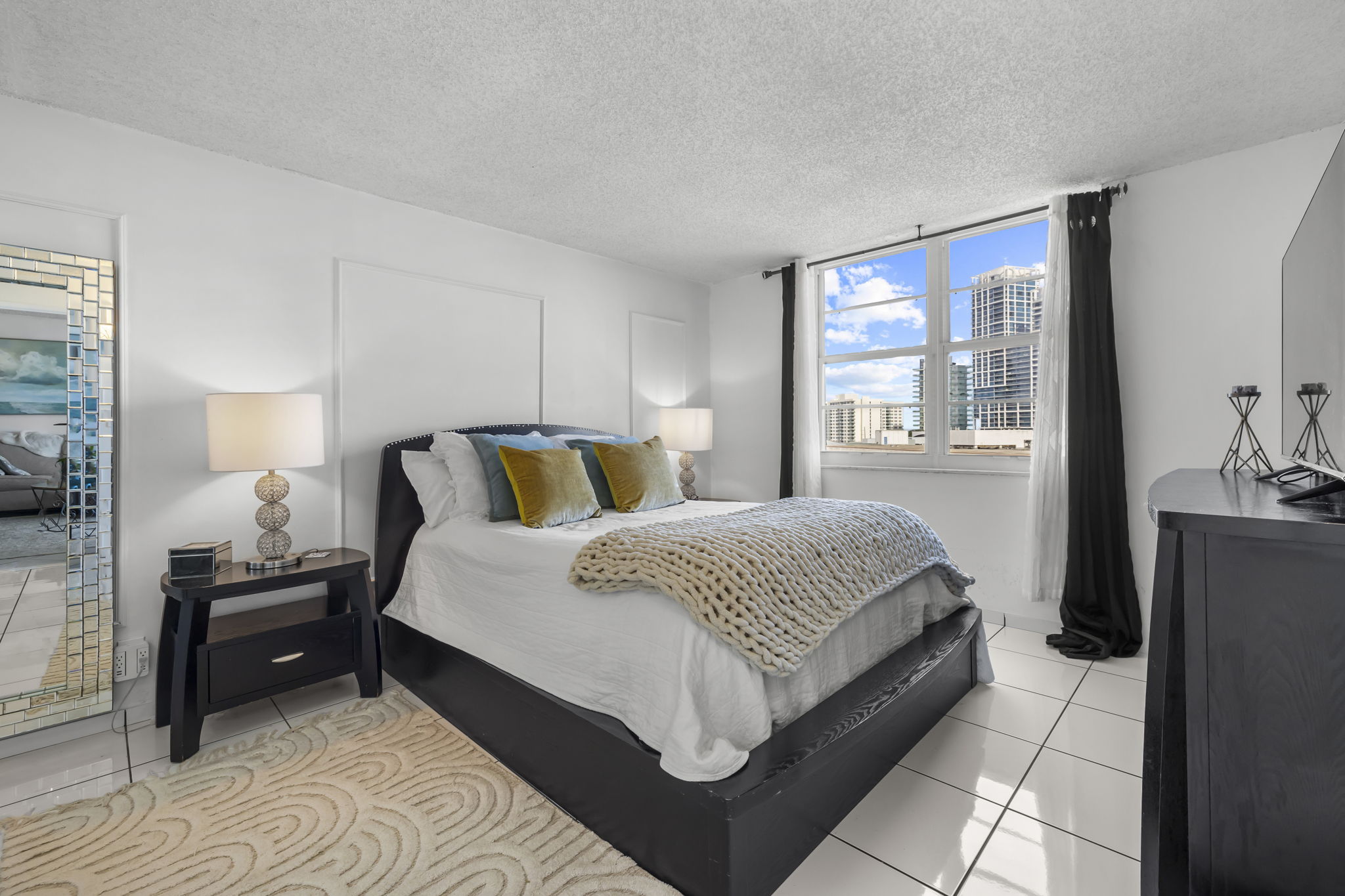 This oversized one-bedroom, two-bath condominium offers a spacious 910 square feet of living space, ideal for both comfort and functionality. Located on a high floor, this unit presents breathtaking views of the ocean and city skyline, enhanced by updated impact windows and sliding glass doors. The well-designed layout features a modern kitchen and bathrooms, along with the convenience of an in-unit washer and dryer.